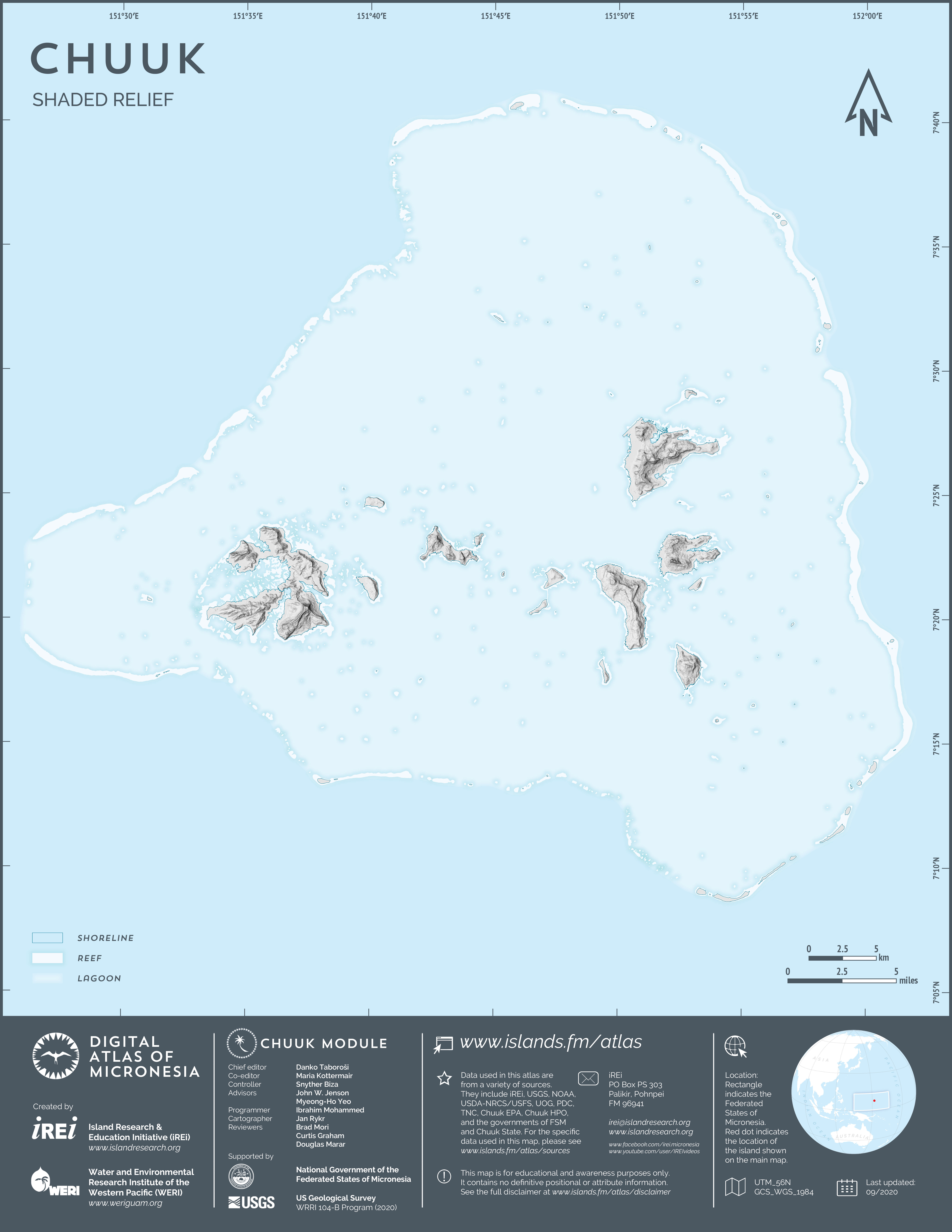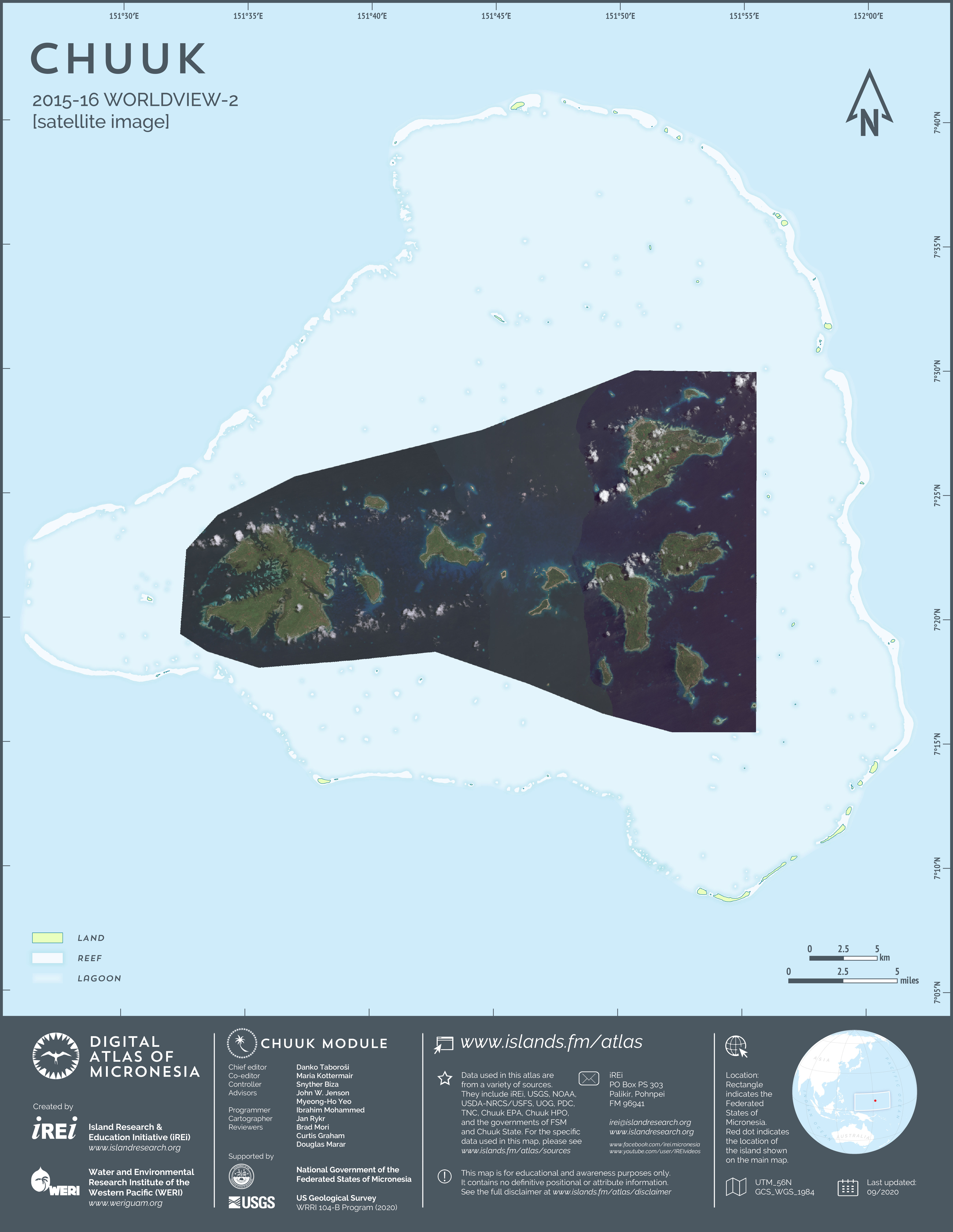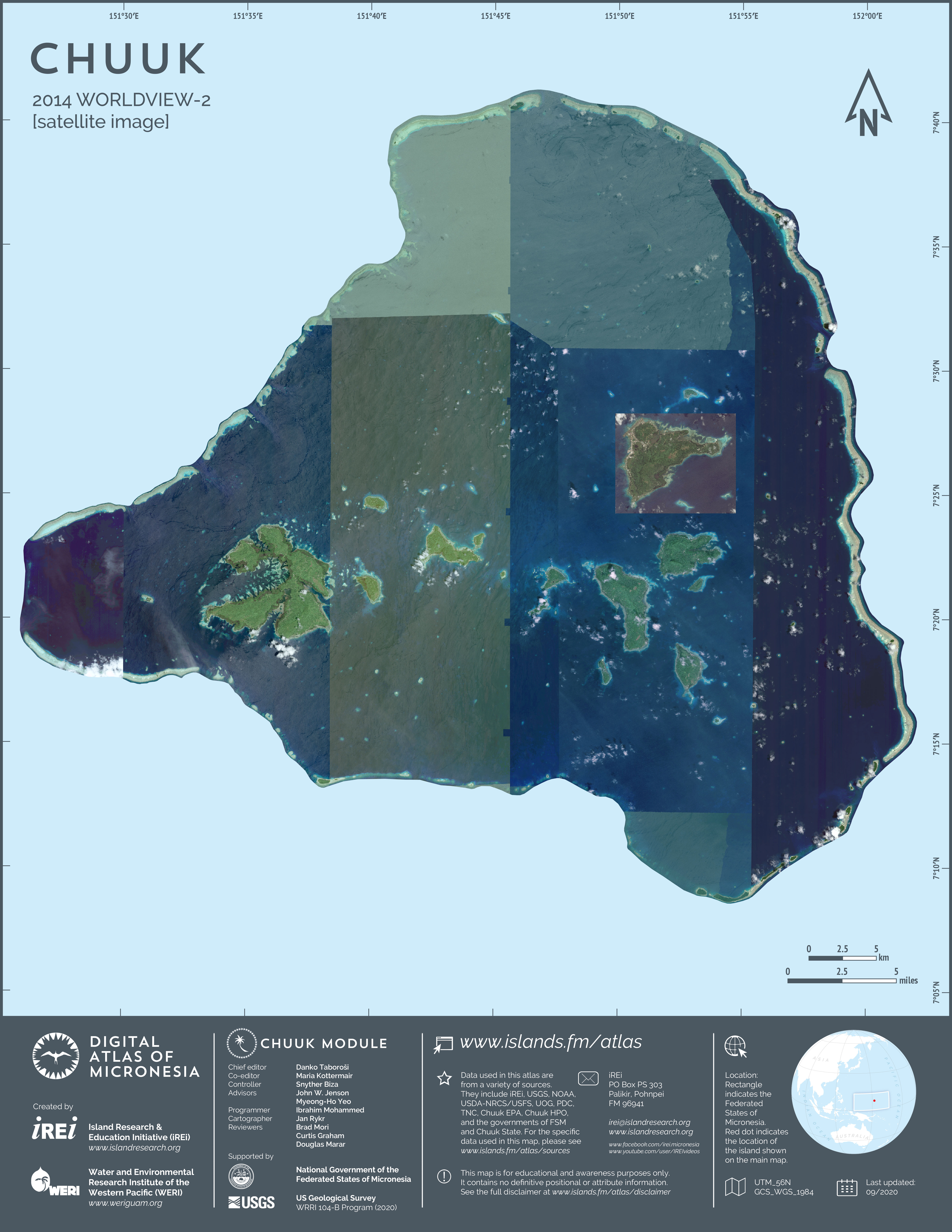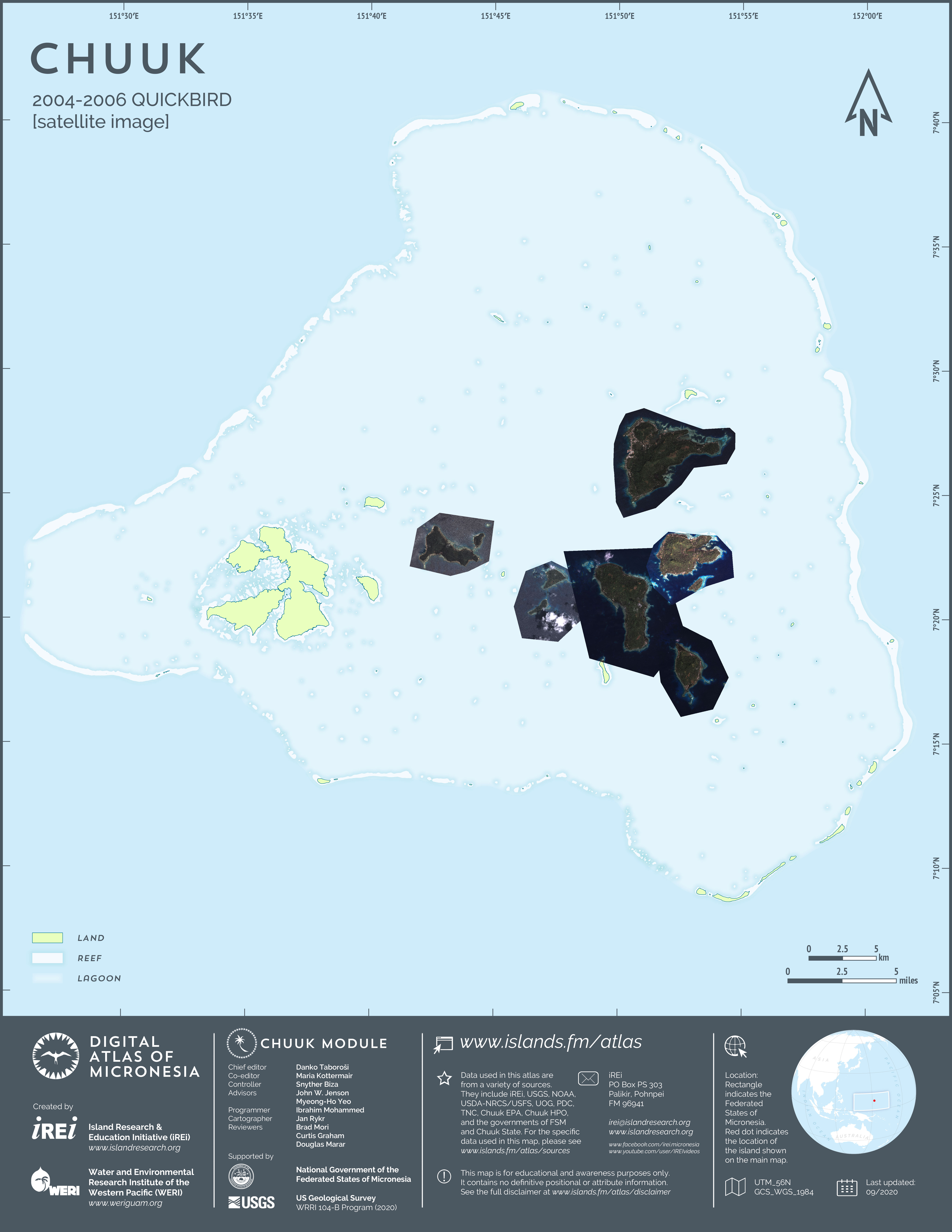 This map showcases 2004-2006 satellite imagery of Chuuk taken by QuickBird satellite by DigitalGlobe. The data were purchased and processed by U.S. Department of Agriculture (USDA) – Natural Resources Conservation Service (NRCS). The image shown here is in natural color. Image portions that fall outside the barrier reef of Chuuk are omitted from the map.