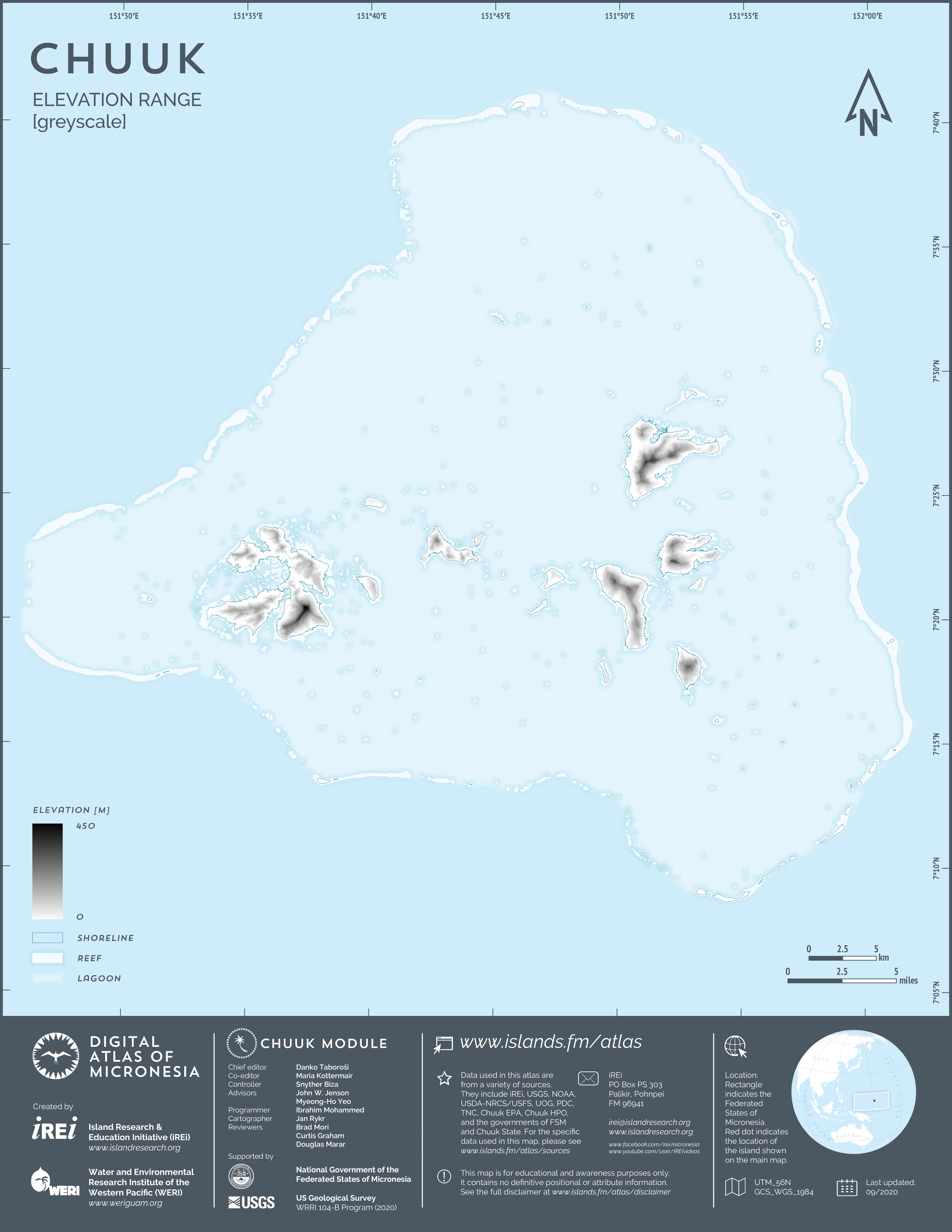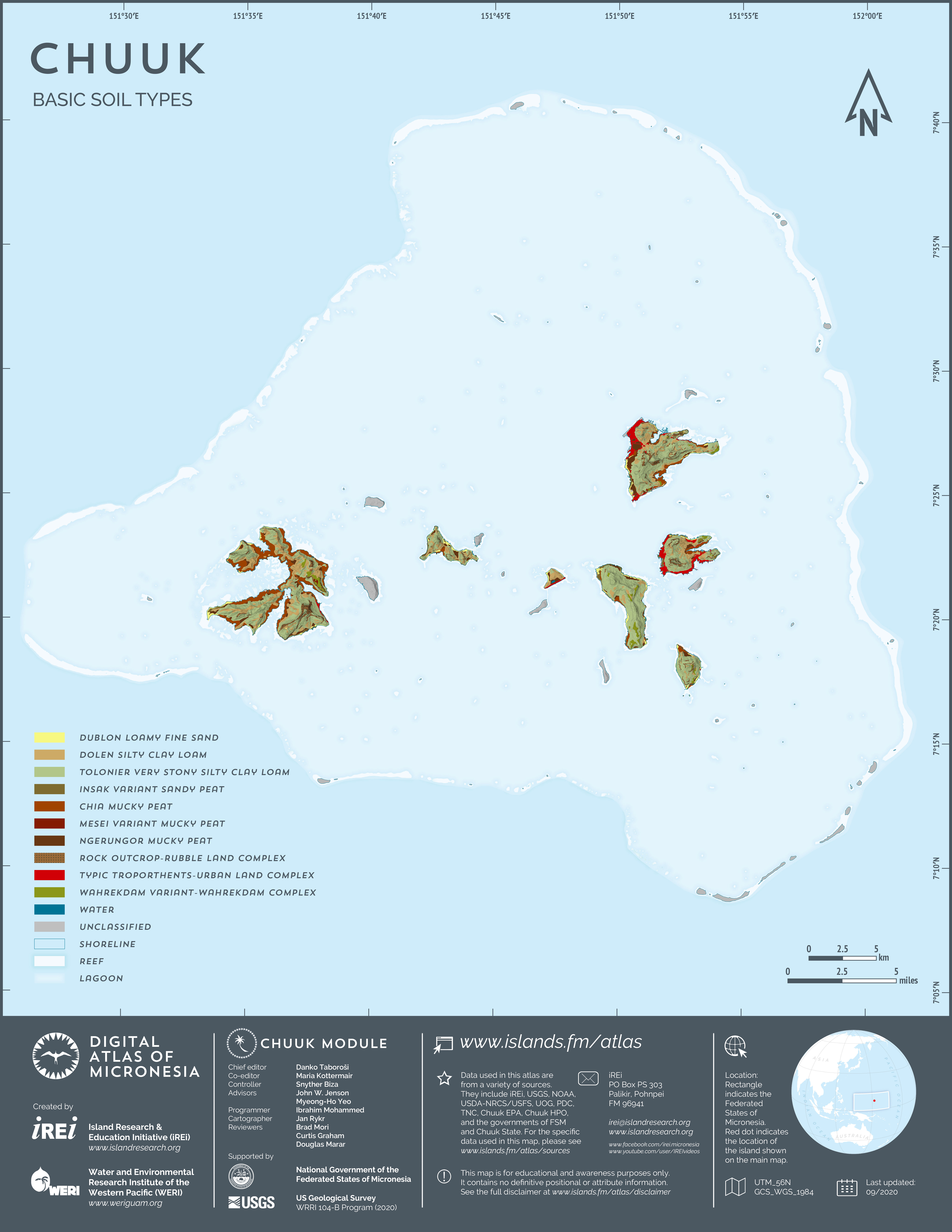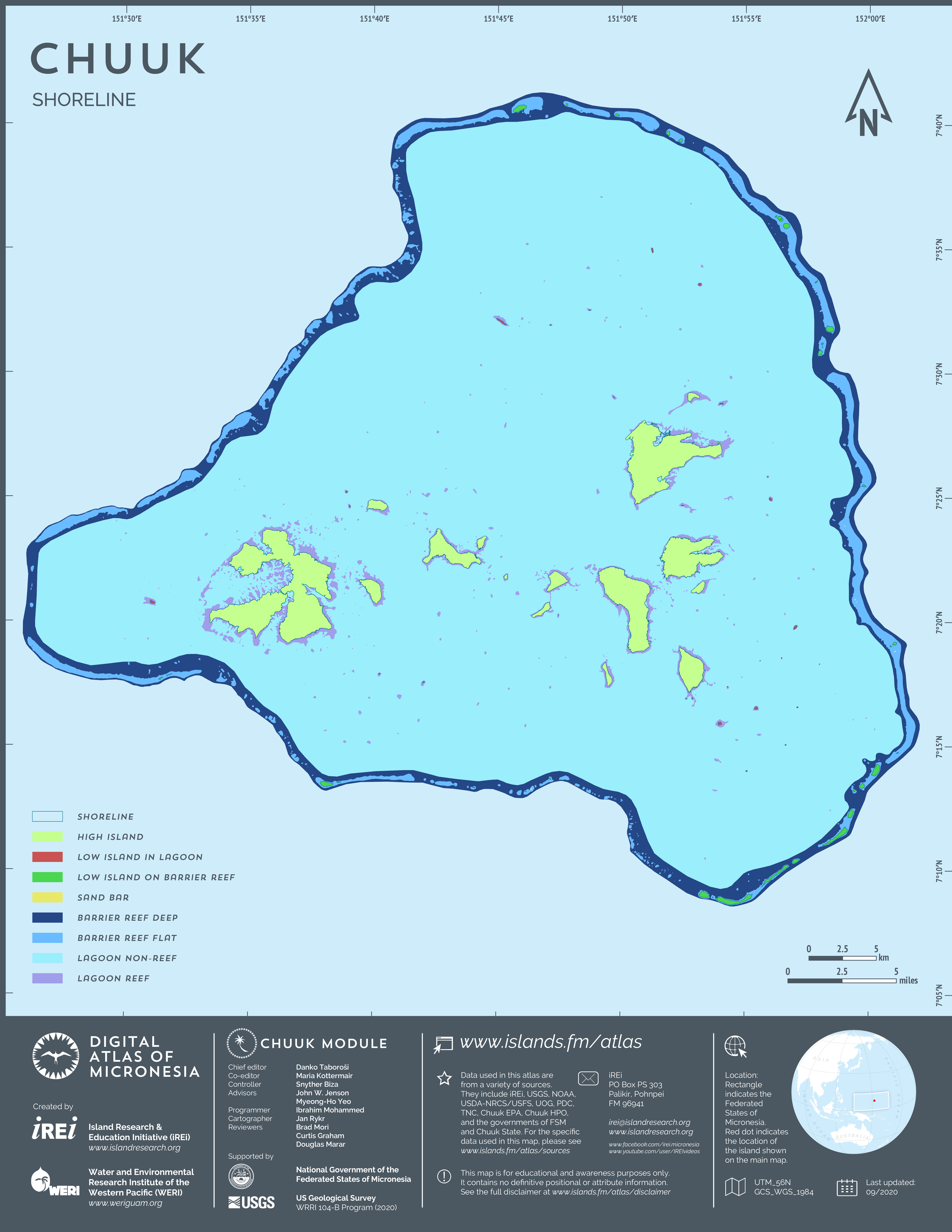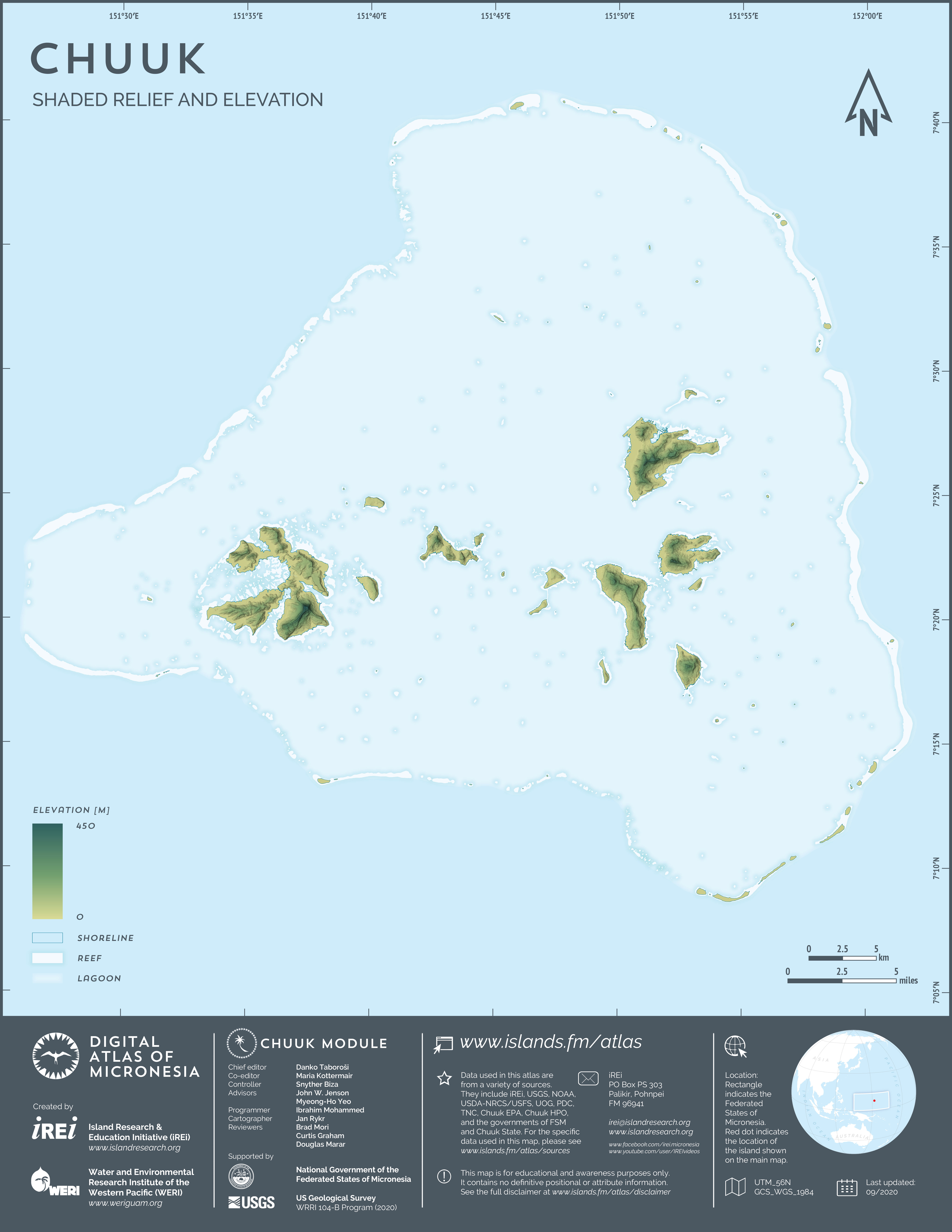 This map showcases 2004-2006 satellite imagery of Chuuk taken by QuickBird satellite by DigitalGlobe. The data were purchased and processed by U.S. Department of Agriculture (USDA) – Natural Resources Conservation Service (NRCS). The image shown here is in natural color. Image portions that fall outside the barrier reef of Chuuk are omitted from the map.