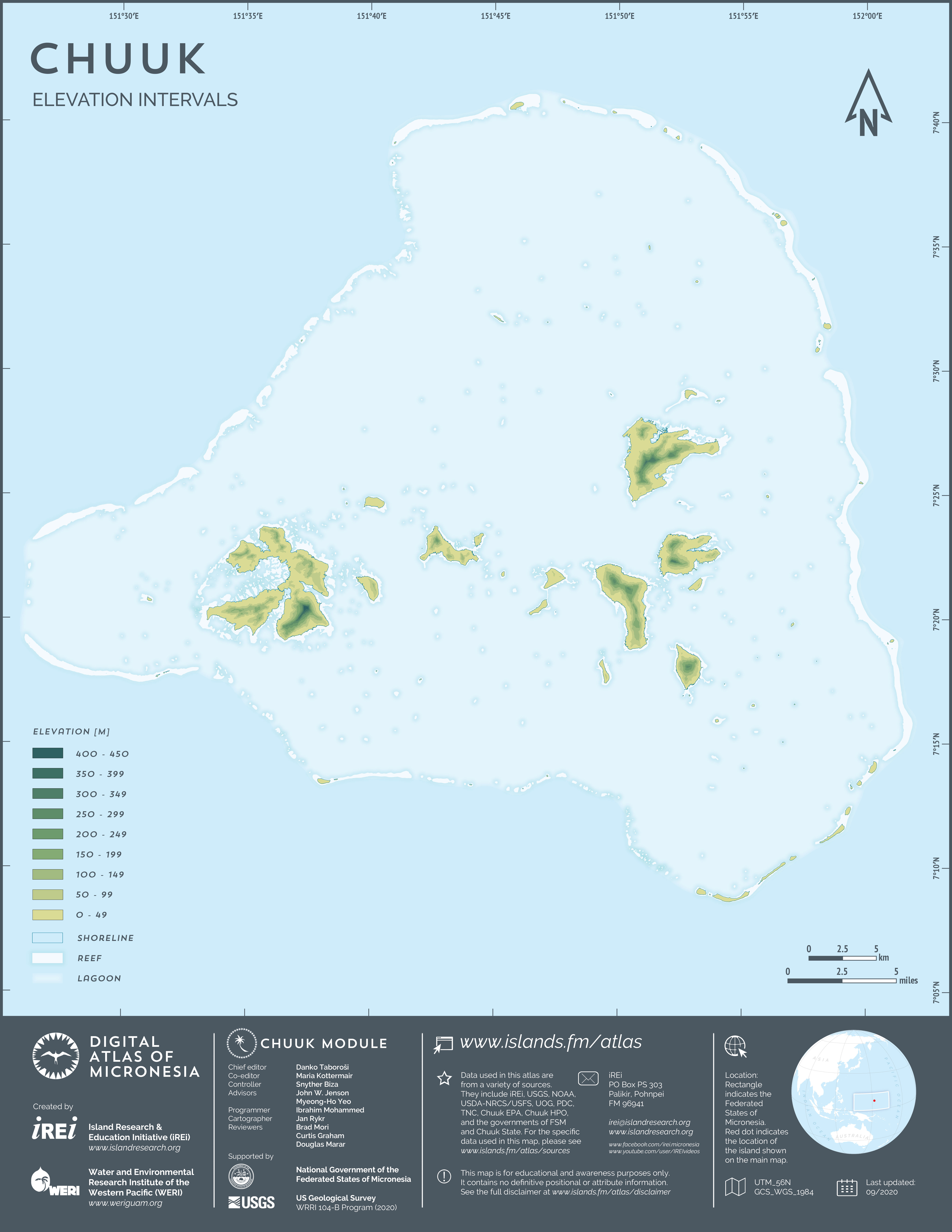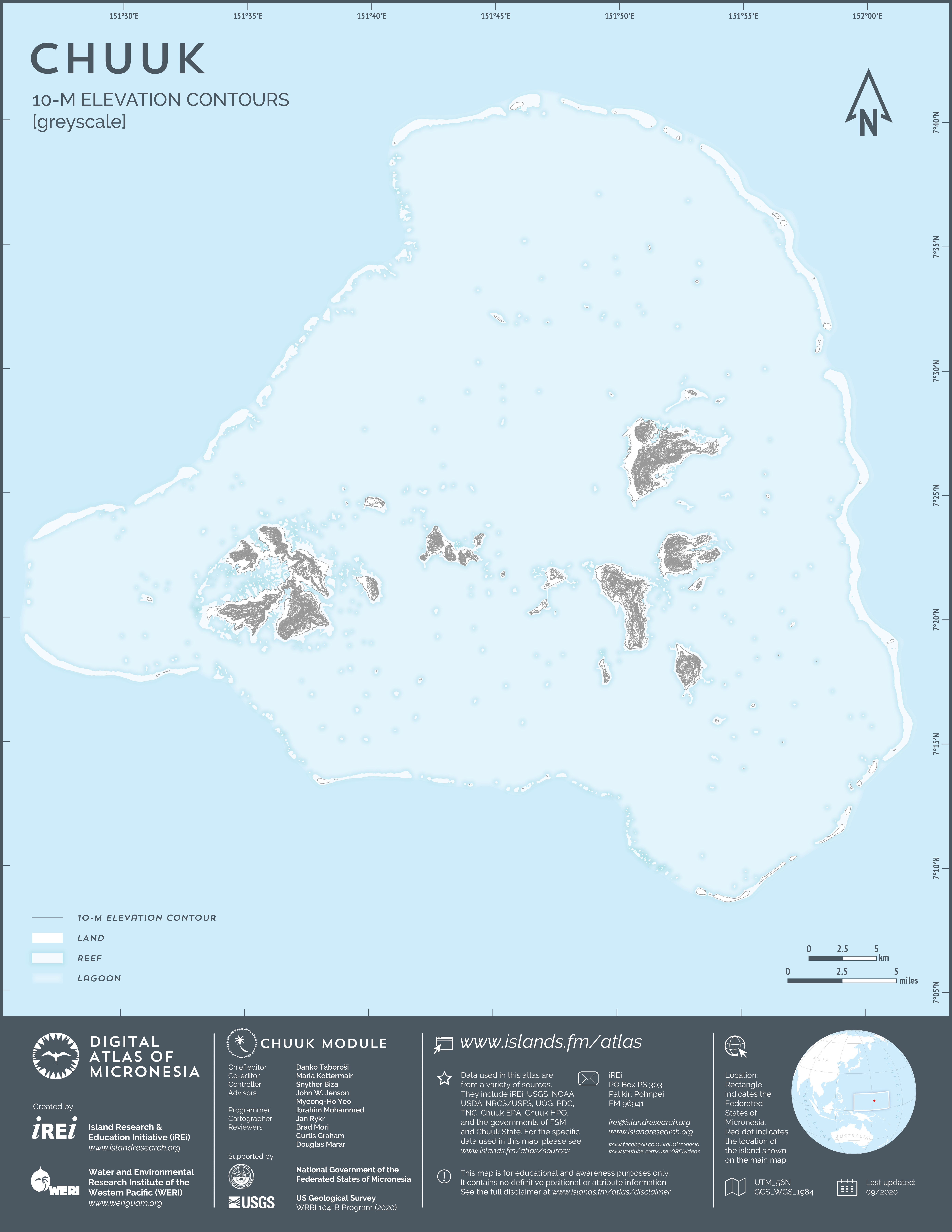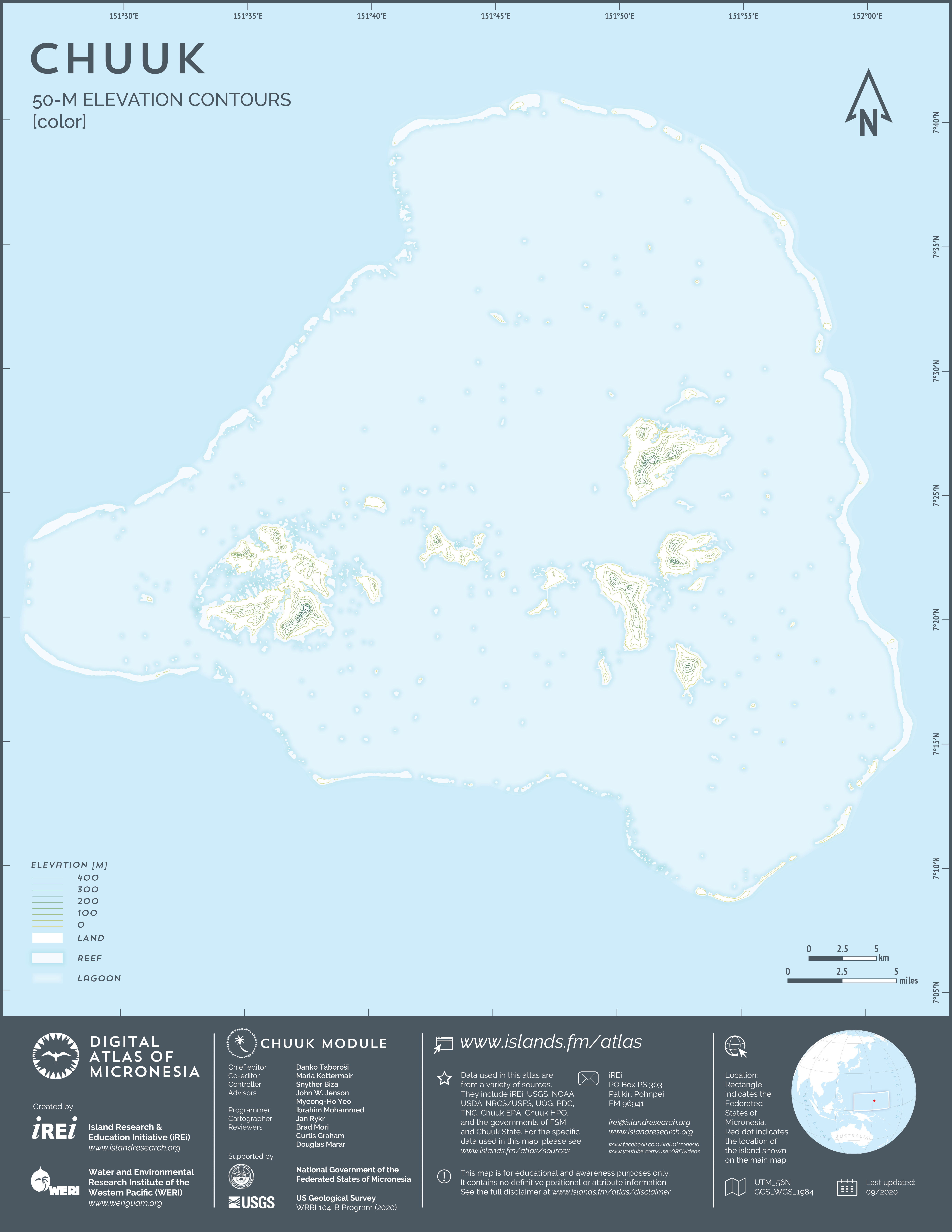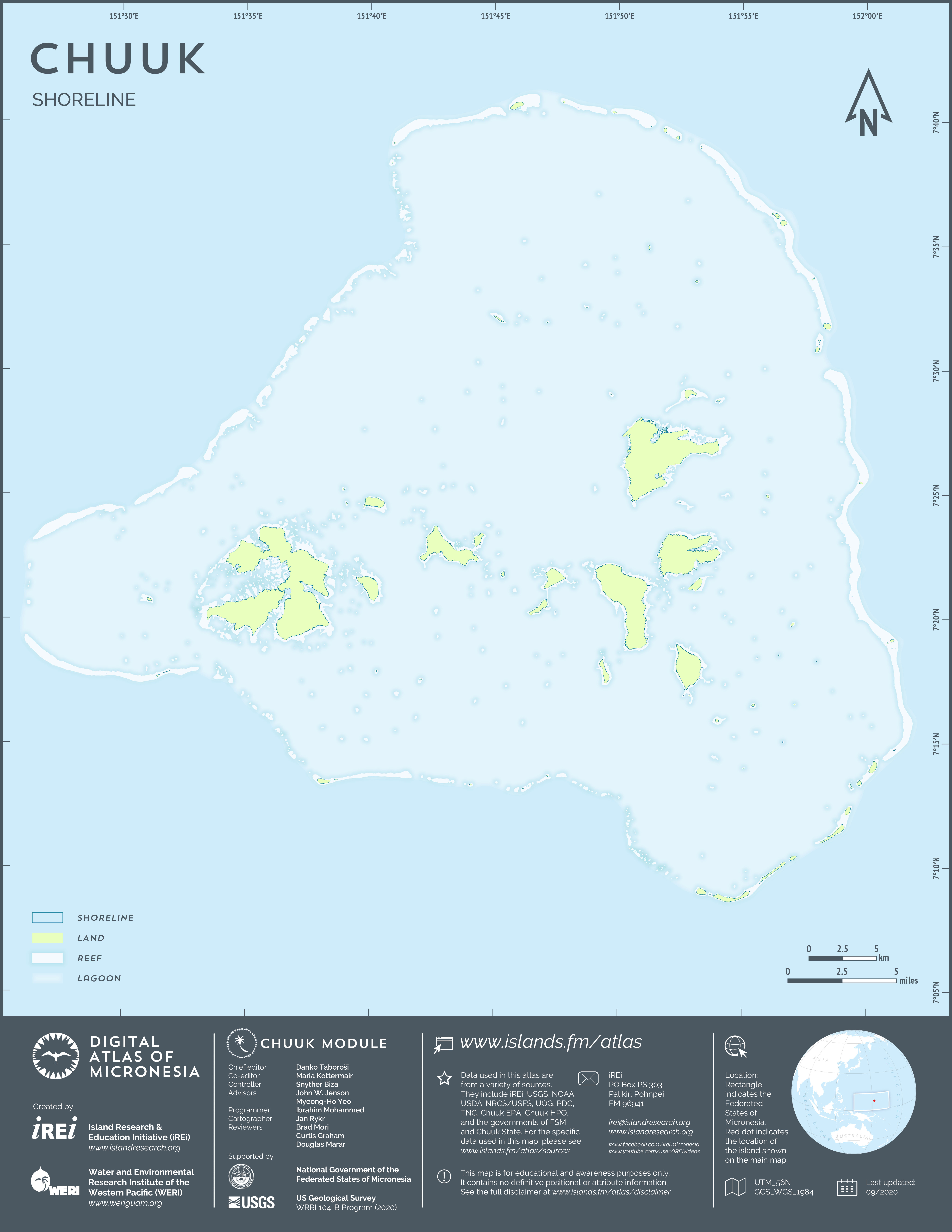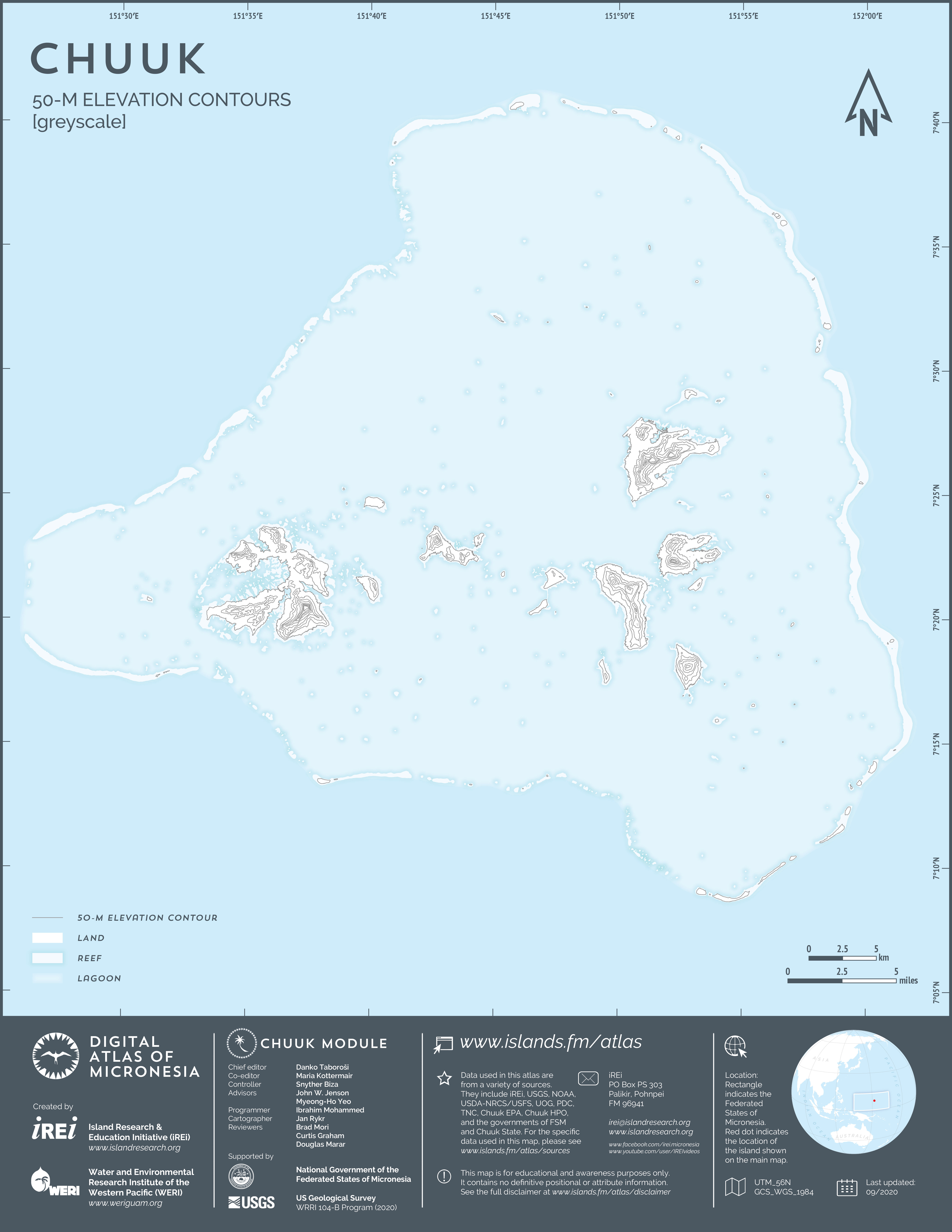 This map showcases 2004-2006 satellite imagery of Chuuk taken by QuickBird satellite by DigitalGlobe. The data were purchased and processed by U.S. Department of Agriculture (USDA) – Natural Resources Conservation Service (NRCS). The image shown here is in natural color. Image portions that fall outside the barrier reef of Chuuk are omitted from the map.