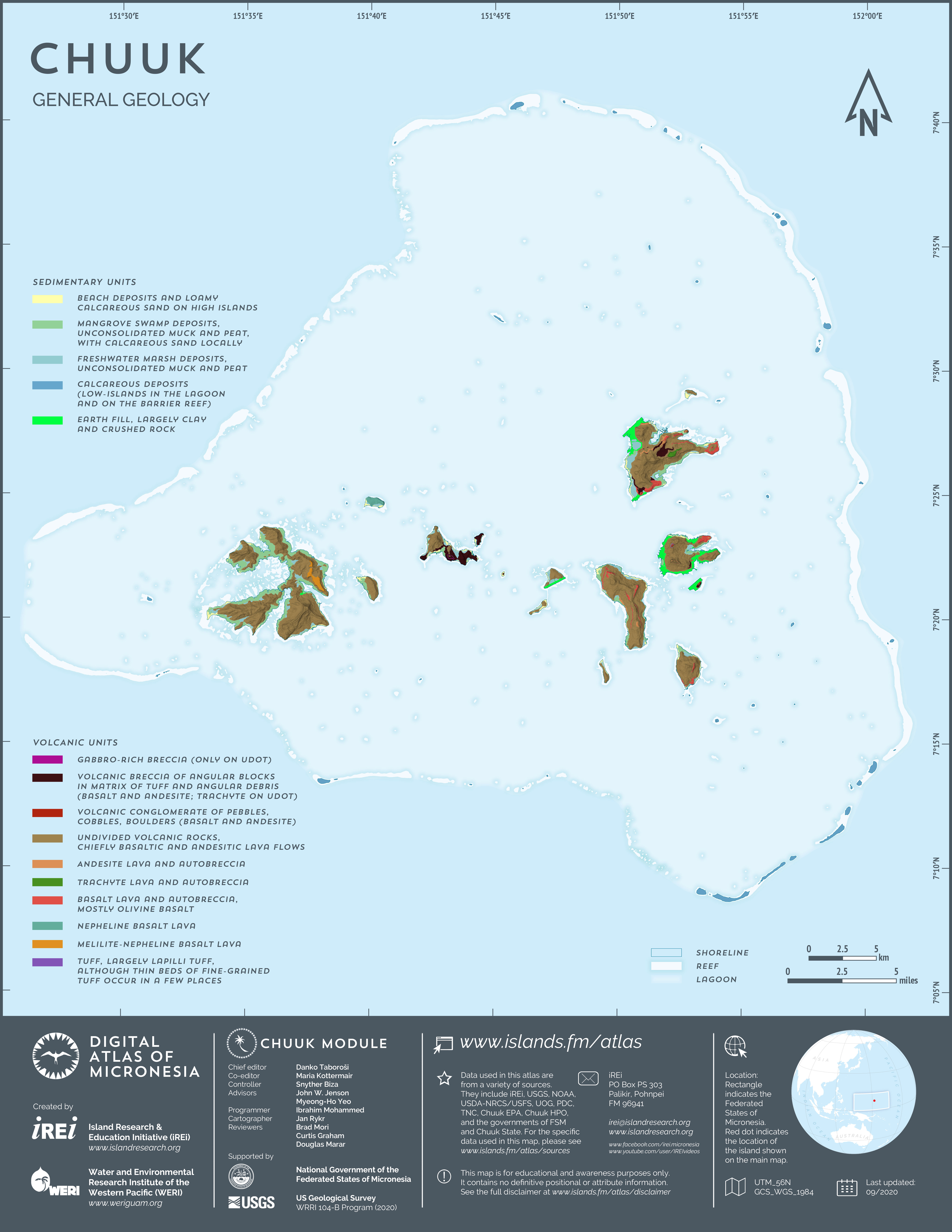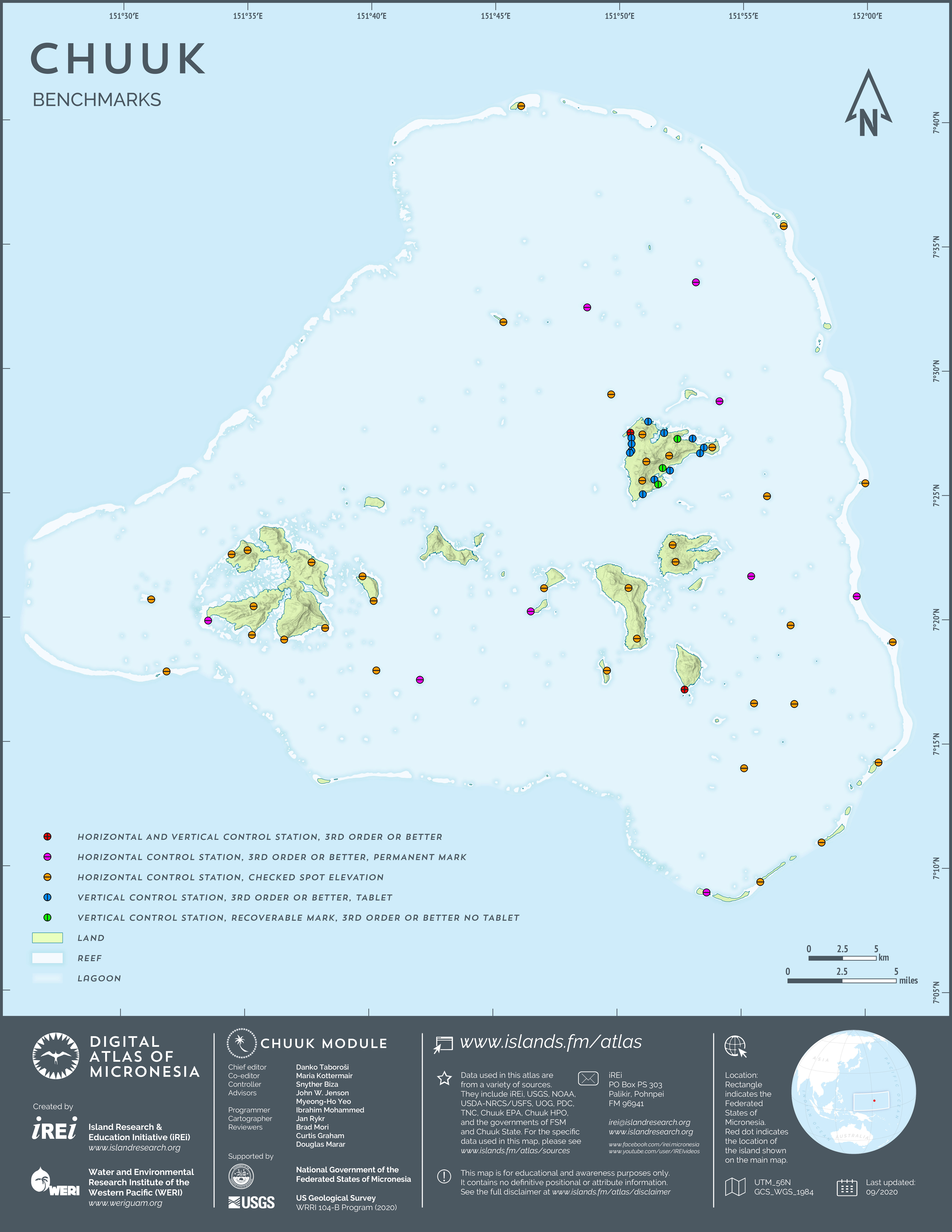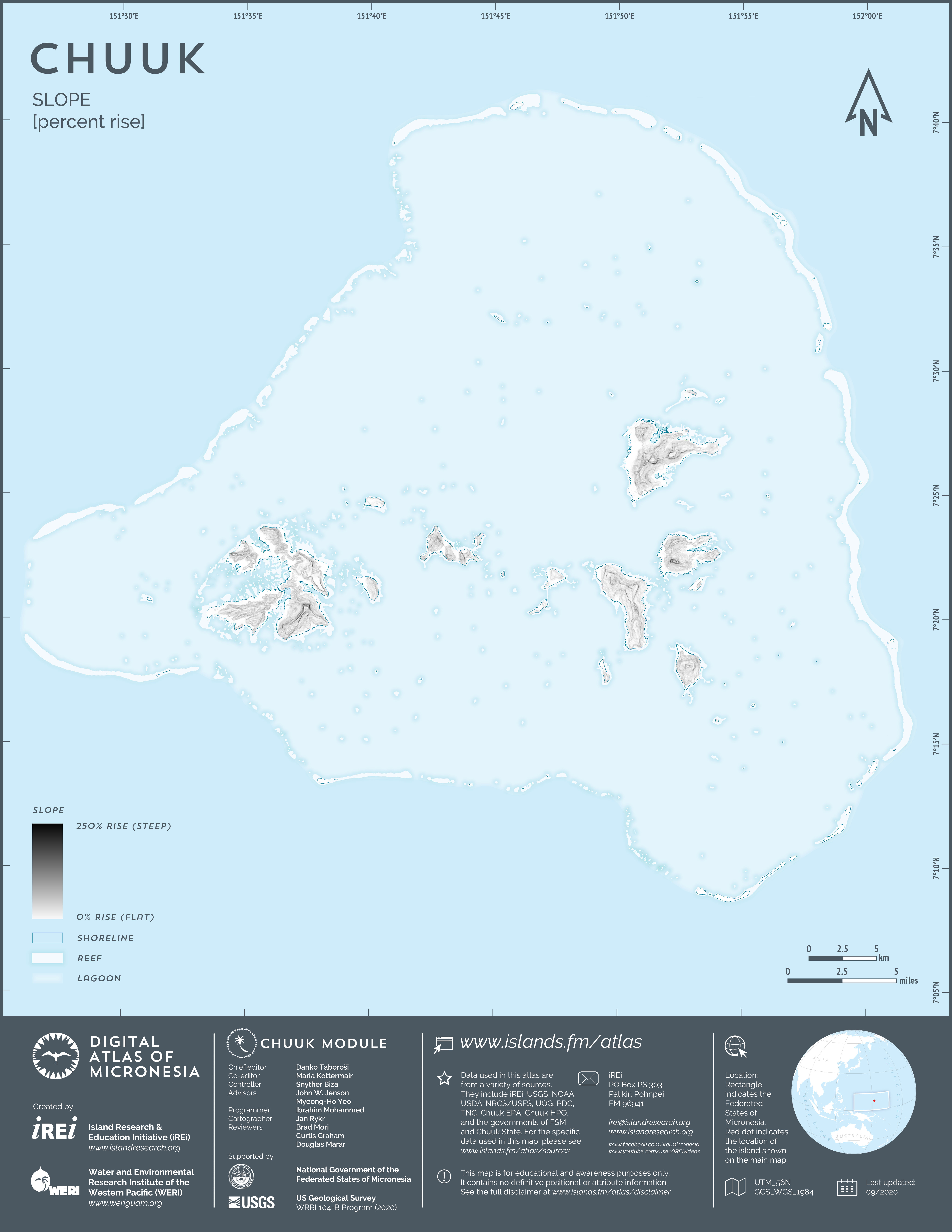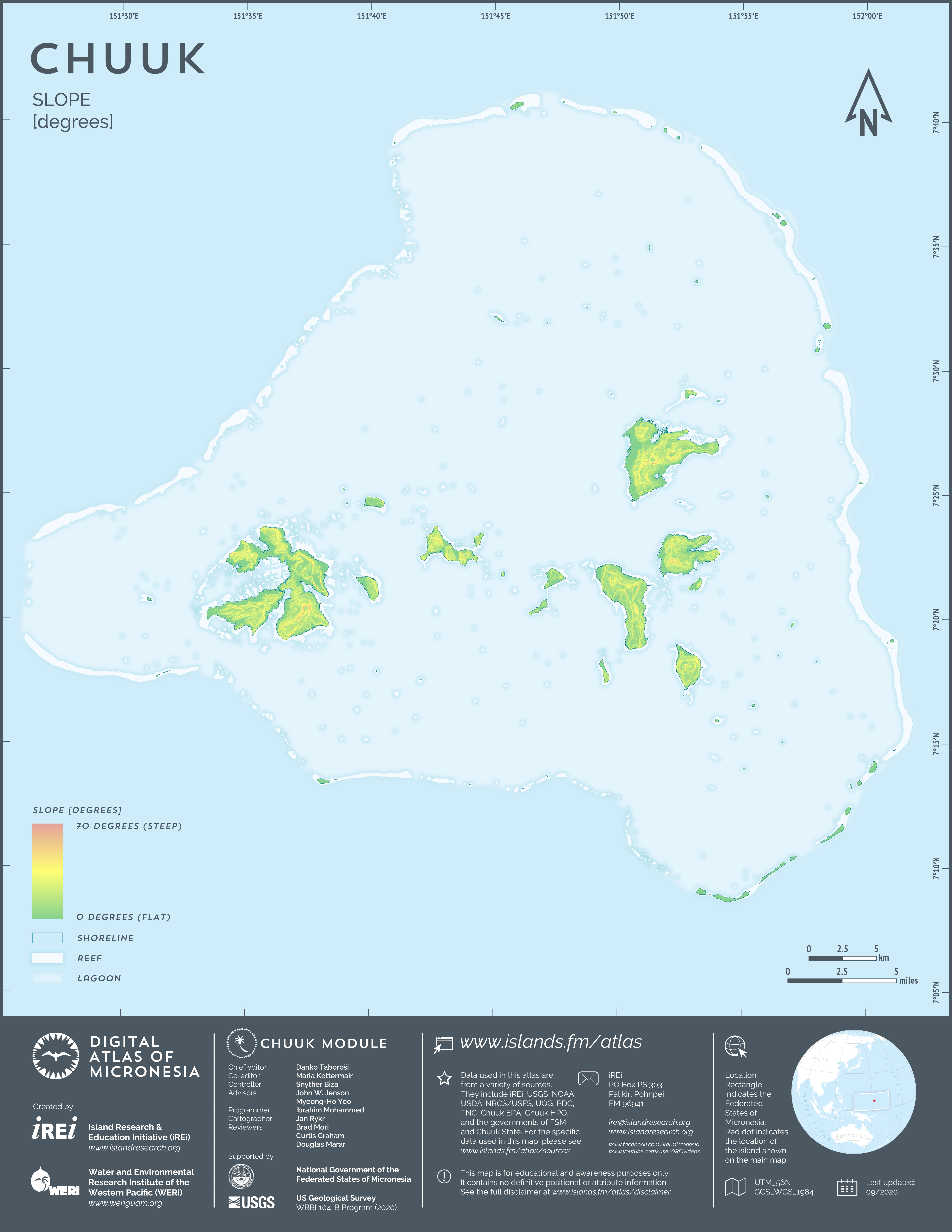 This map showcases 2004-2006 satellite imagery of Chuuk taken by QuickBird satellite by DigitalGlobe. The data were purchased and processed by U.S. Department of Agriculture (USDA) – Natural Resources Conservation Service (NRCS). The image shown here is in natural color. Image portions that fall outside the barrier reef of Chuuk are omitted from the map.