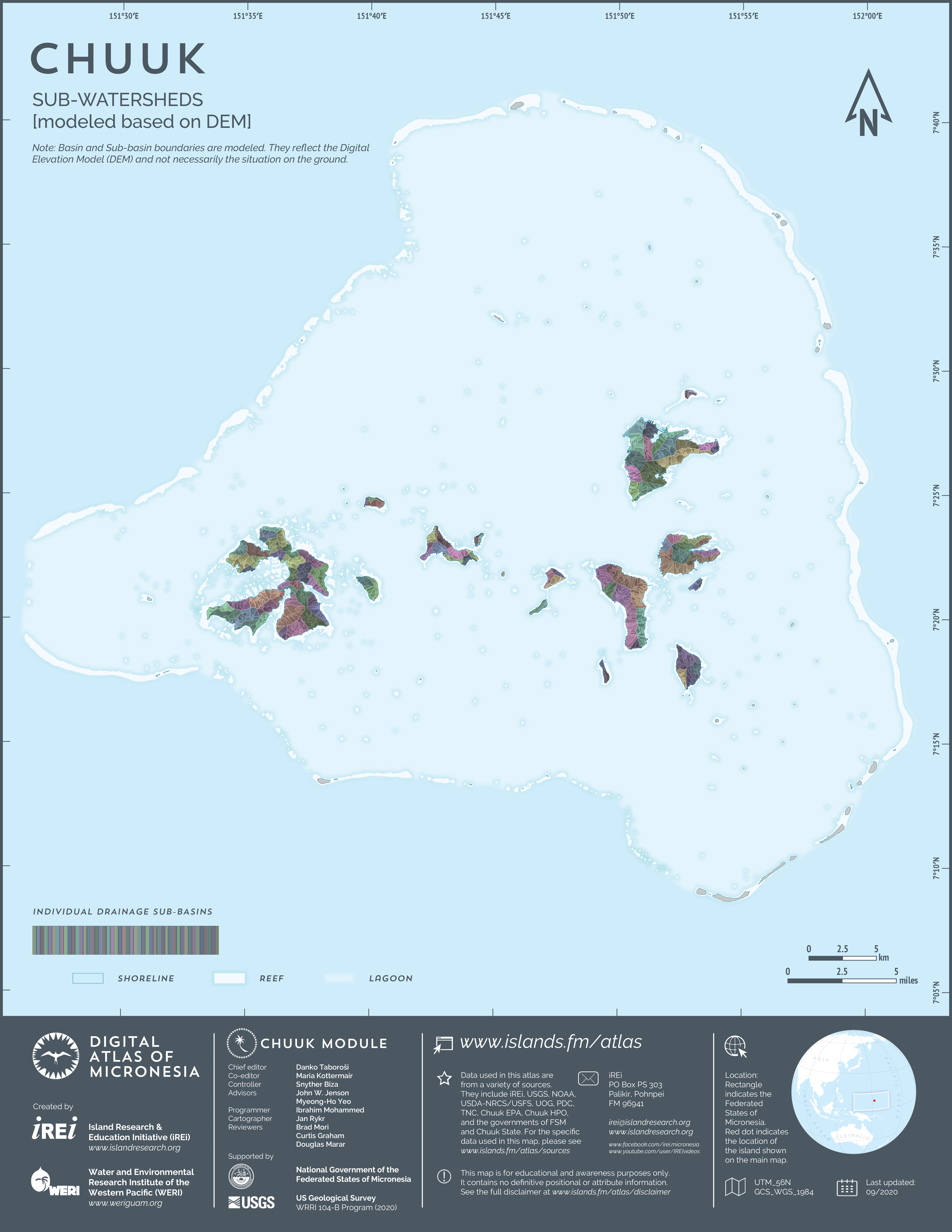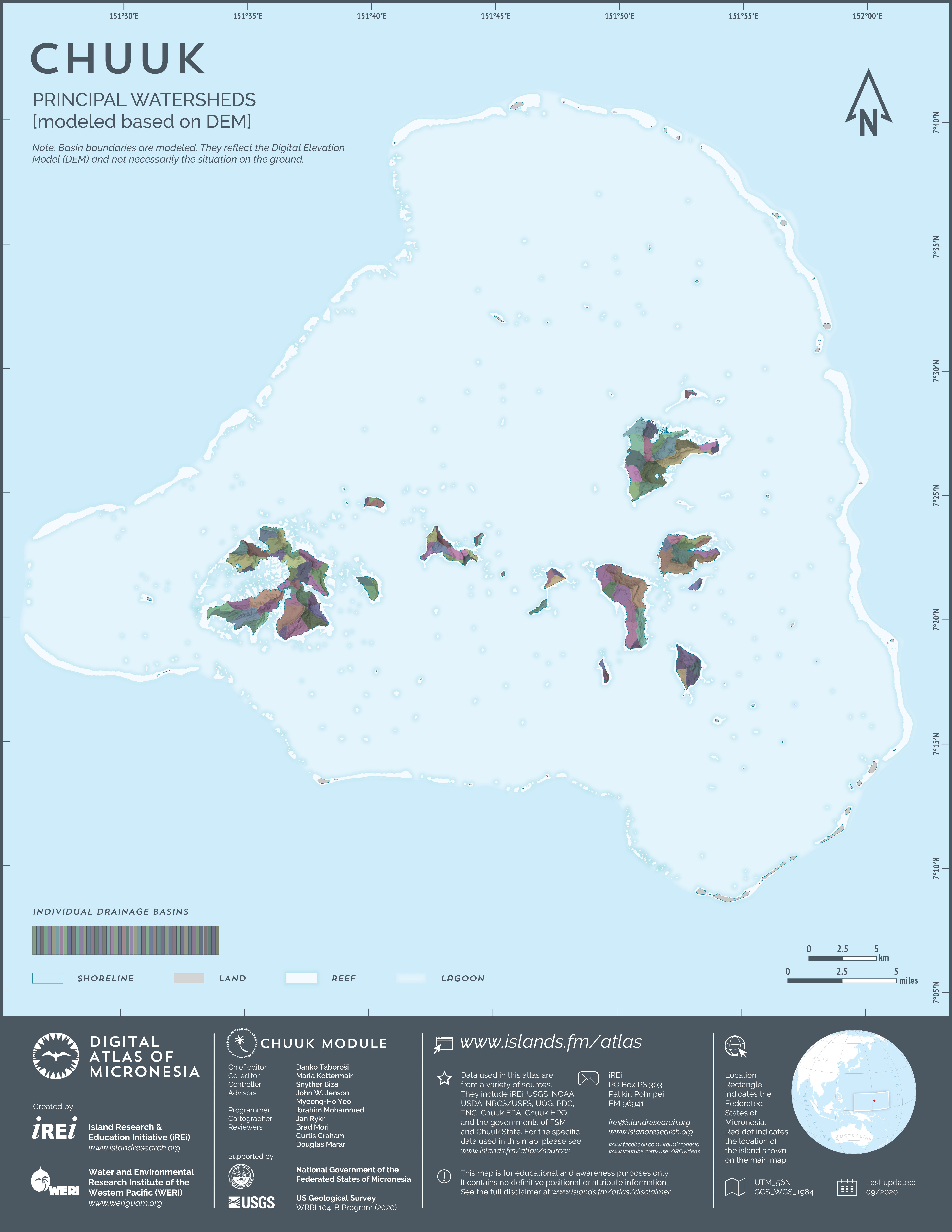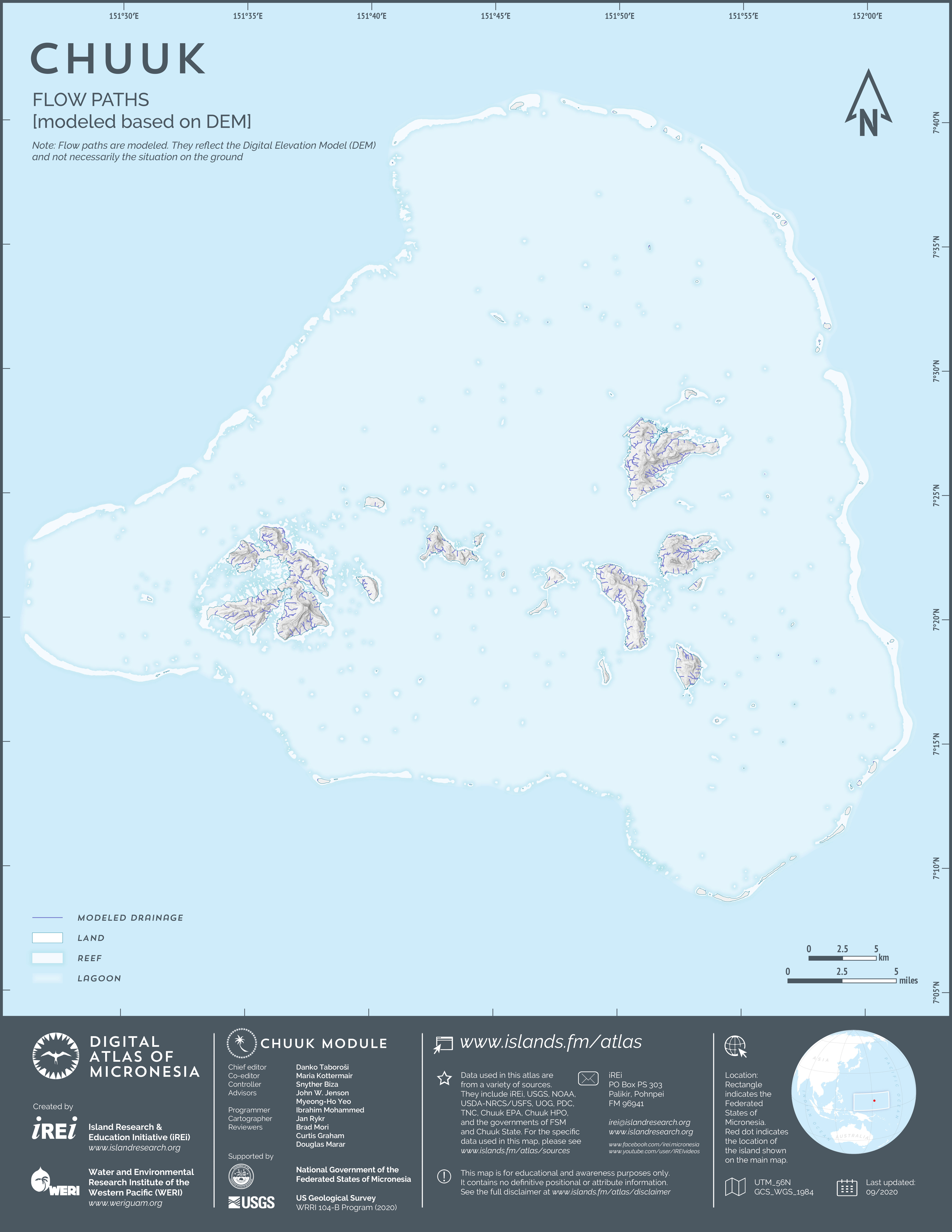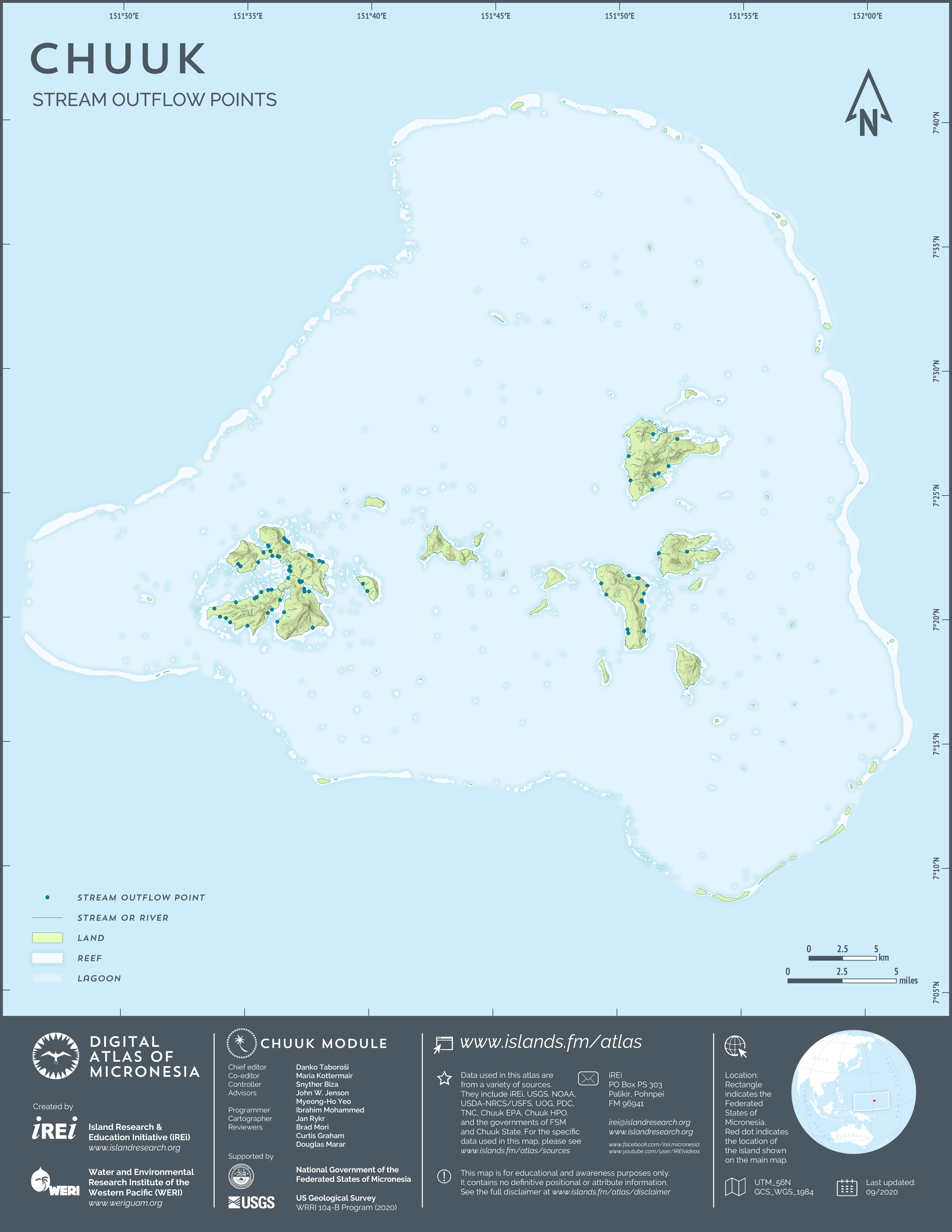 This map shows the rivers and streams on the islands in Chuuk Lagoon as represented on the U.S. Geological Survey (USGS) 1:25,000-scale topographic maps (1996-1997). The dataset was extracted from the Digital Line Graphs (DLGs) from USGS and names from the Geographic Names Information System (GNIS) by Island Research & Education Initiative (iREi) (2020) and slightly modified to match the new base layer.