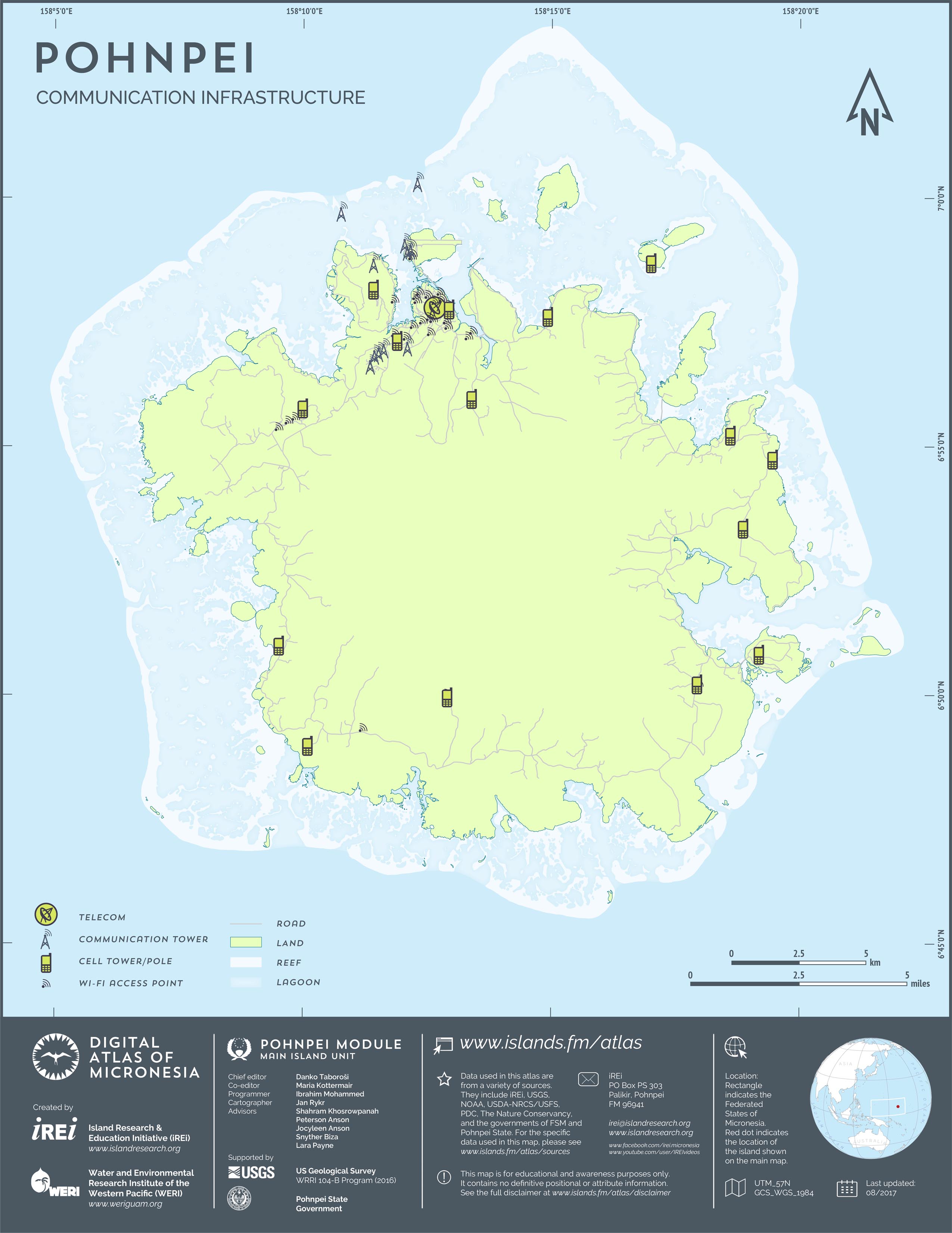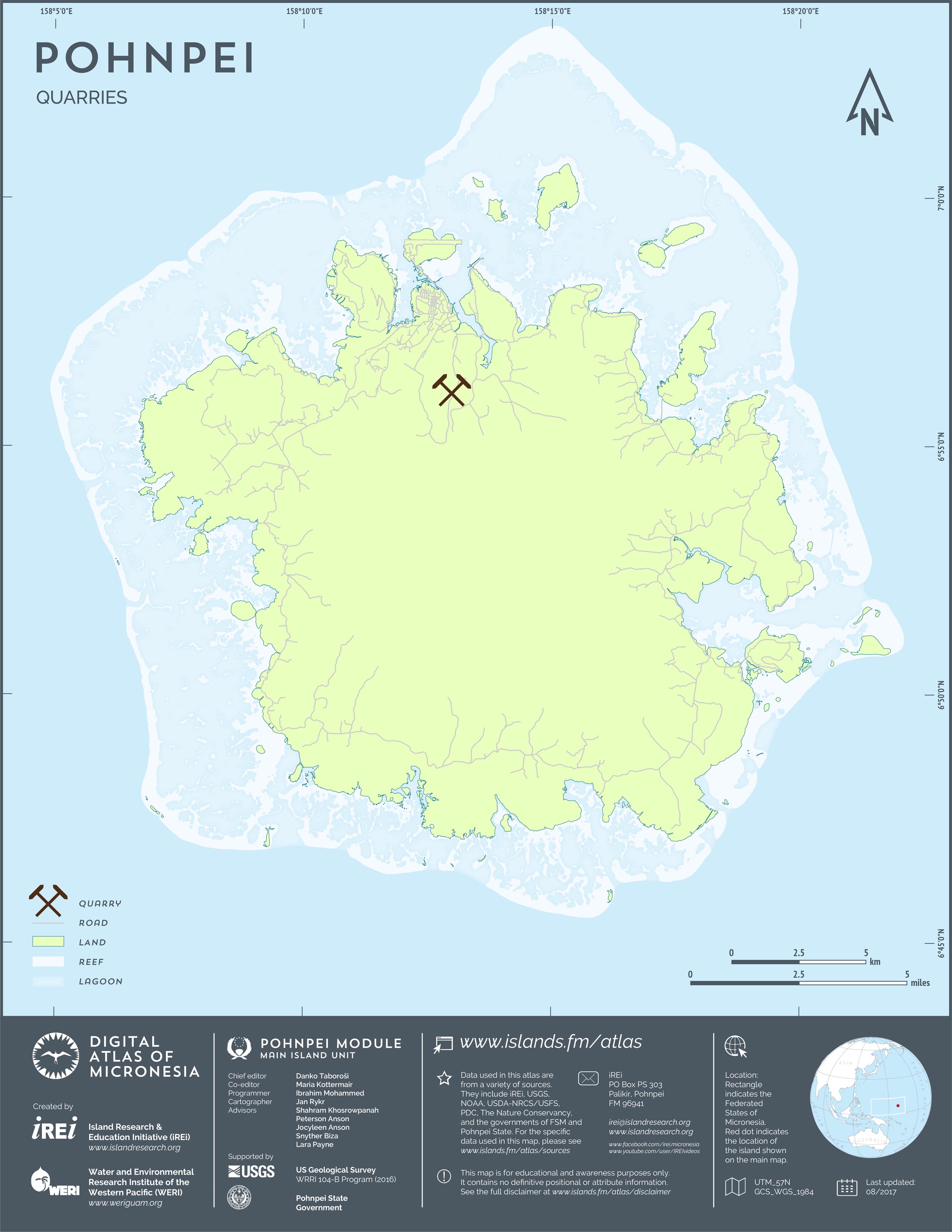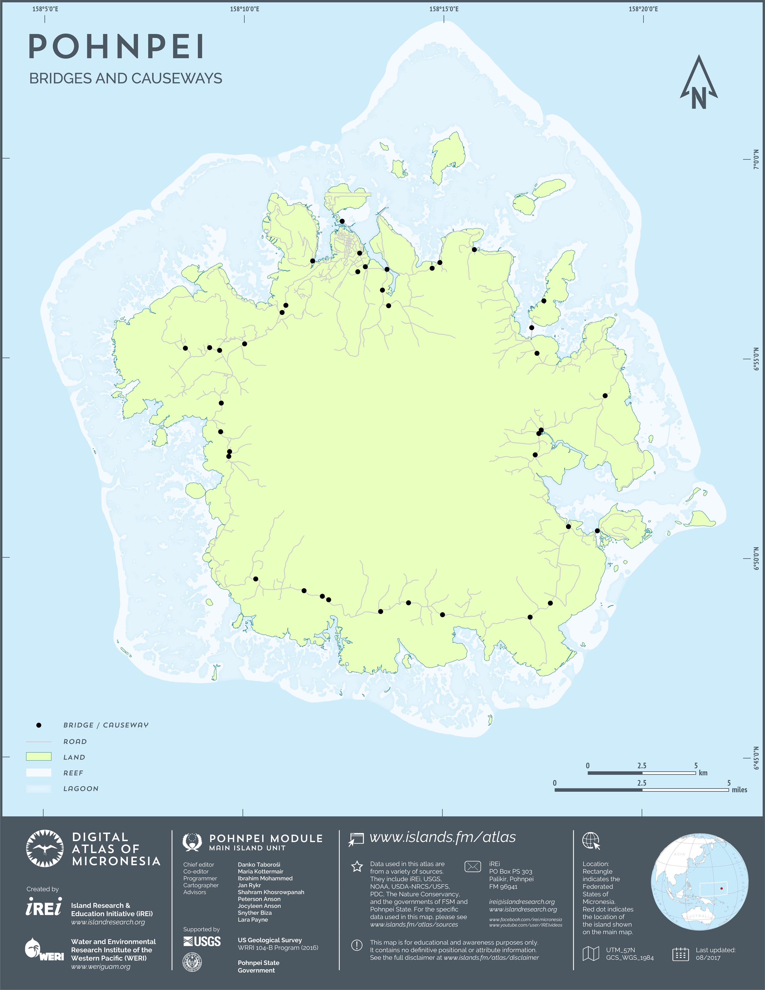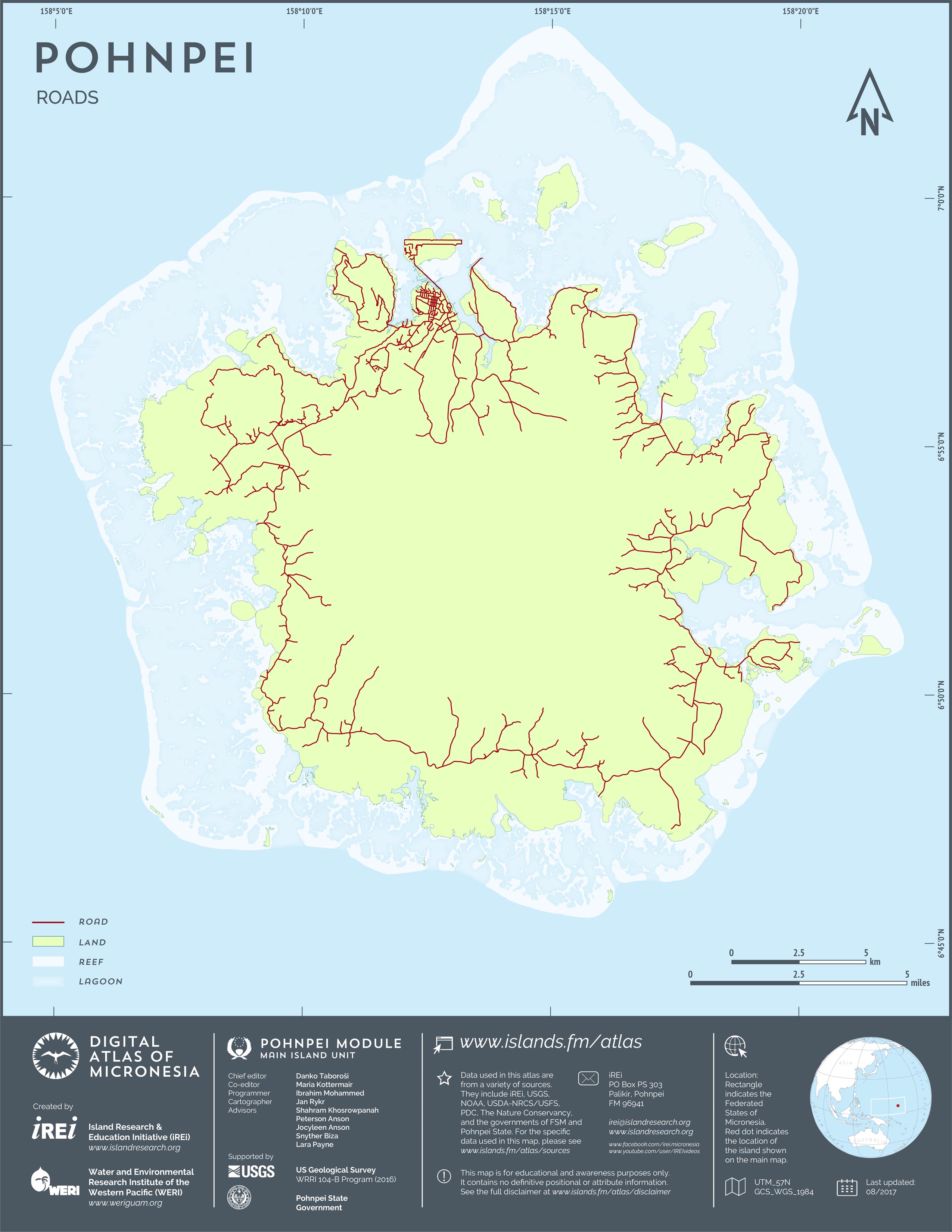 This map shows the road network on Pohnpei. It includes major roads as well as smaller paved and unpaved roads. The dataset was originally created by U.S. Geological Survey (USGS) (2001) for Digital Line Graphs (DLGs) used to show information on 1:25,000-scale topographic maps. It has been modified to reflect changes and add street names of selected roads throughout the years and using various sources including Kolonia Town Government, U.S. Department of Agriculture (USDA) – Natural Resources Conservation Service (NRCS), and Pohnpei State Government – Department of Land and Natural Resources (2013). A major update was performed by Island Research & Education Initiative (iREi) (2017) to reflect changes based on 2016 WorldView-3 satellite imagery by DigitalGlobe. The attribute information (name and type of road) has not been updated recently.