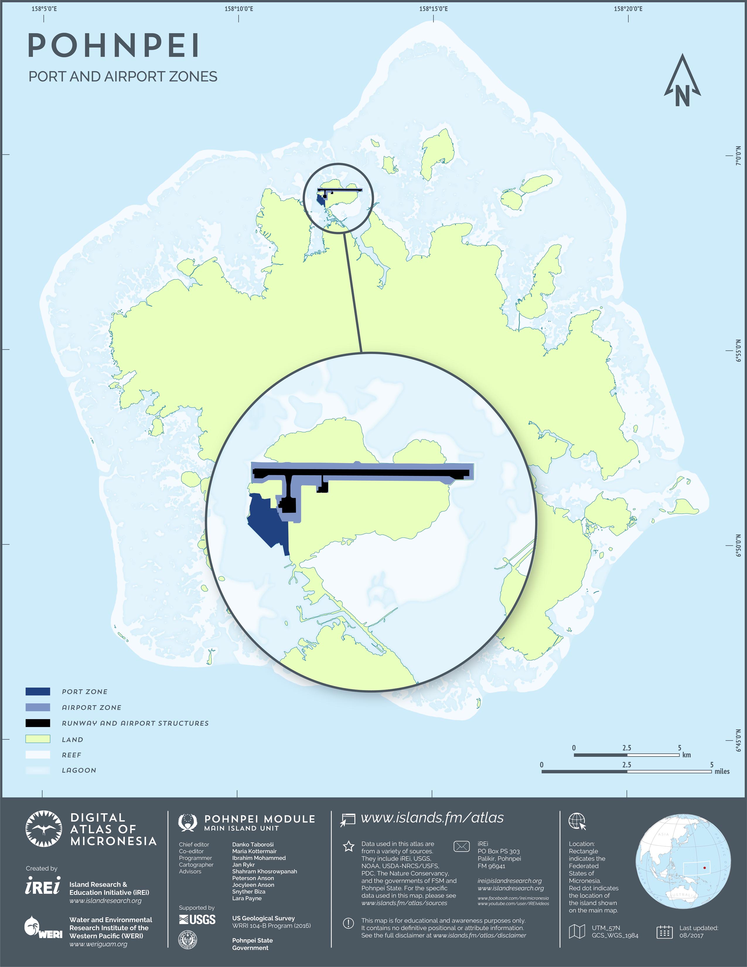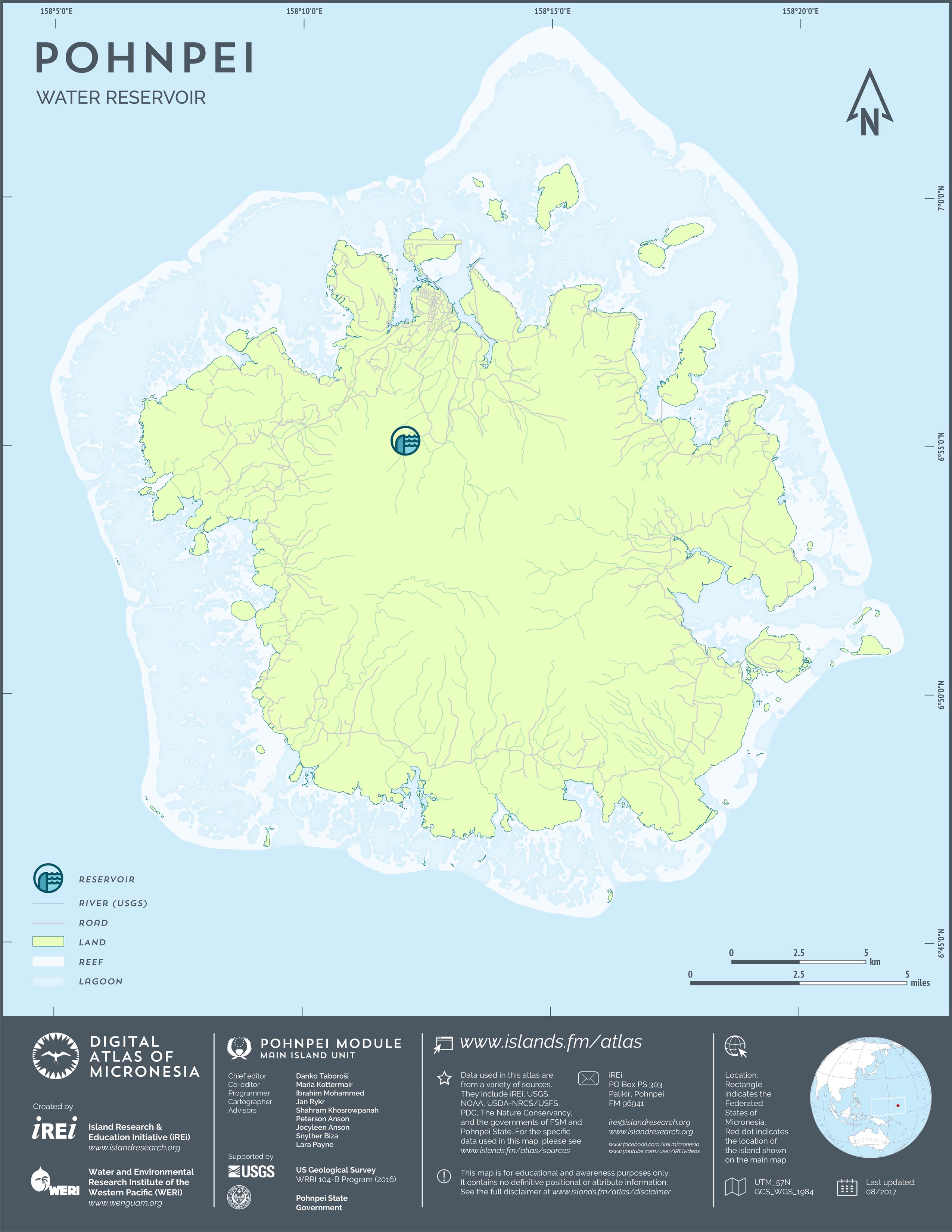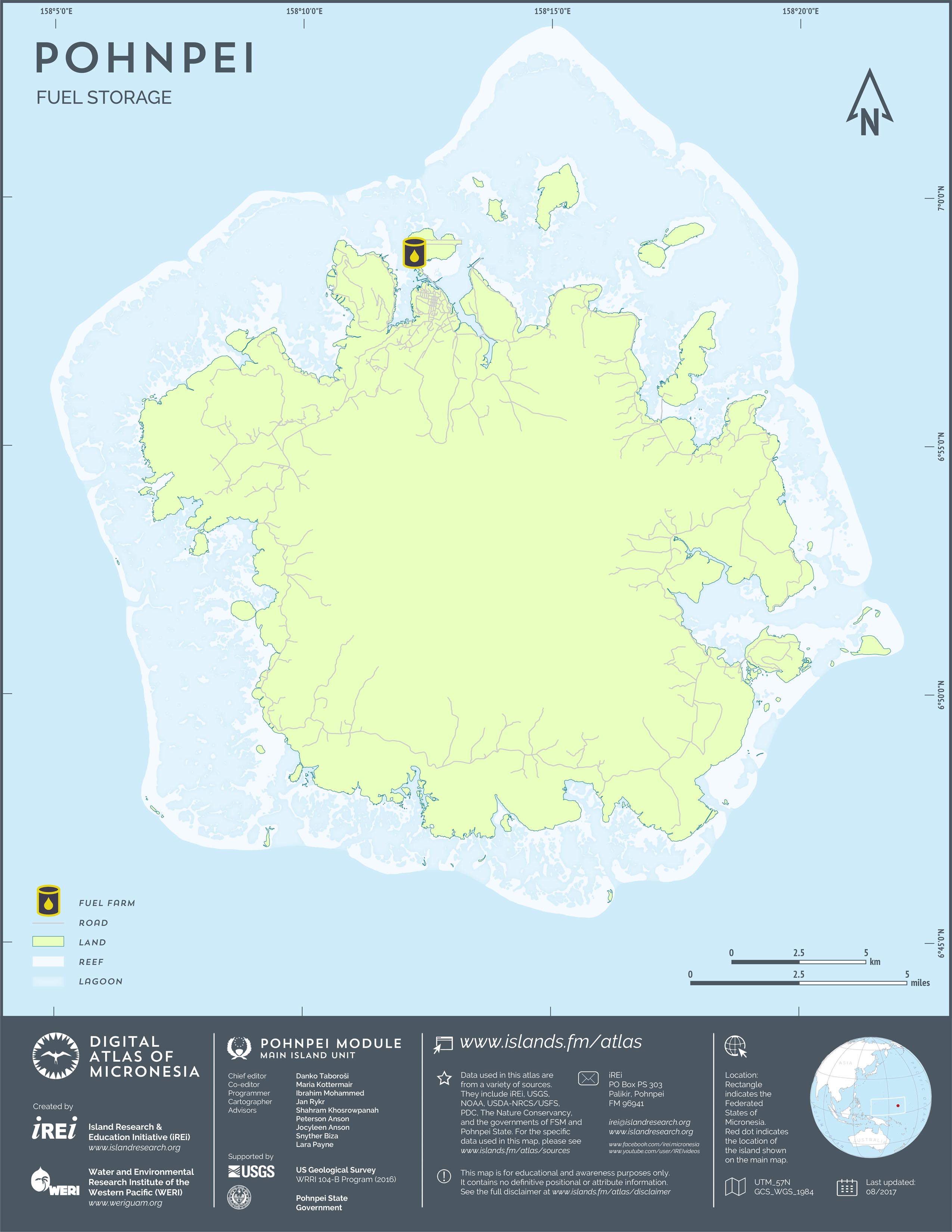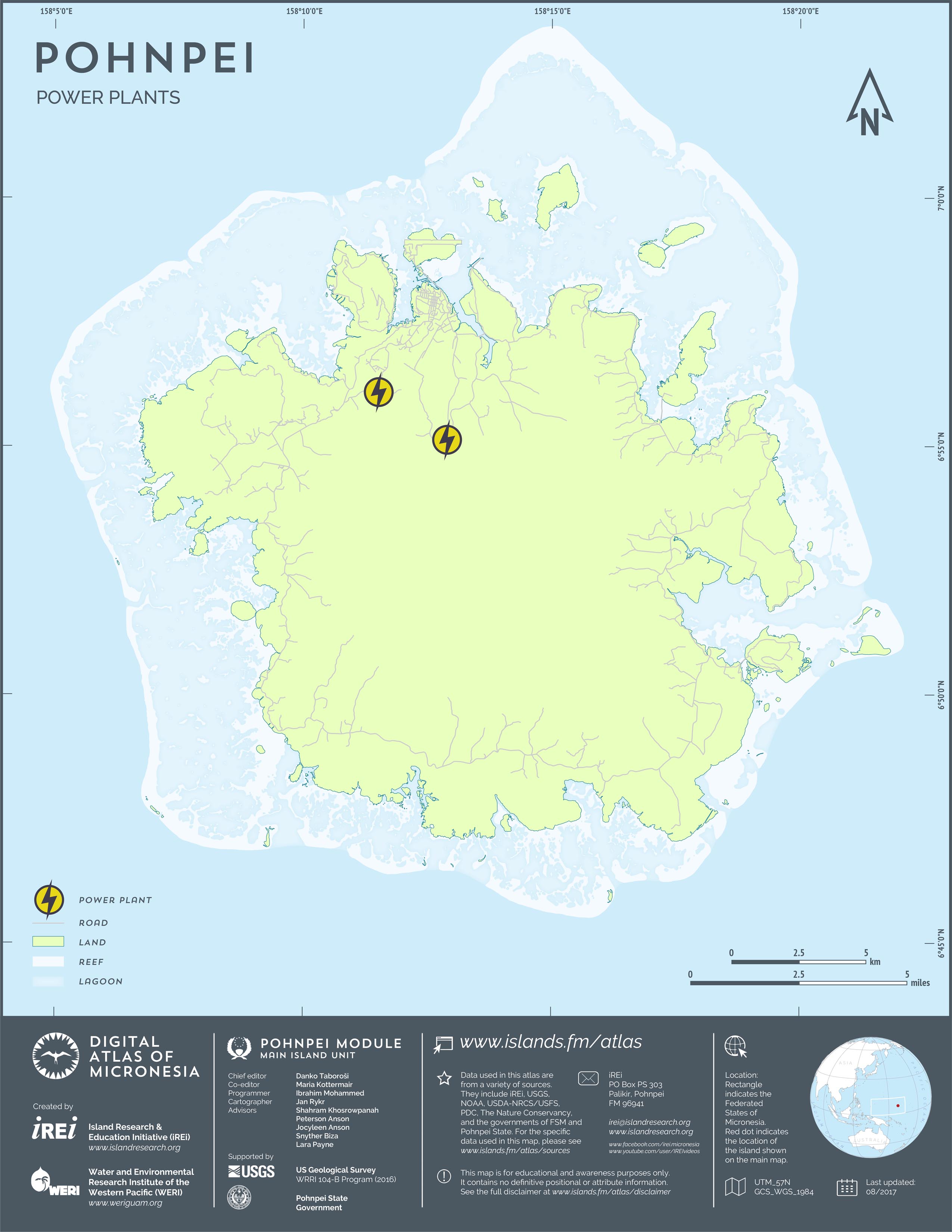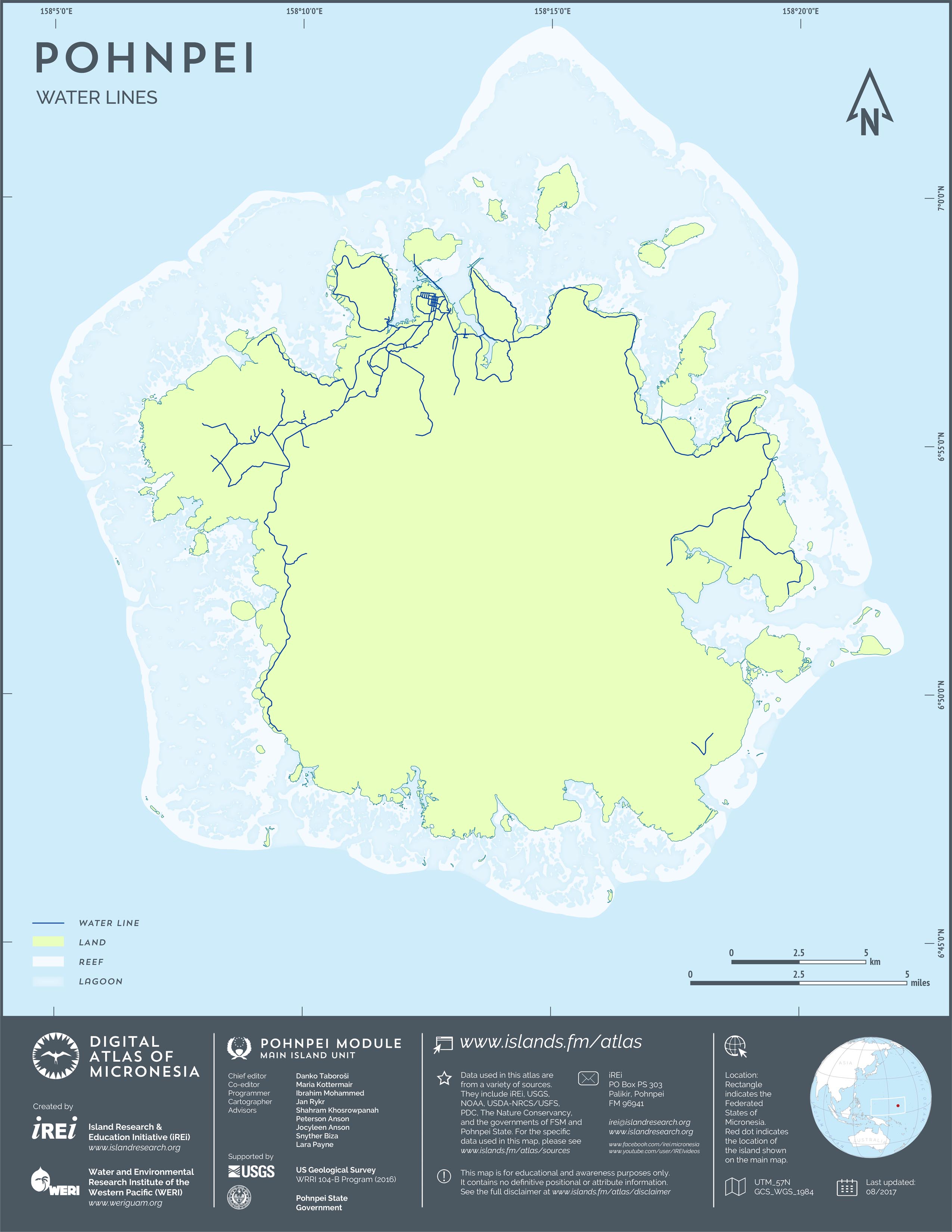 This map shows the road network on Pohnpei. It includes major roads as well as smaller paved and unpaved roads. The dataset was originally created by U.S. Geological Survey (USGS) (2001) for Digital Line Graphs (DLGs) used to show information on 1:25,000-scale topographic maps. It has been modified to reflect changes and add street names of selected roads throughout the years and using various sources including Kolonia Town Government, U.S. Department of Agriculture (USDA) – Natural Resources Conservation Service (NRCS), and Pohnpei State Government – Department of Land and Natural Resources (2013). A major update was performed by Island Research & Education Initiative (iREi) (2017) to reflect changes based on 2016 WorldView-3 satellite imagery by DigitalGlobe. The attribute information (name and type of road) has not been updated recently.