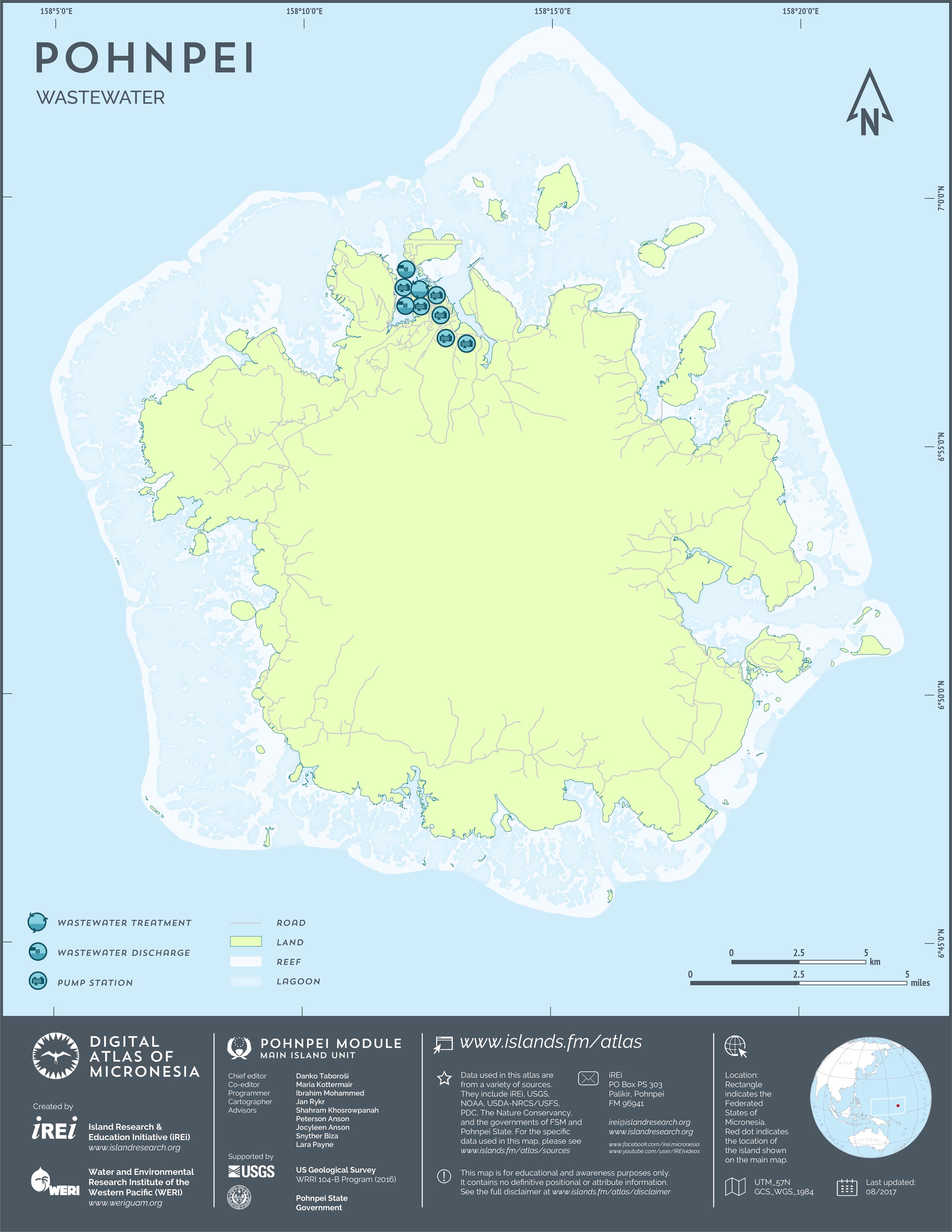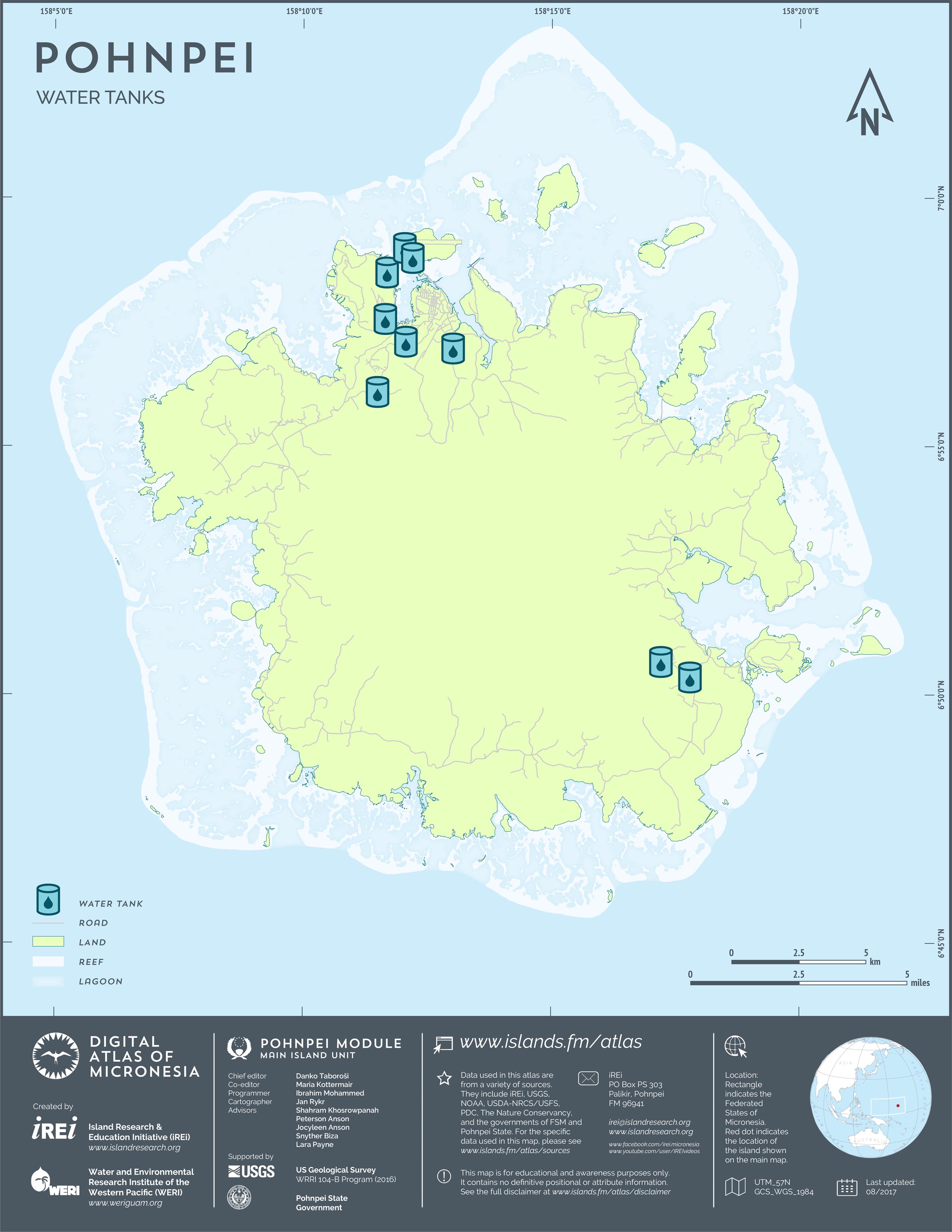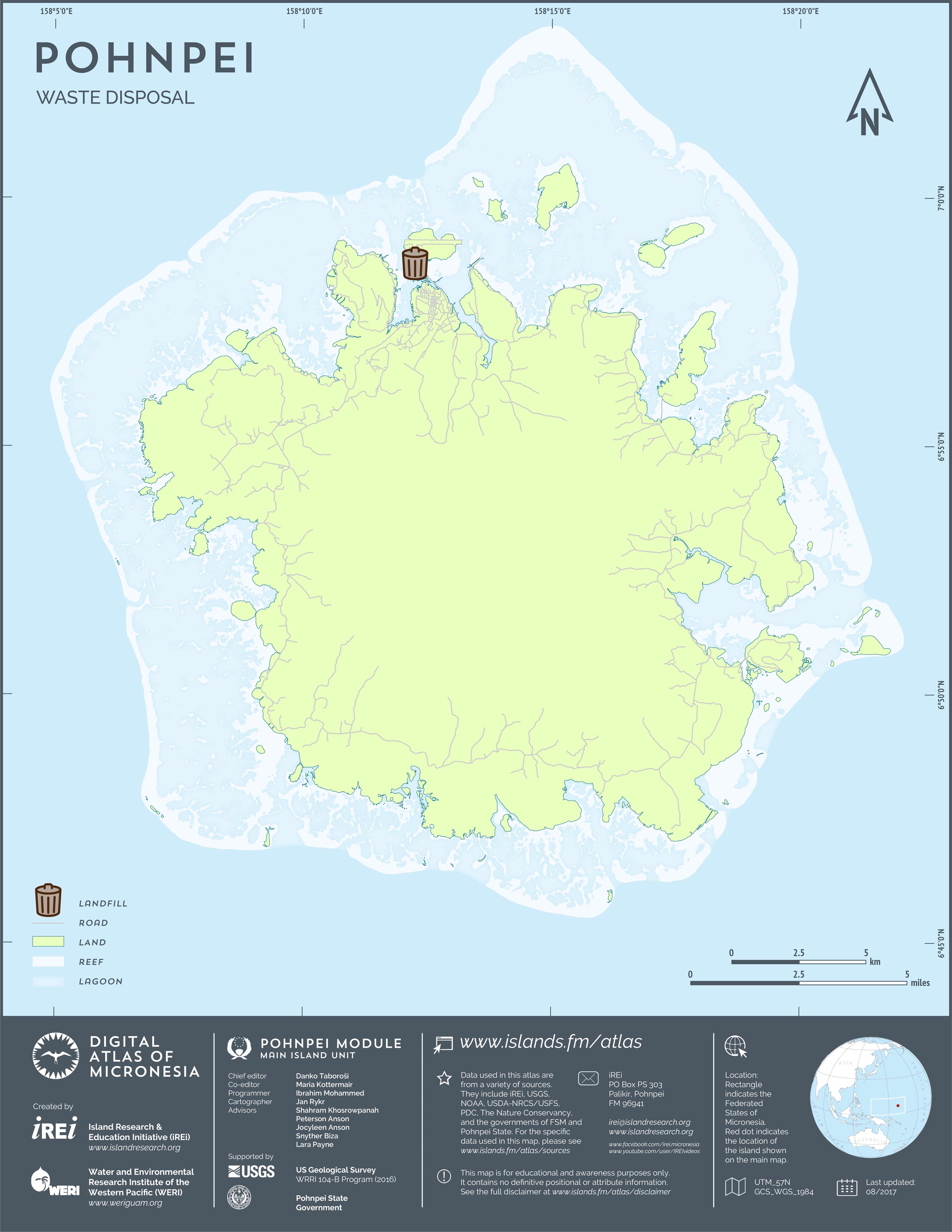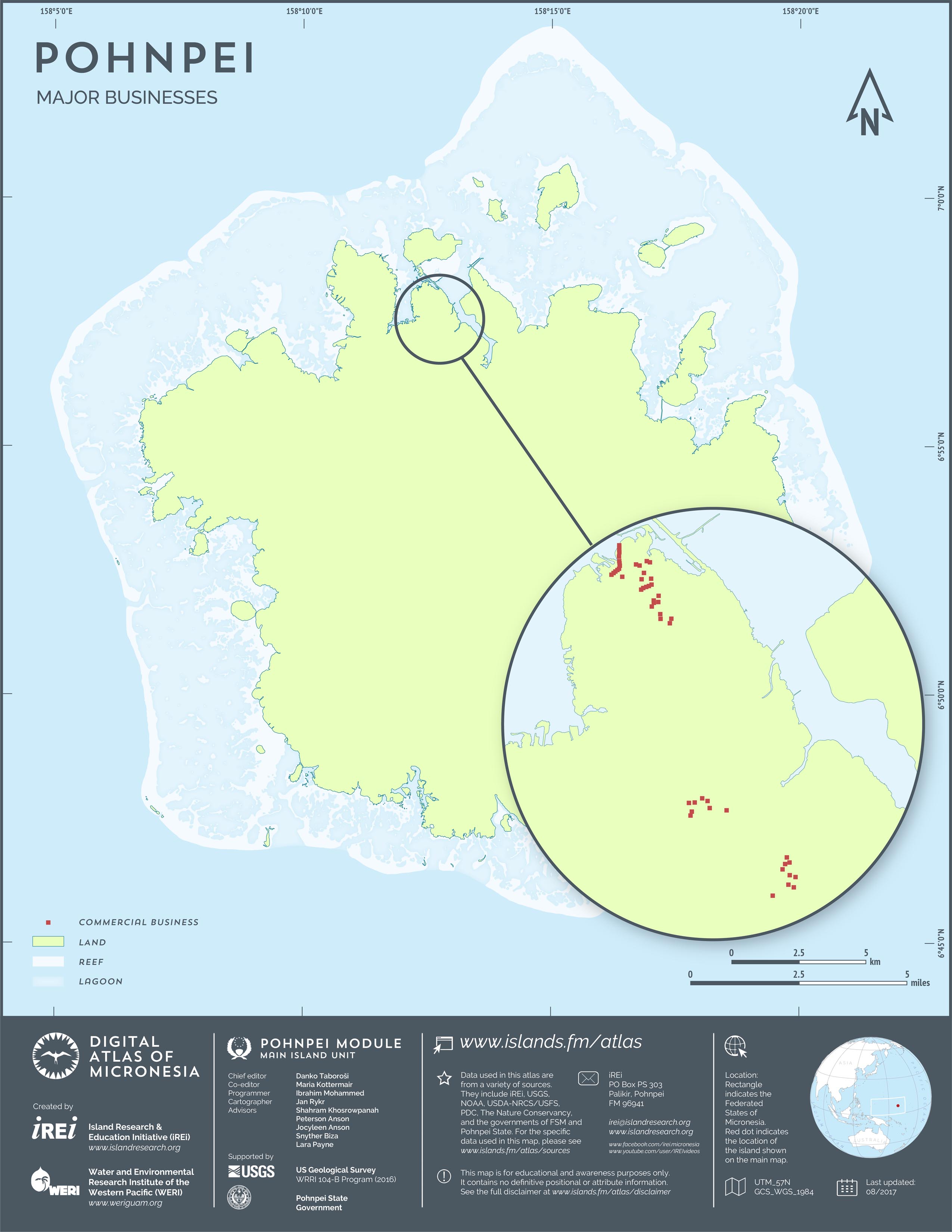 This map shows the road network on Pohnpei. It includes major roads as well as smaller paved and unpaved roads. The dataset was originally created by U.S. Geological Survey (USGS) (2001) for Digital Line Graphs (DLGs) used to show information on 1:25,000-scale topographic maps. It has been modified to reflect changes and add street names of selected roads throughout the years and using various sources including Kolonia Town Government, U.S. Department of Agriculture (USDA) – Natural Resources Conservation Service (NRCS), and Pohnpei State Government – Department of Land and Natural Resources (2013). A major update was performed by Island Research & Education Initiative (iREi) (2017) to reflect changes based on 2016 WorldView-3 satellite imagery by DigitalGlobe. The attribute information (name and type of road) has not been updated recently.