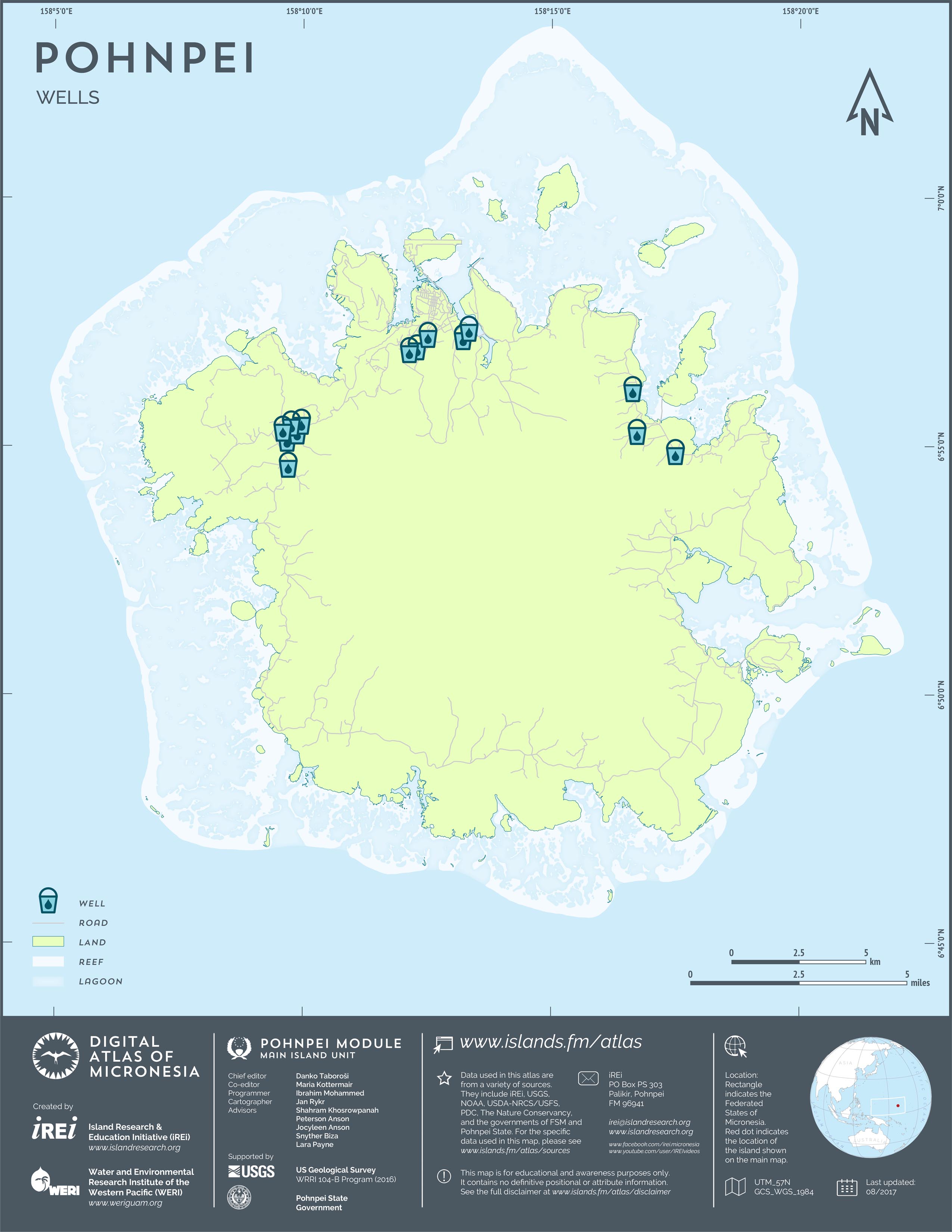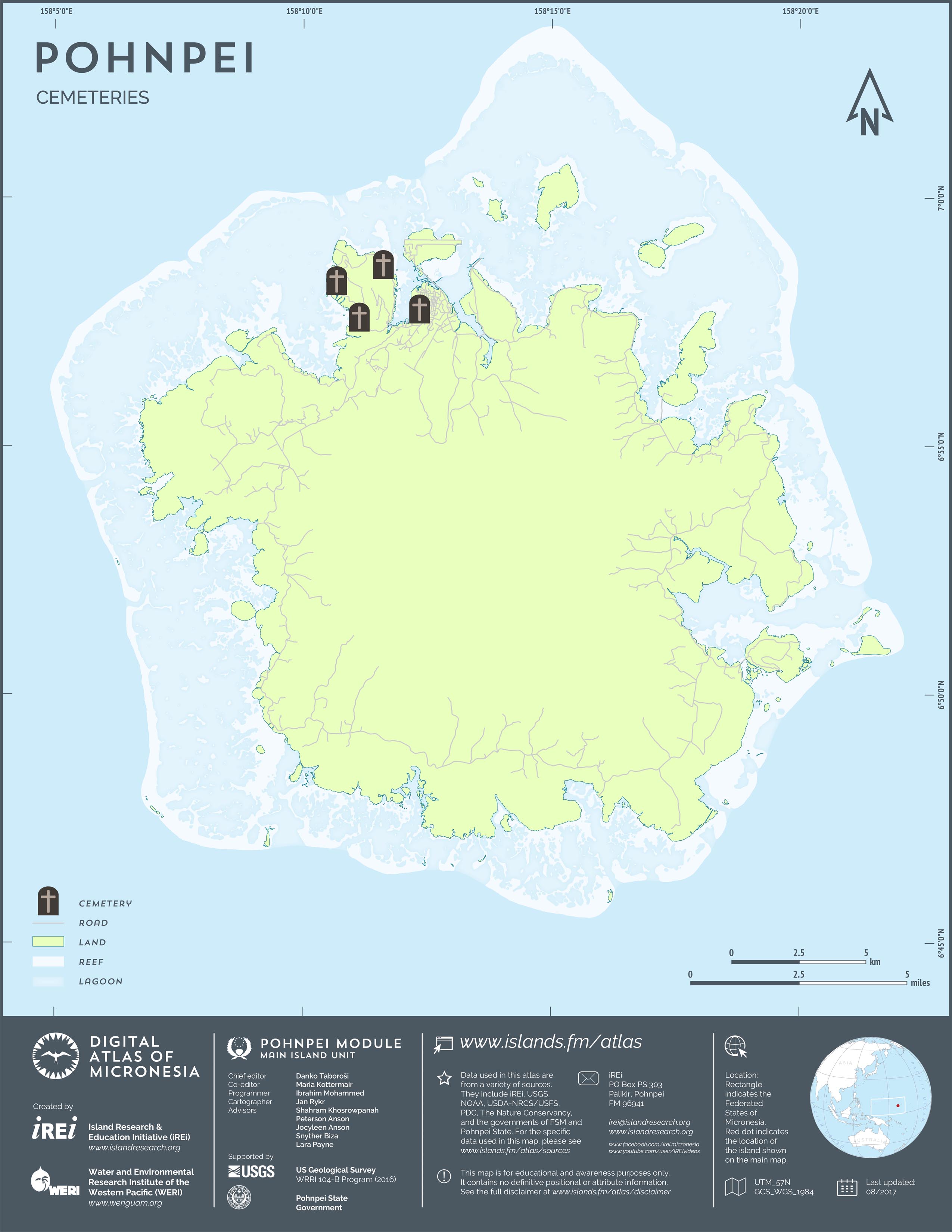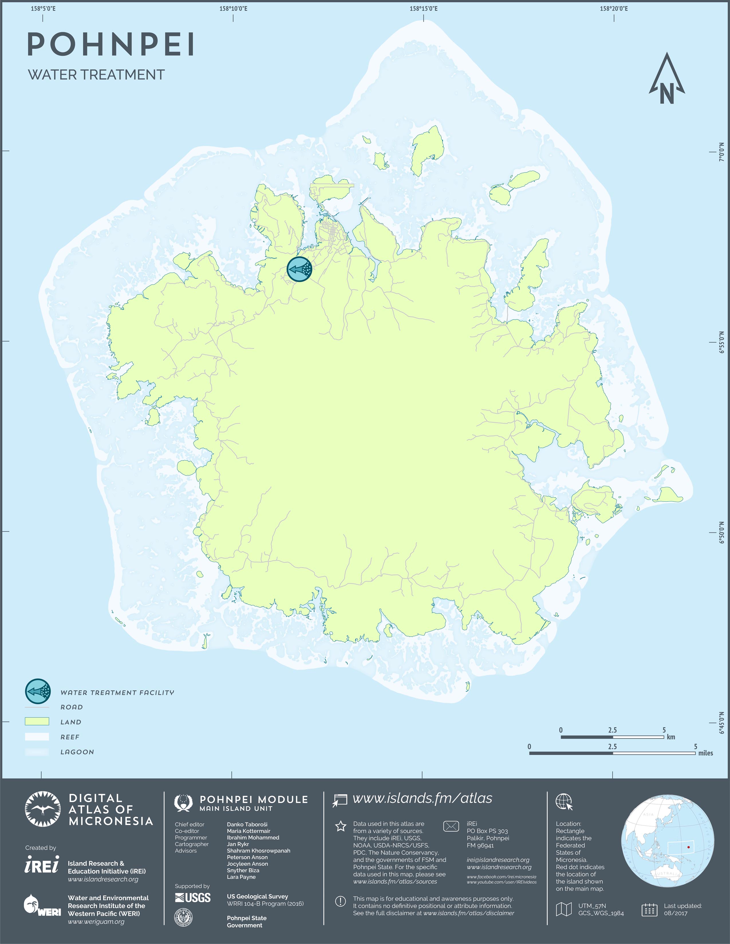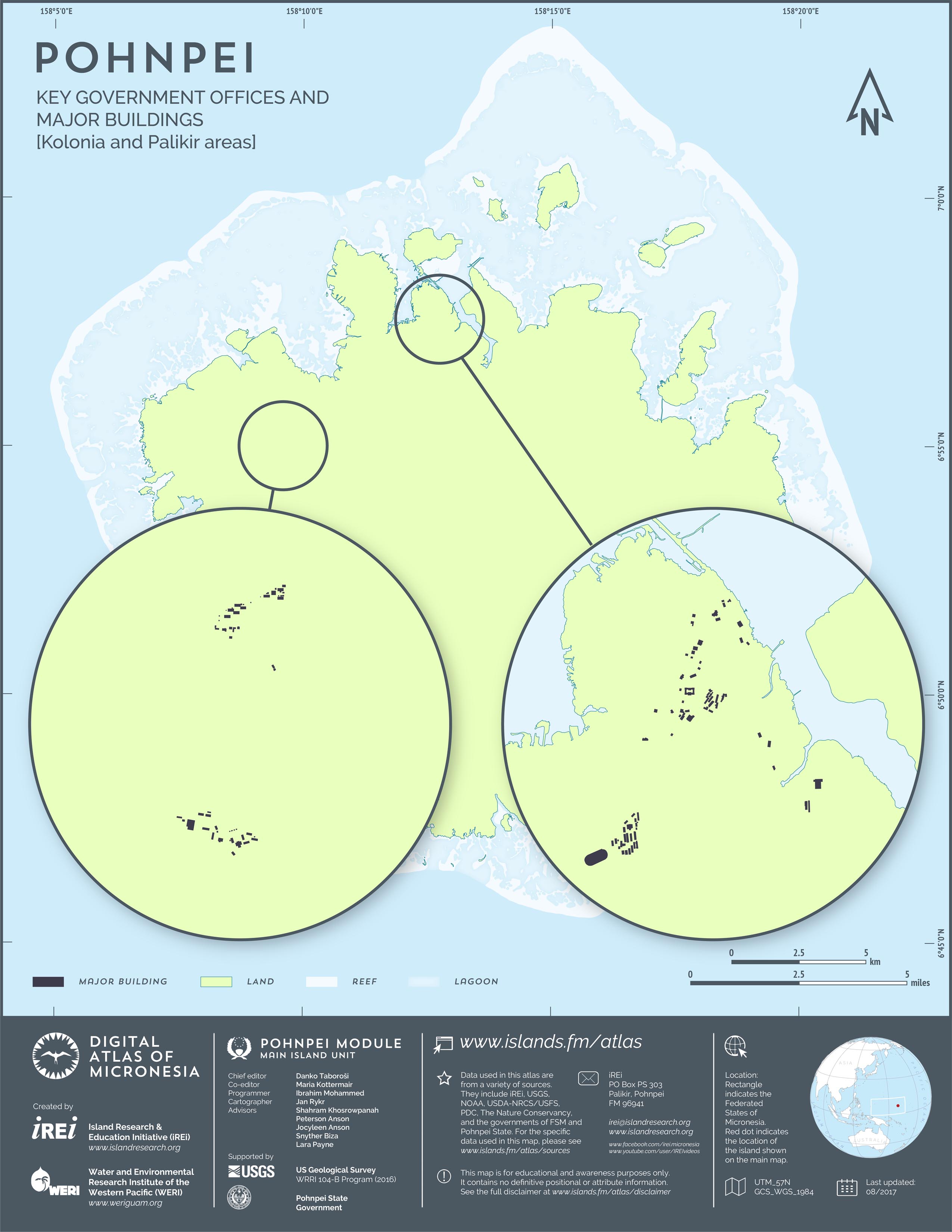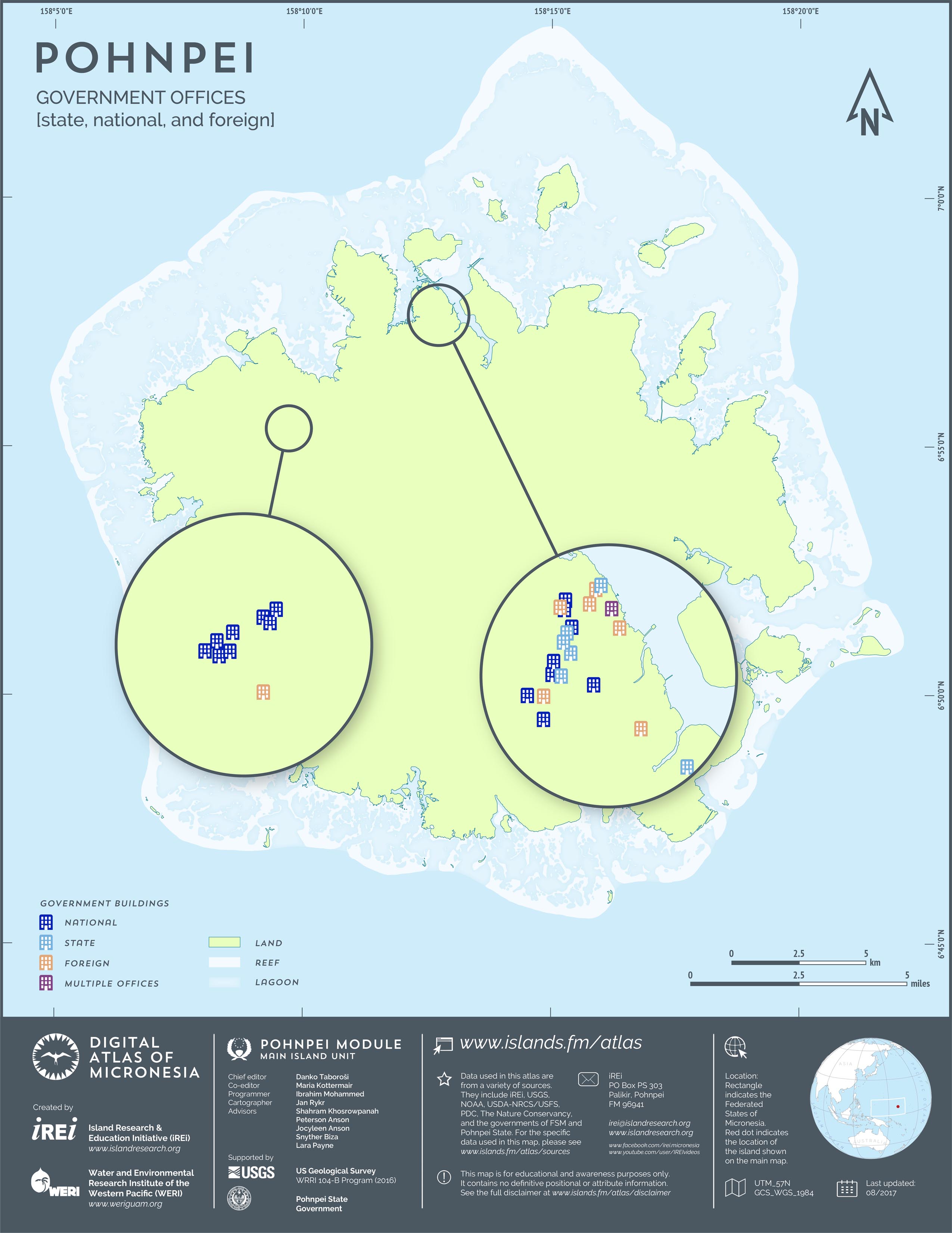 This map shows the road network on Pohnpei. It includes major roads as well as smaller paved and unpaved roads. The dataset was originally created by U.S. Geological Survey (USGS) (2001) for Digital Line Graphs (DLGs) used to show information on 1:25,000-scale topographic maps. It has been modified to reflect changes and add street names of selected roads throughout the years and using various sources including Kolonia Town Government, U.S. Department of Agriculture (USDA) – Natural Resources Conservation Service (NRCS), and Pohnpei State Government – Department of Land and Natural Resources (2013). A major update was performed by Island Research & Education Initiative (iREi) (2017) to reflect changes based on 2016 WorldView-3 satellite imagery by DigitalGlobe. The attribute information (name and type of road) has not been updated recently.