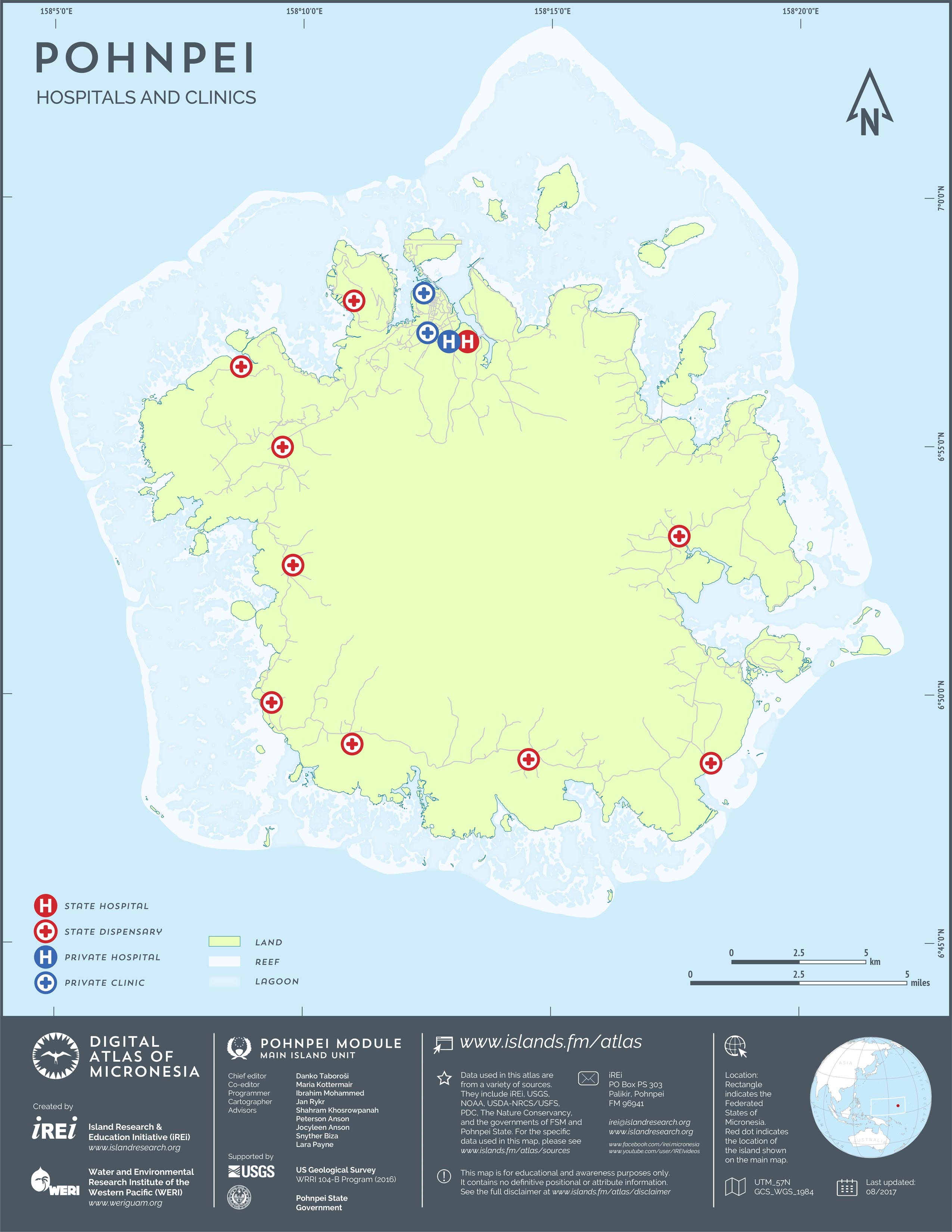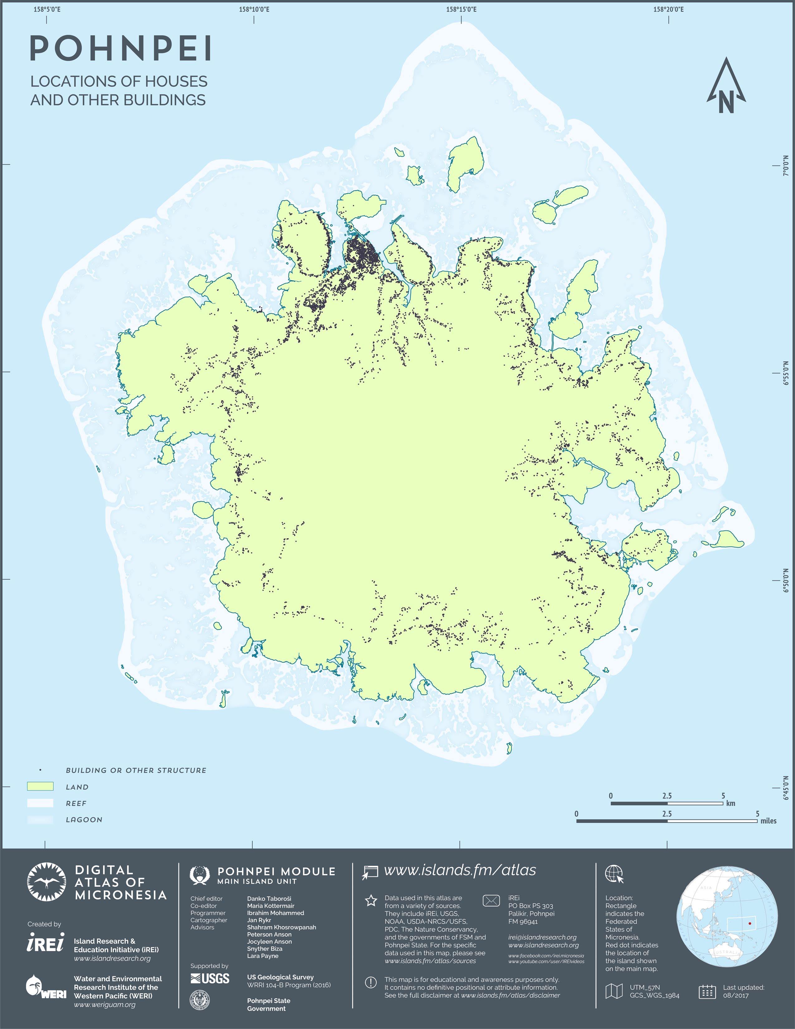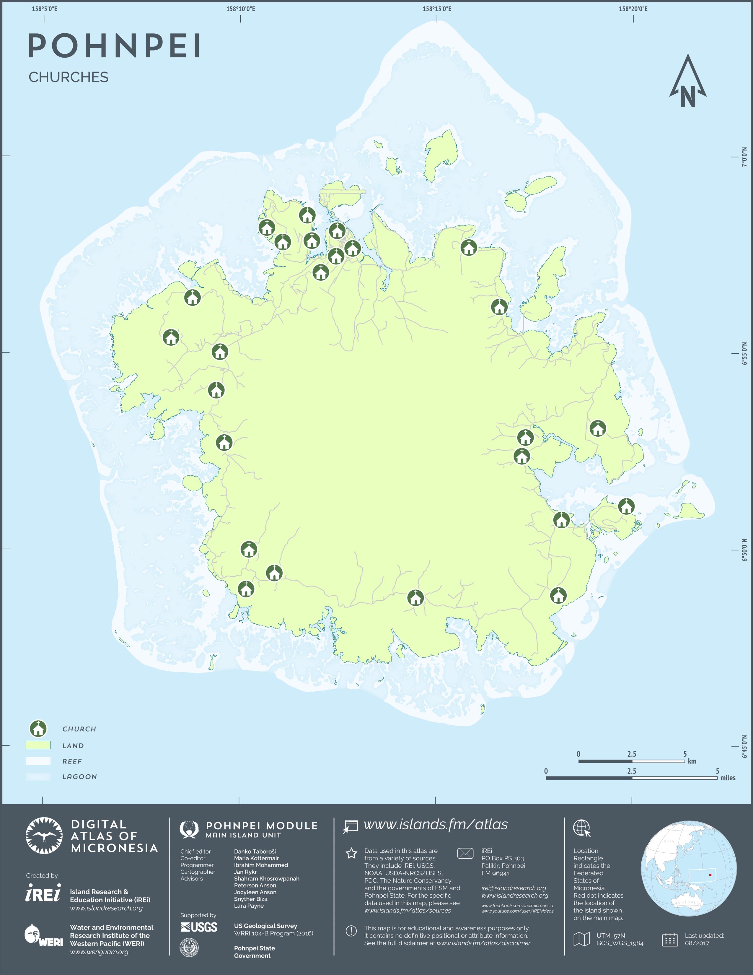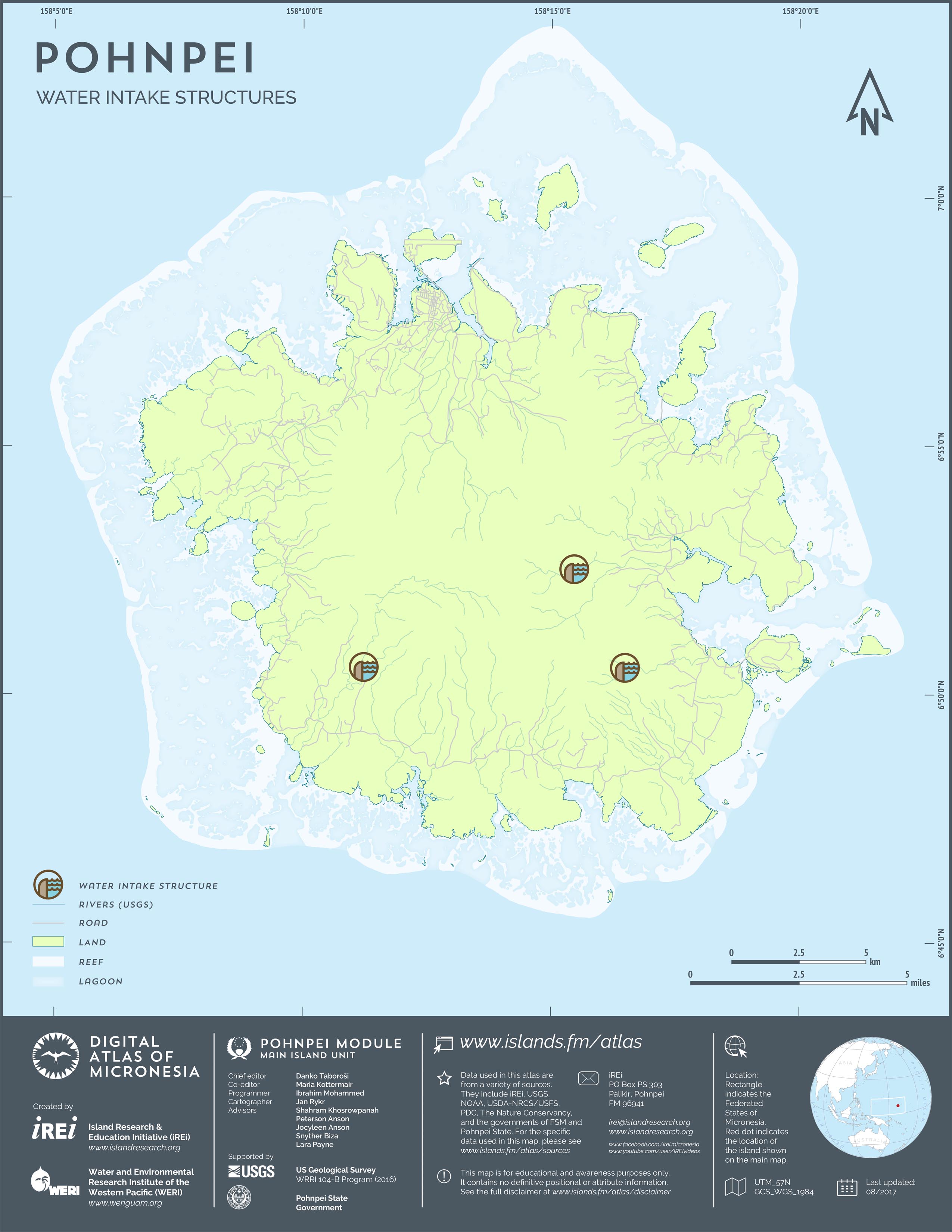 This map shows the road network on Pohnpei. It includes major roads as well as smaller paved and unpaved roads. The dataset was originally created by U.S. Geological Survey (USGS) (2001) for Digital Line Graphs (DLGs) used to show information on 1:25,000-scale topographic maps. It has been modified to reflect changes and add street names of selected roads throughout the years and using various sources including Kolonia Town Government, U.S. Department of Agriculture (USDA) – Natural Resources Conservation Service (NRCS), and Pohnpei State Government – Department of Land and Natural Resources (2013). A major update was performed by Island Research & Education Initiative (iREi) (2017) to reflect changes based on 2016 WorldView-3 satellite imagery by DigitalGlobe. The attribute information (name and type of road) has not been updated recently.