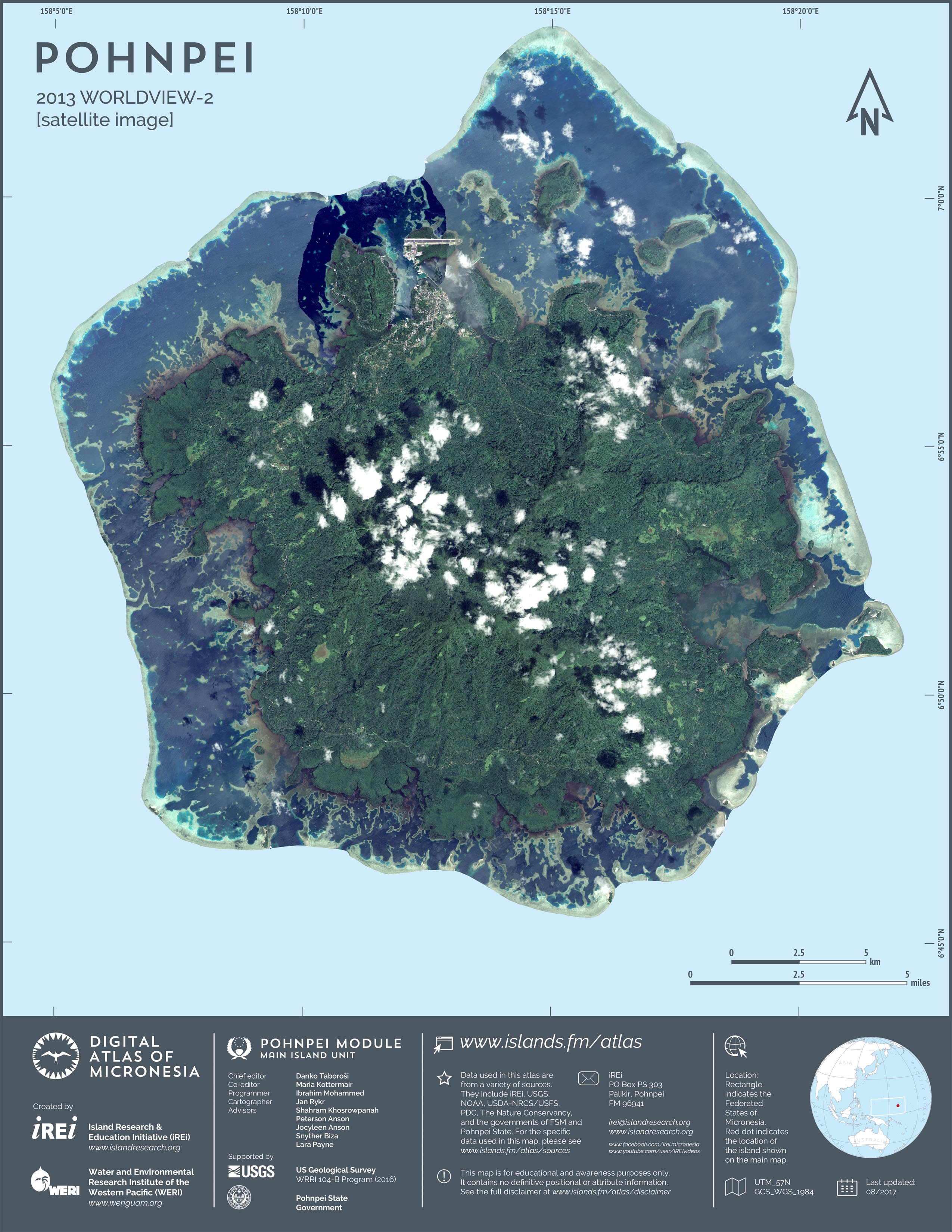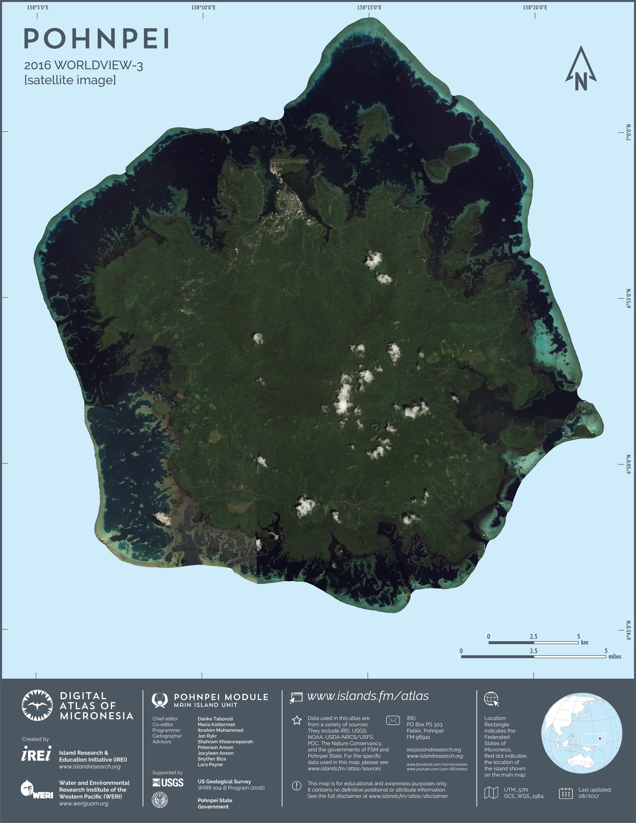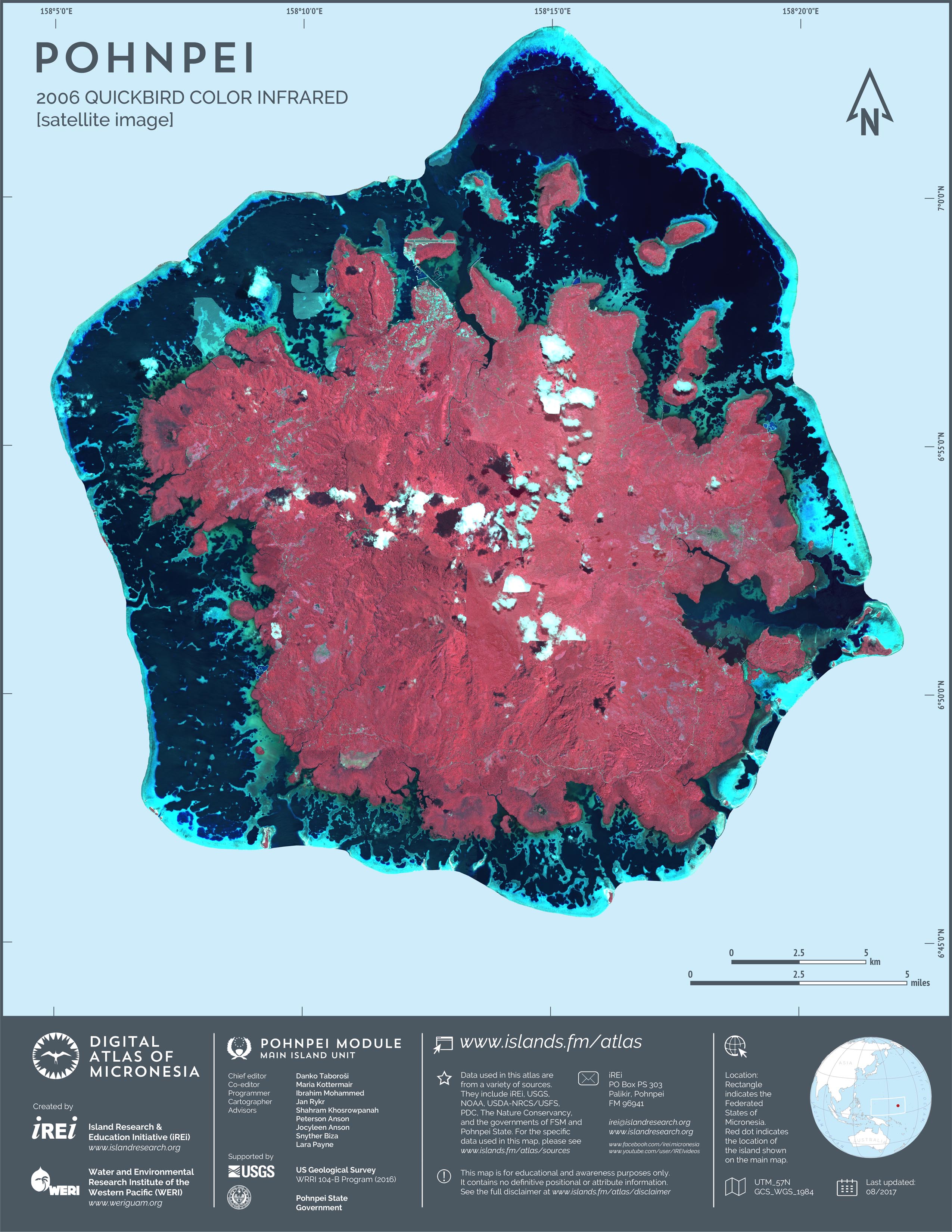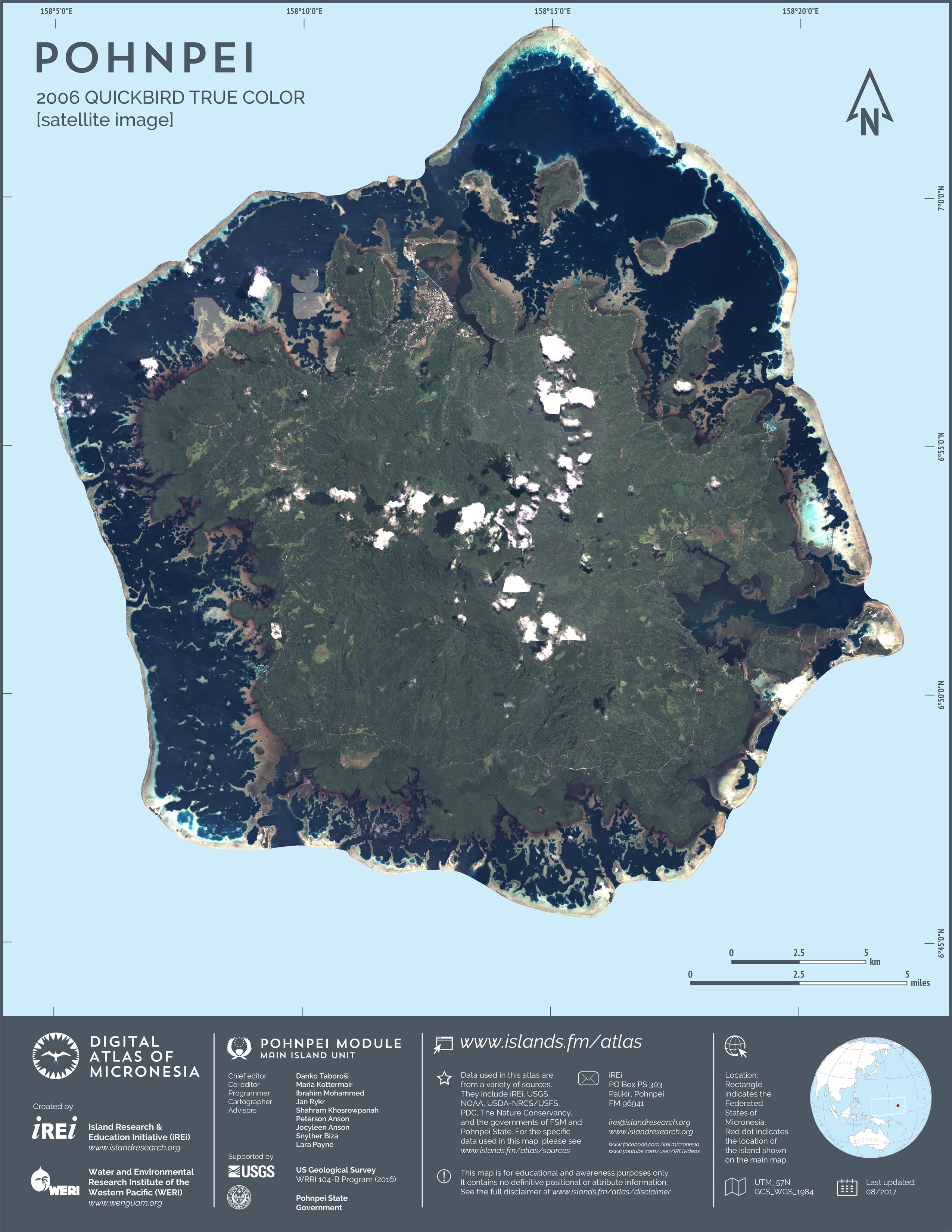 This map showcases 2006 satellite imagery of Pohnpei taken by QuickBird satellite by DigitalGlobe. The data were purchased and processed by U.S. Department of Agriculture (USDA) – Natural Resources Conservation Service (NRCS). The image shown here is in natural color. Image portions that fall outside the barrier reef of Pohnpei are omitted from the map.