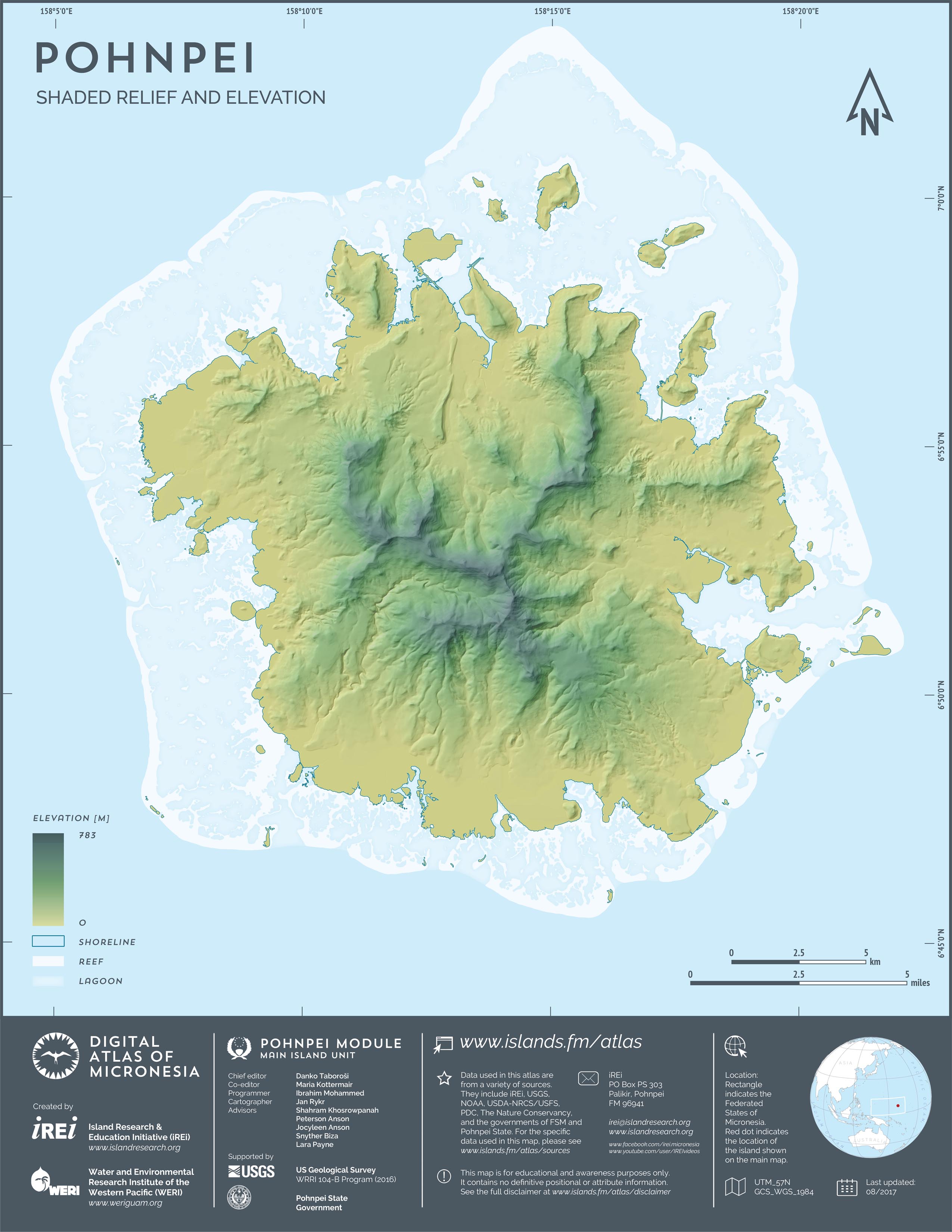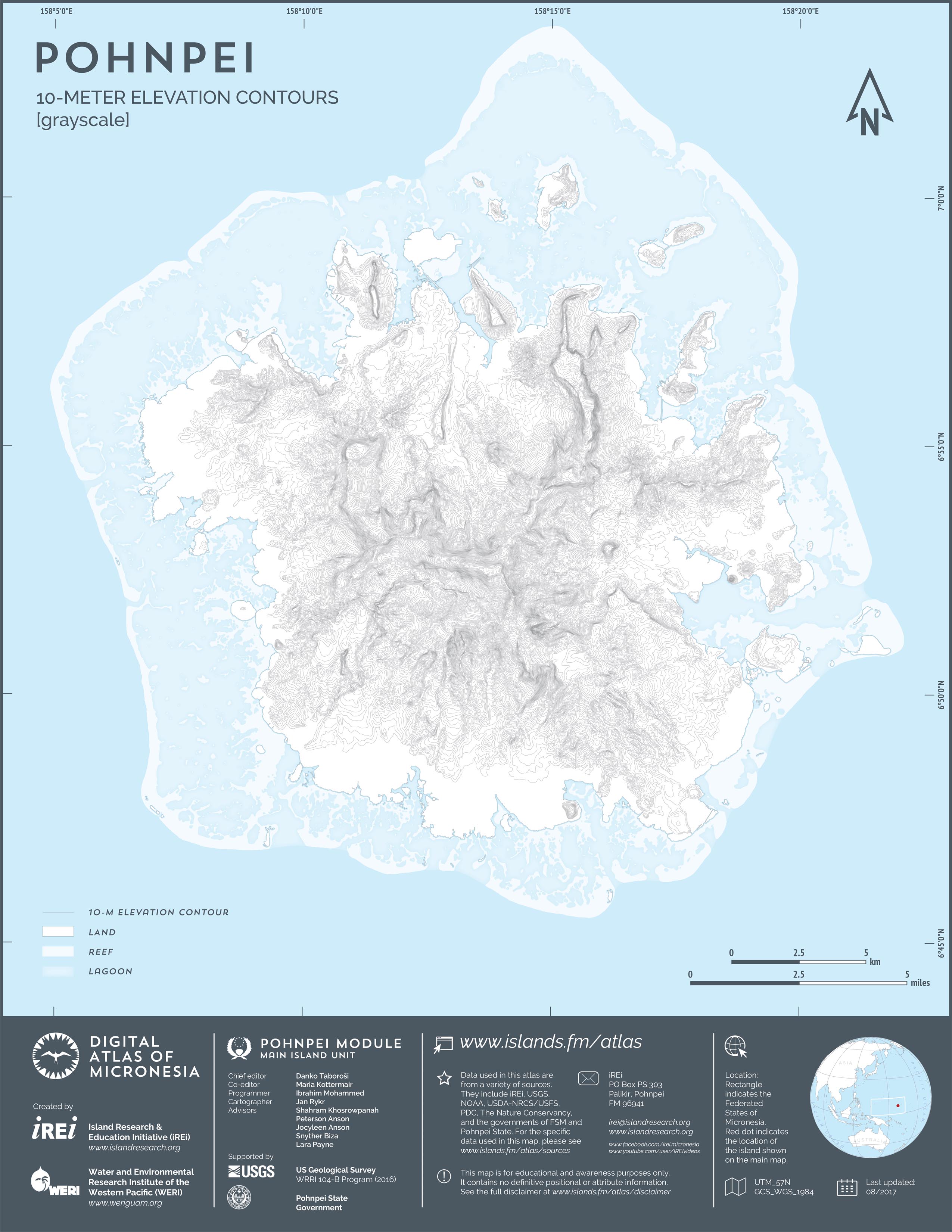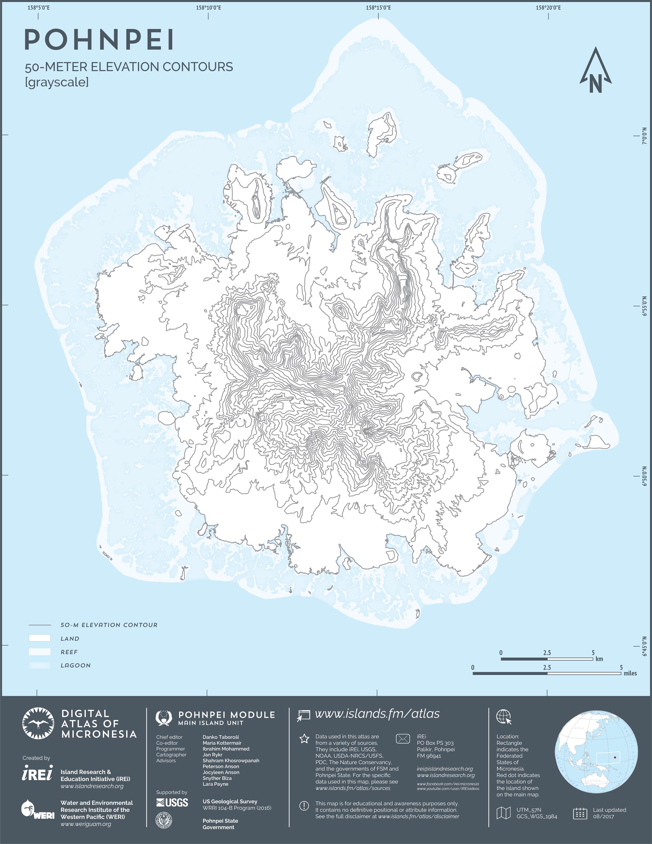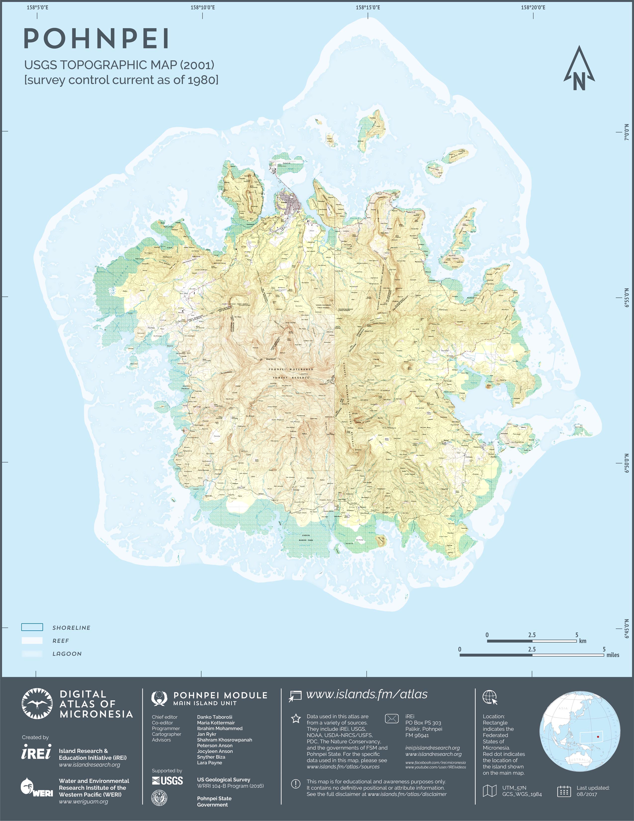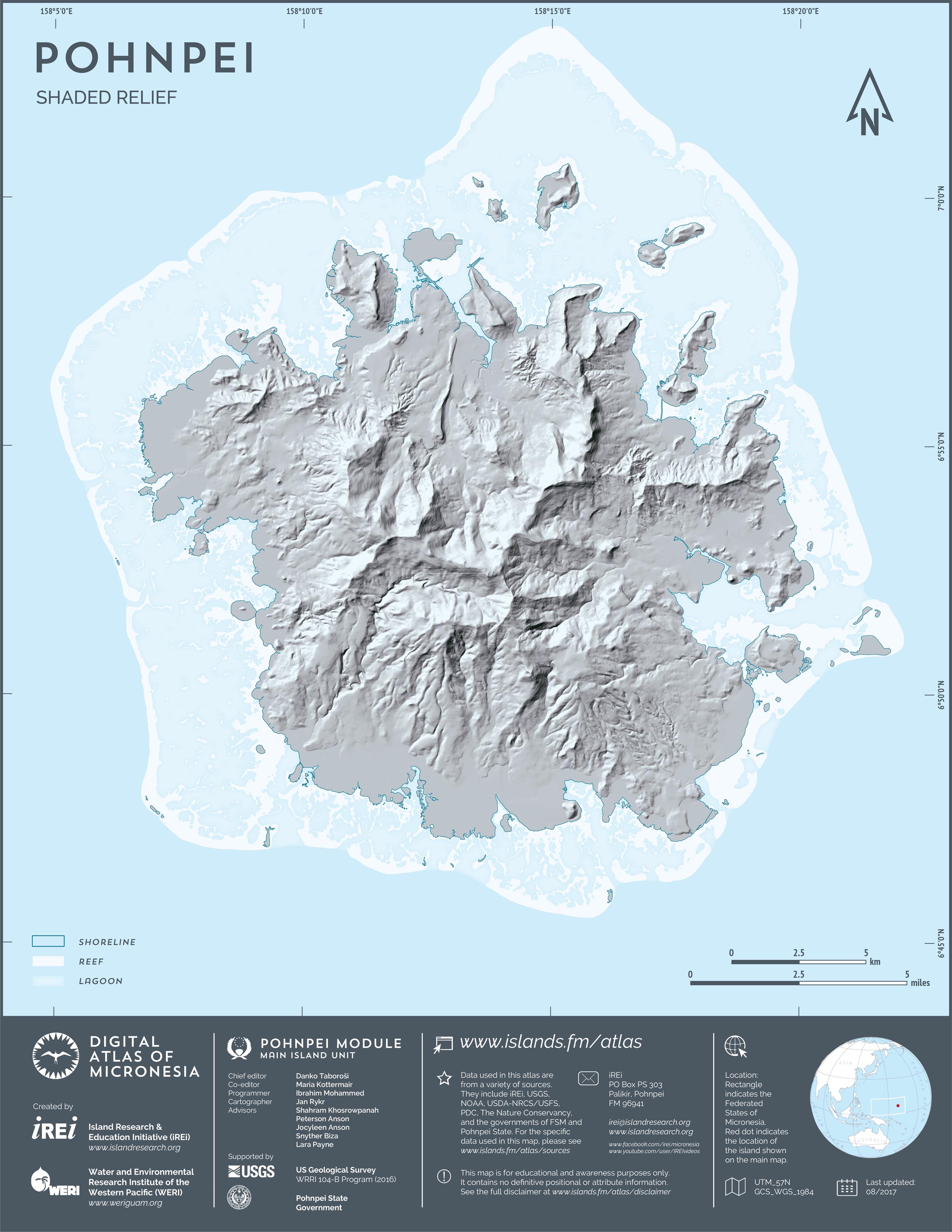 This map showcases 2006 satellite imagery of Pohnpei taken by QuickBird satellite by DigitalGlobe. The data were purchased and processed by U.S. Department of Agriculture (USDA) – Natural Resources Conservation Service (NRCS). The image shown here is in natural color. Image portions that fall outside the barrier reef of Pohnpei are omitted from the map.