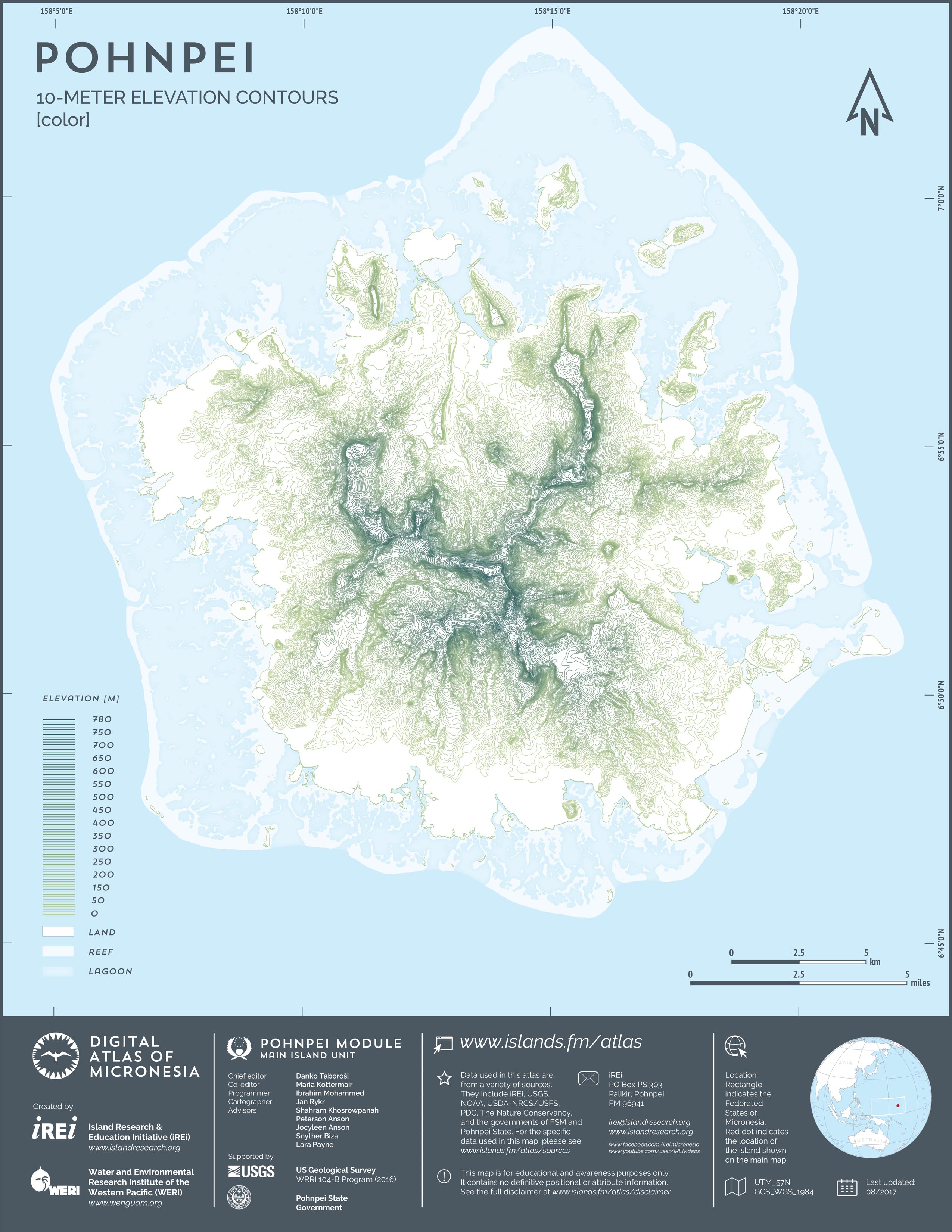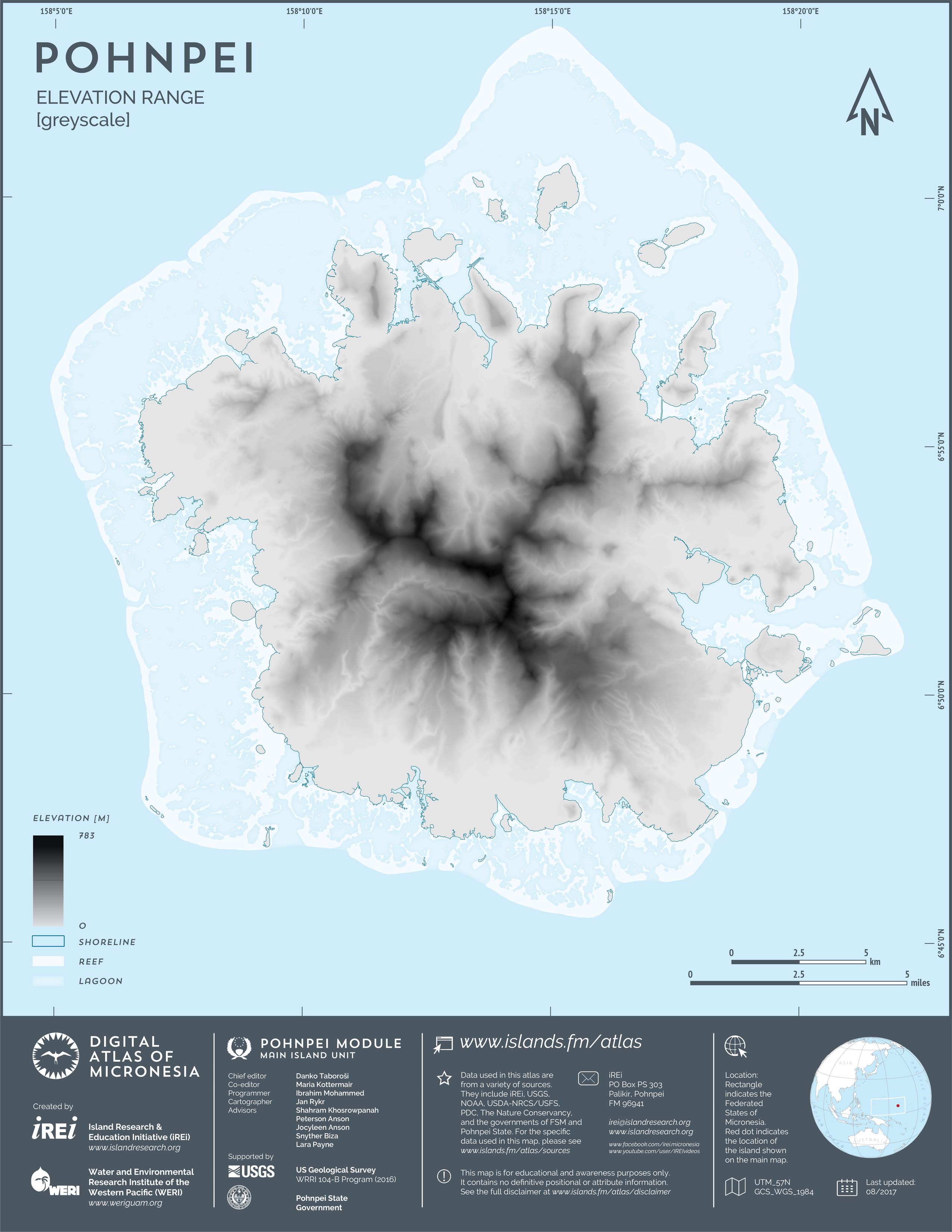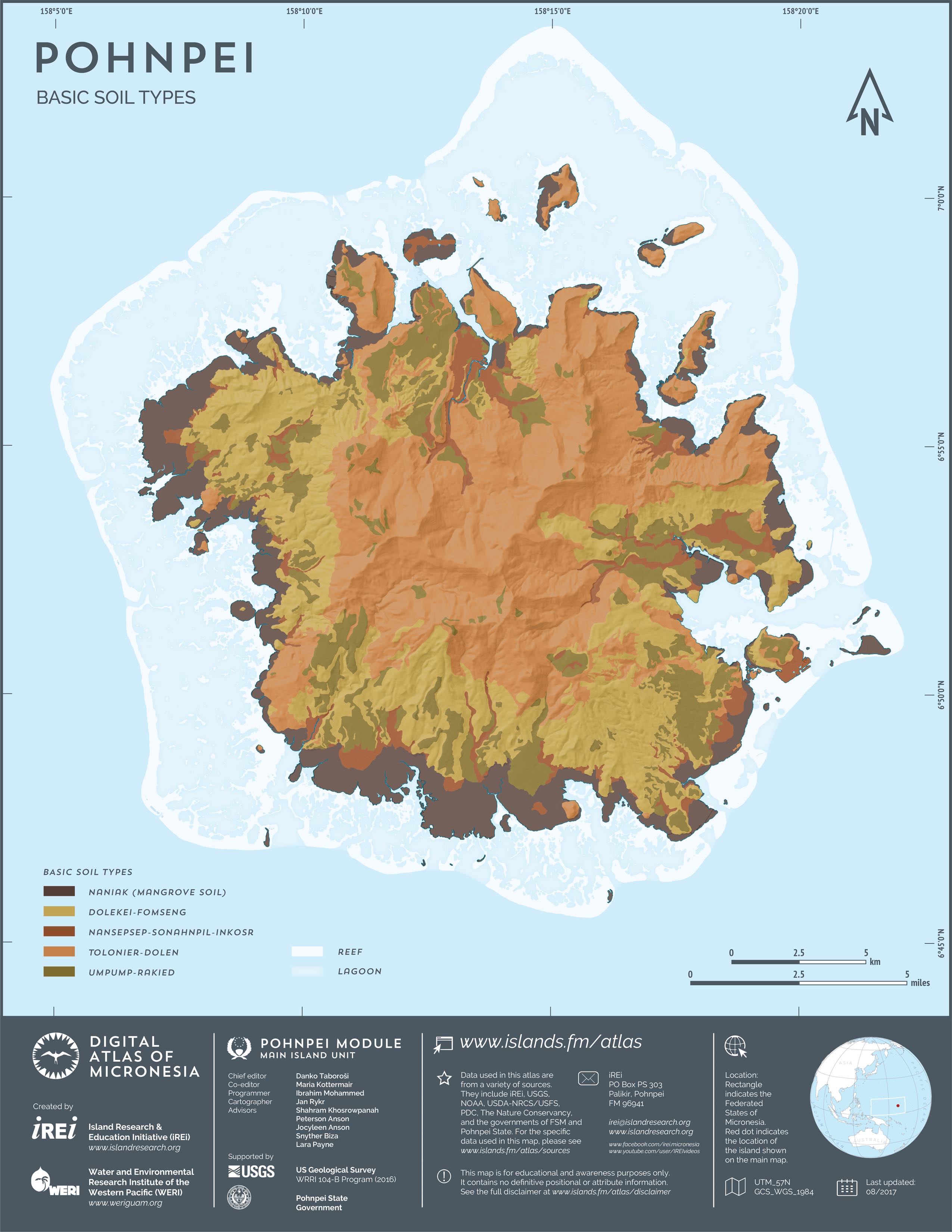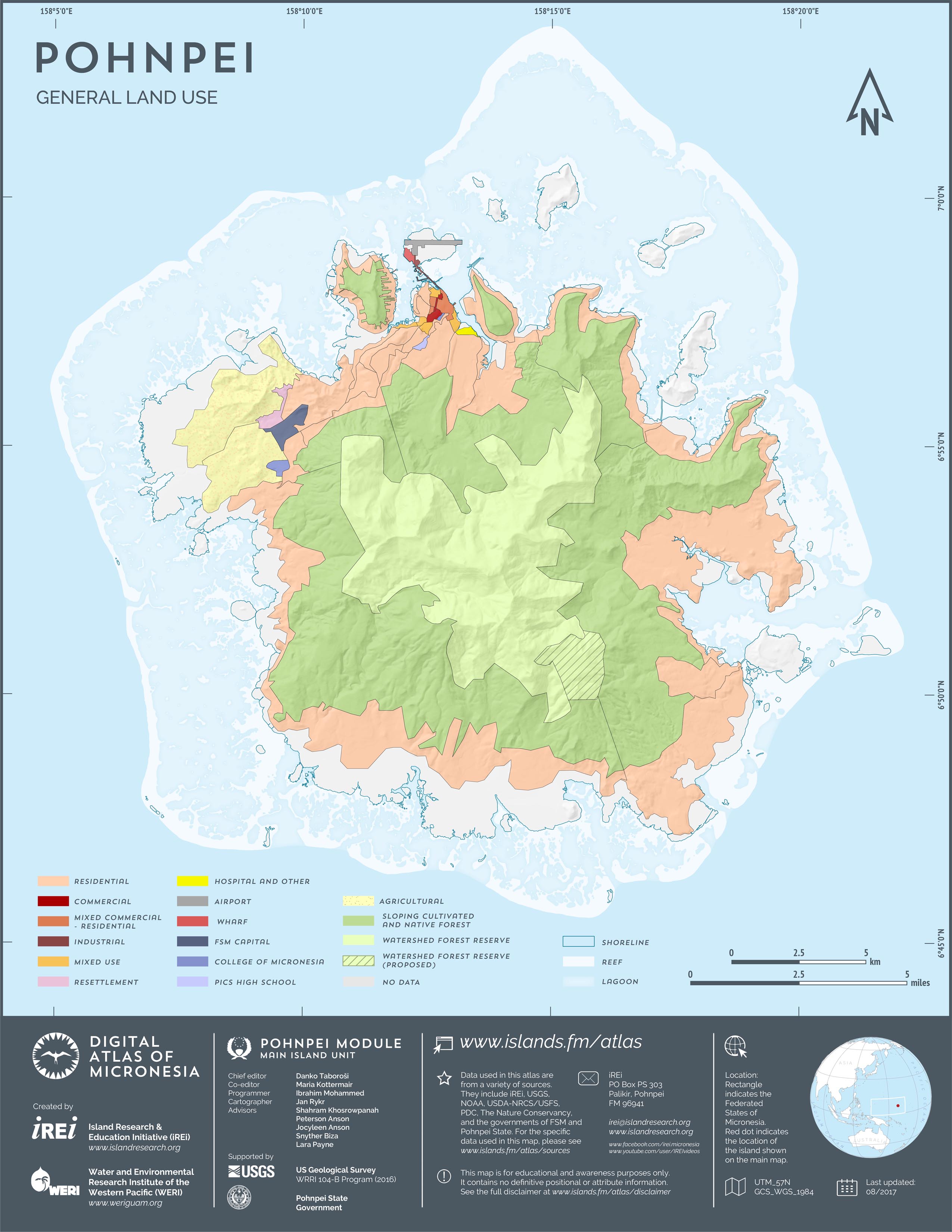 This map showcases 2006 satellite imagery of Pohnpei taken by QuickBird satellite by DigitalGlobe. The data were purchased and processed by U.S. Department of Agriculture (USDA) – Natural Resources Conservation Service (NRCS). The image shown here is in natural color. Image portions that fall outside the barrier reef of Pohnpei are omitted from the map.