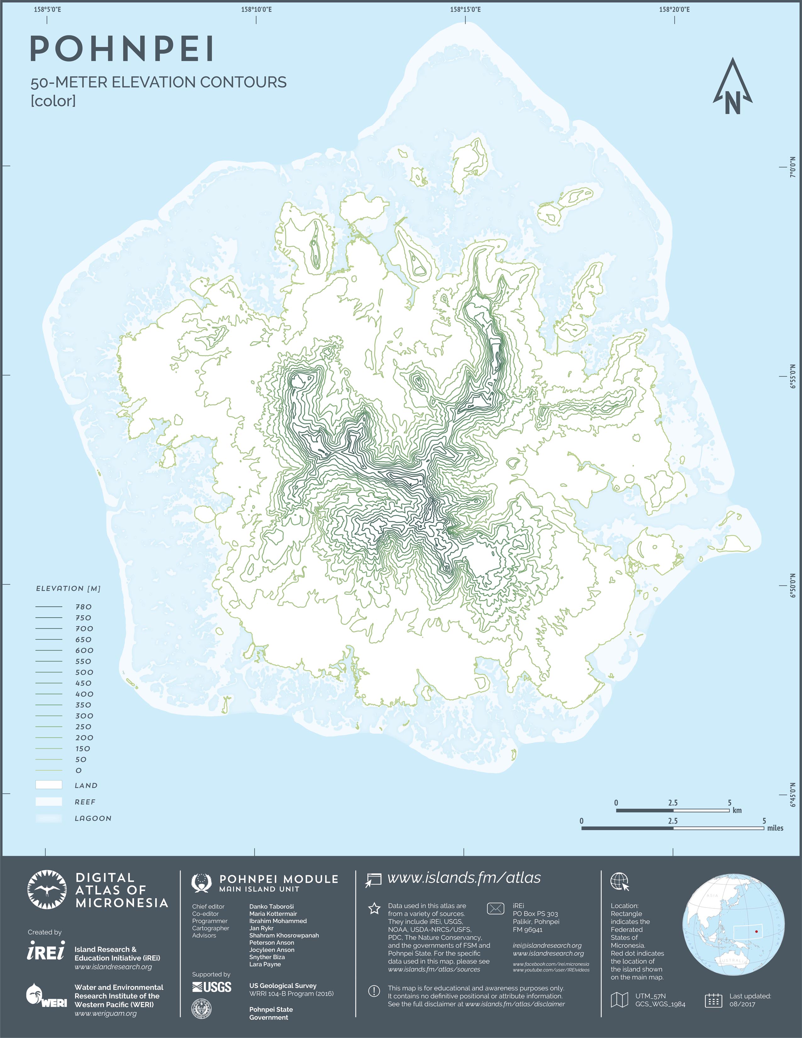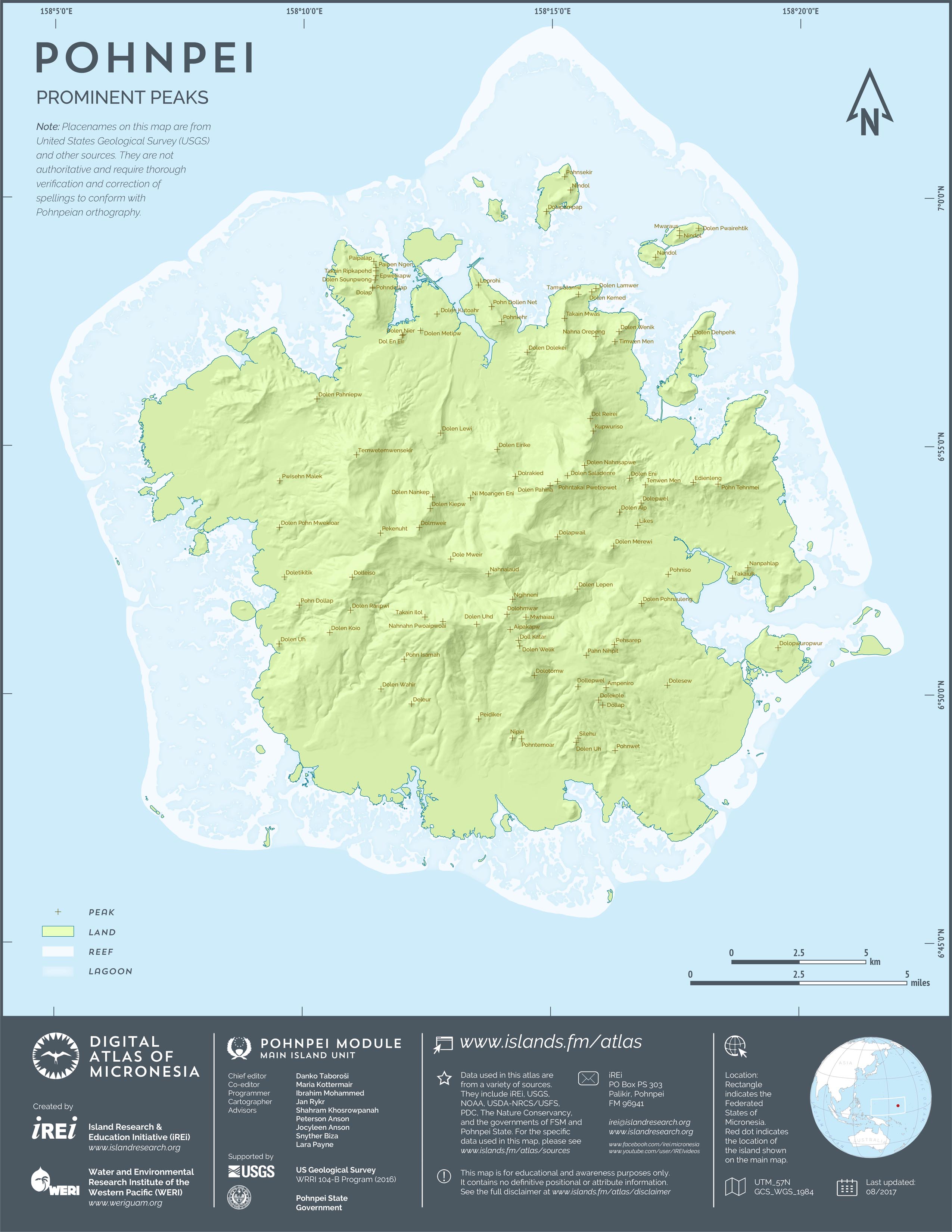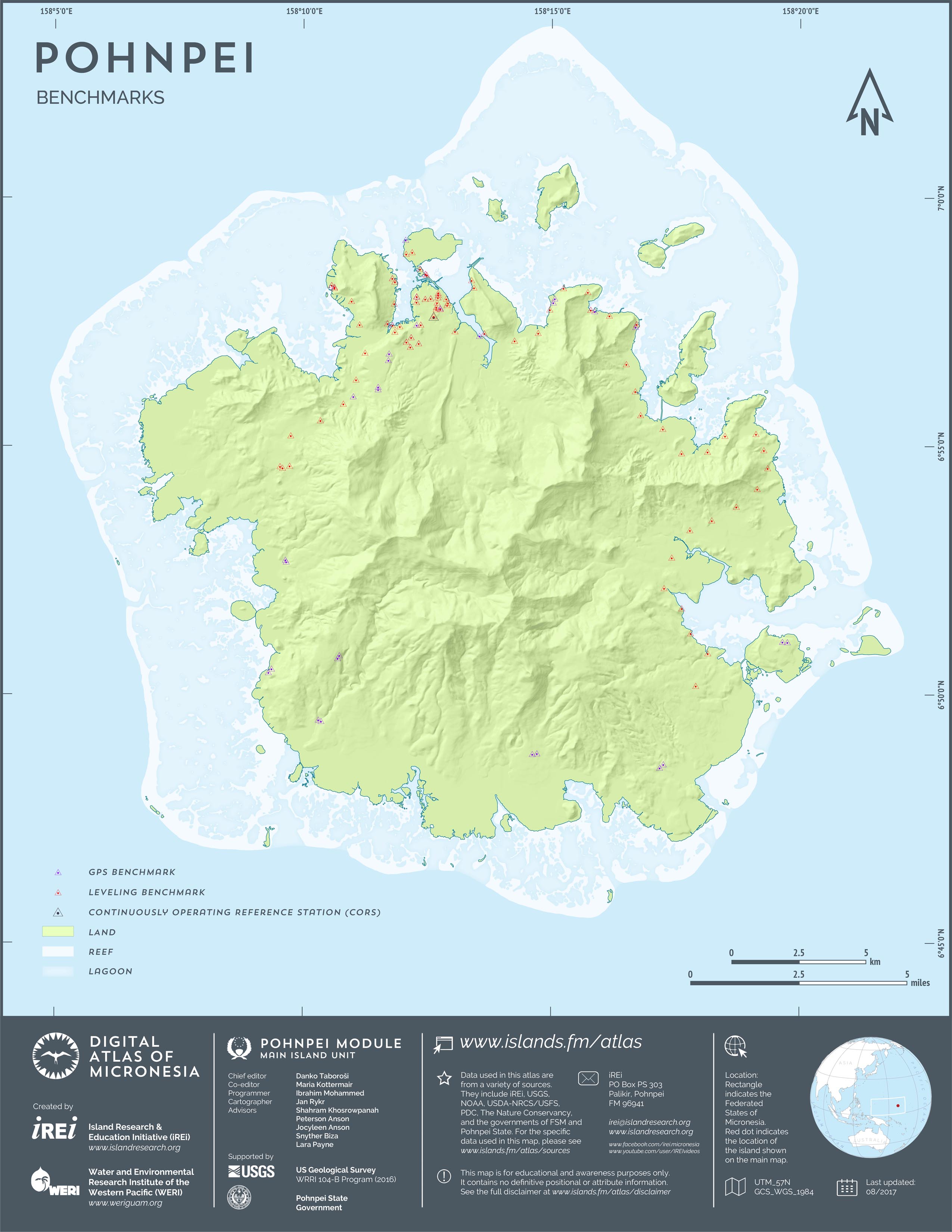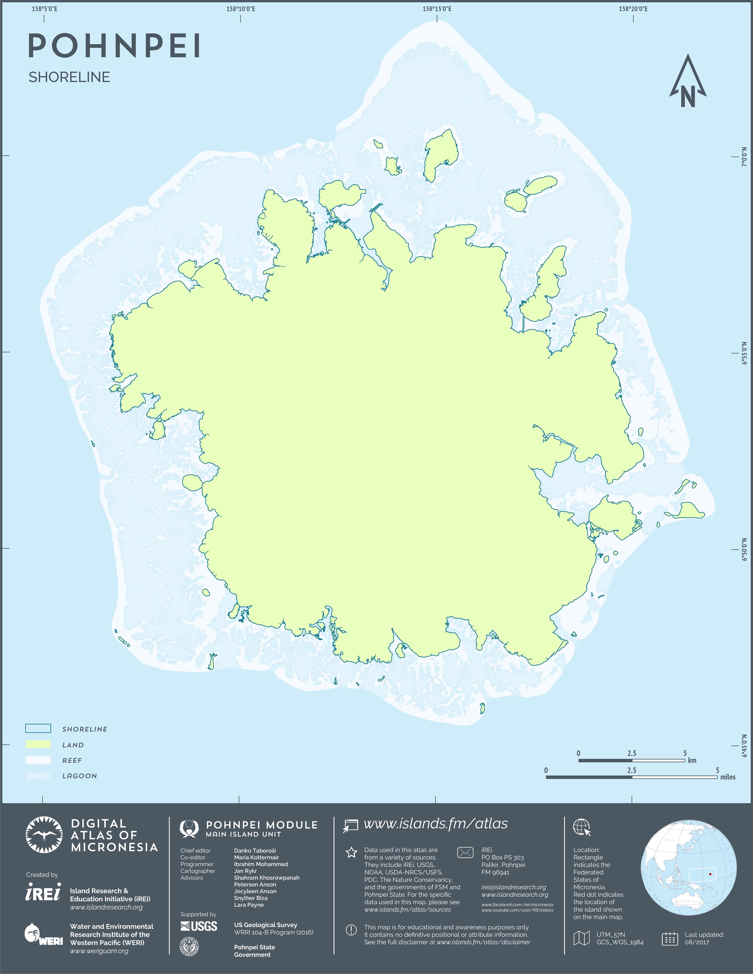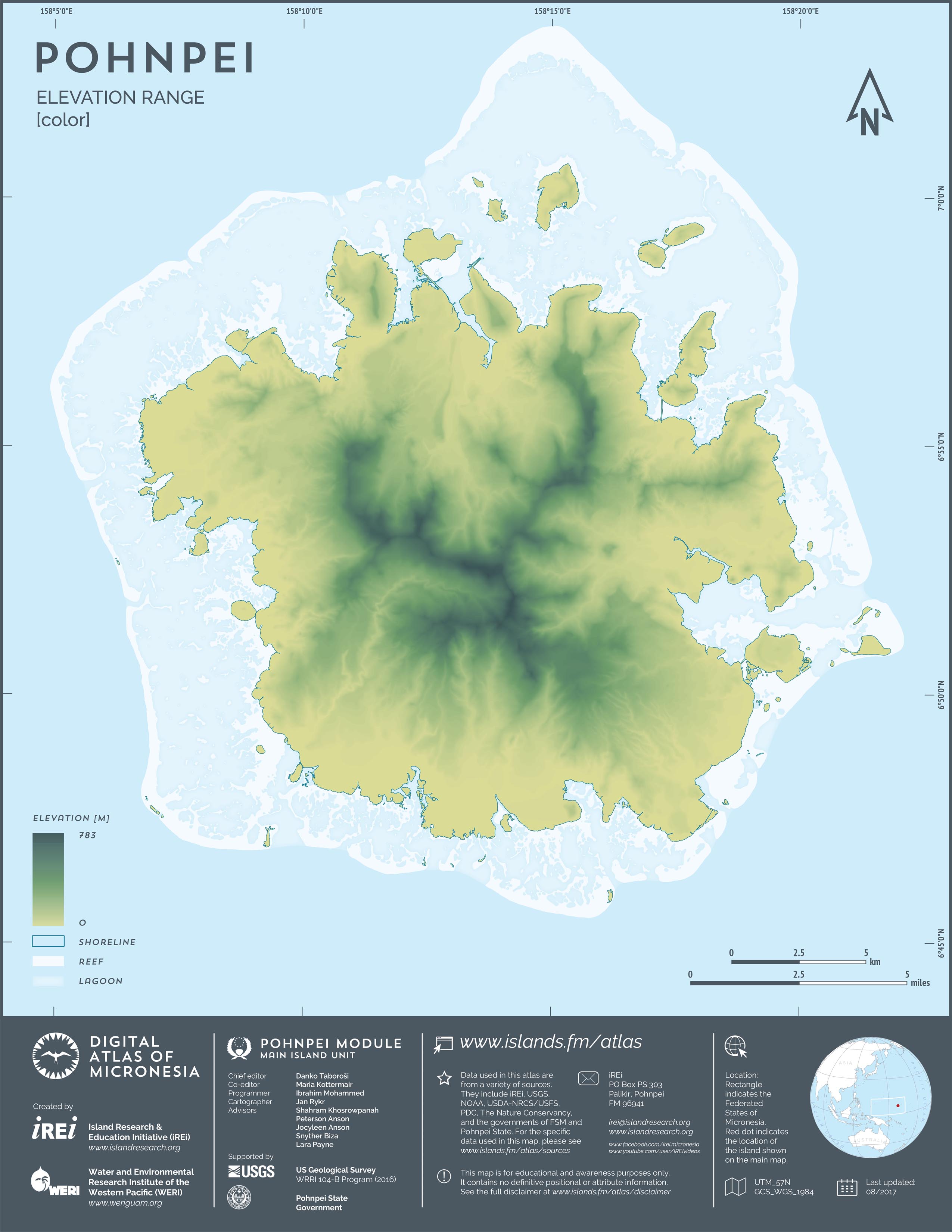 This map showcases 2006 satellite imagery of Pohnpei taken by QuickBird satellite by DigitalGlobe. The data were purchased and processed by U.S. Department of Agriculture (USDA) – Natural Resources Conservation Service (NRCS). The image shown here is in natural color. Image portions that fall outside the barrier reef of Pohnpei are omitted from the map.