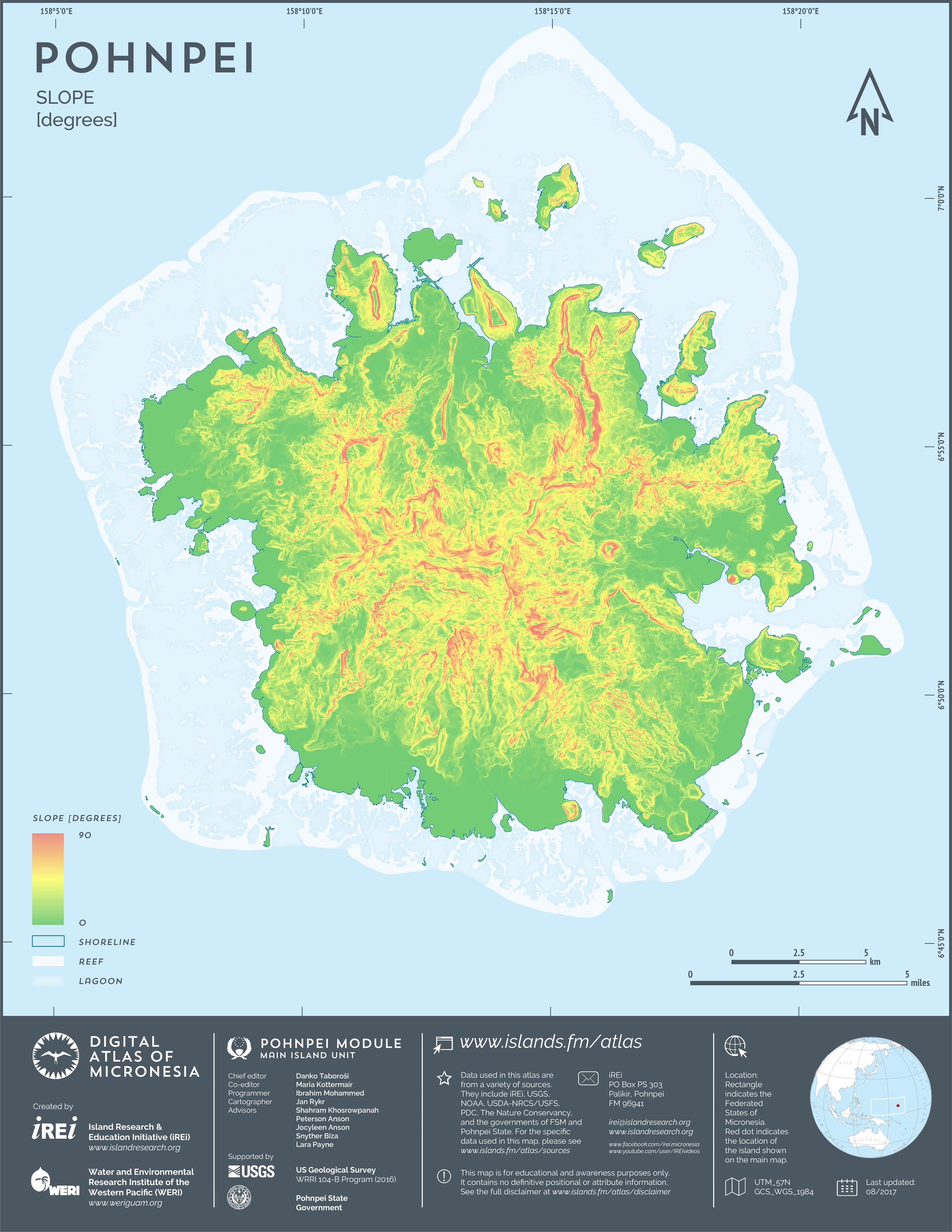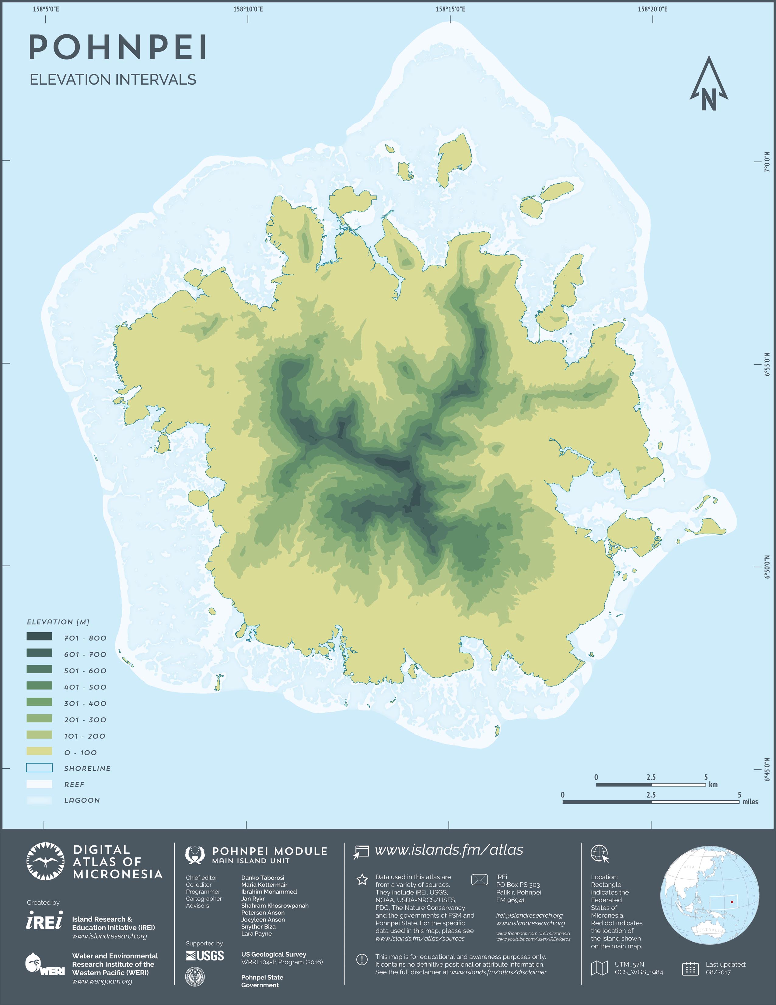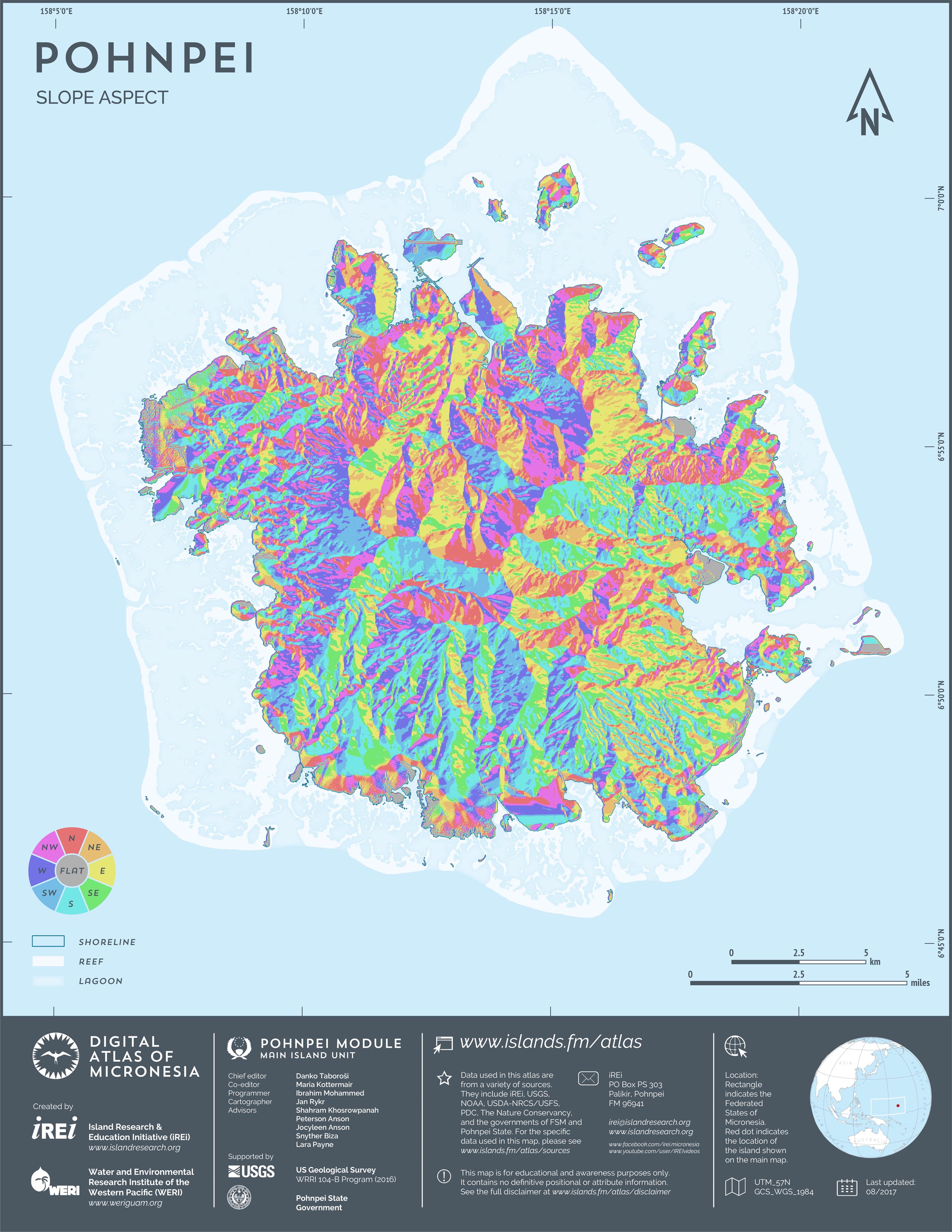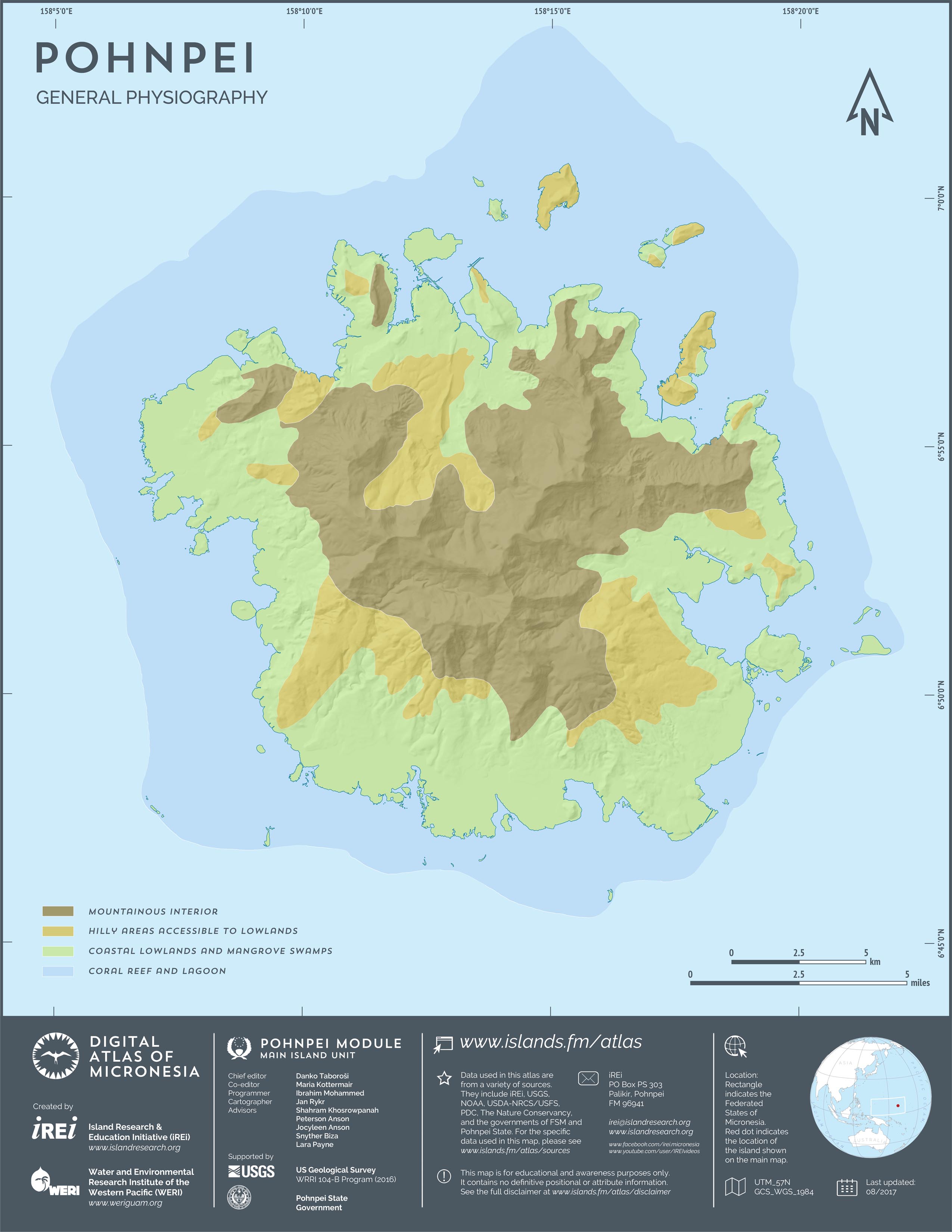 This map showcases 2006 satellite imagery of Pohnpei taken by QuickBird satellite by DigitalGlobe. The data were purchased and processed by U.S. Department of Agriculture (USDA) – Natural Resources Conservation Service (NRCS). The image shown here is in natural color. Image portions that fall outside the barrier reef of Pohnpei are omitted from the map.