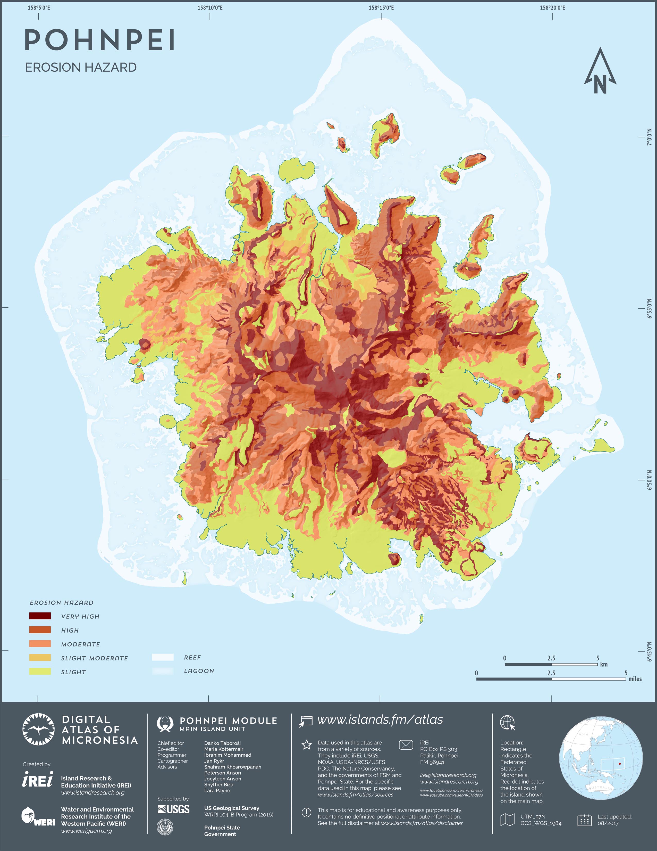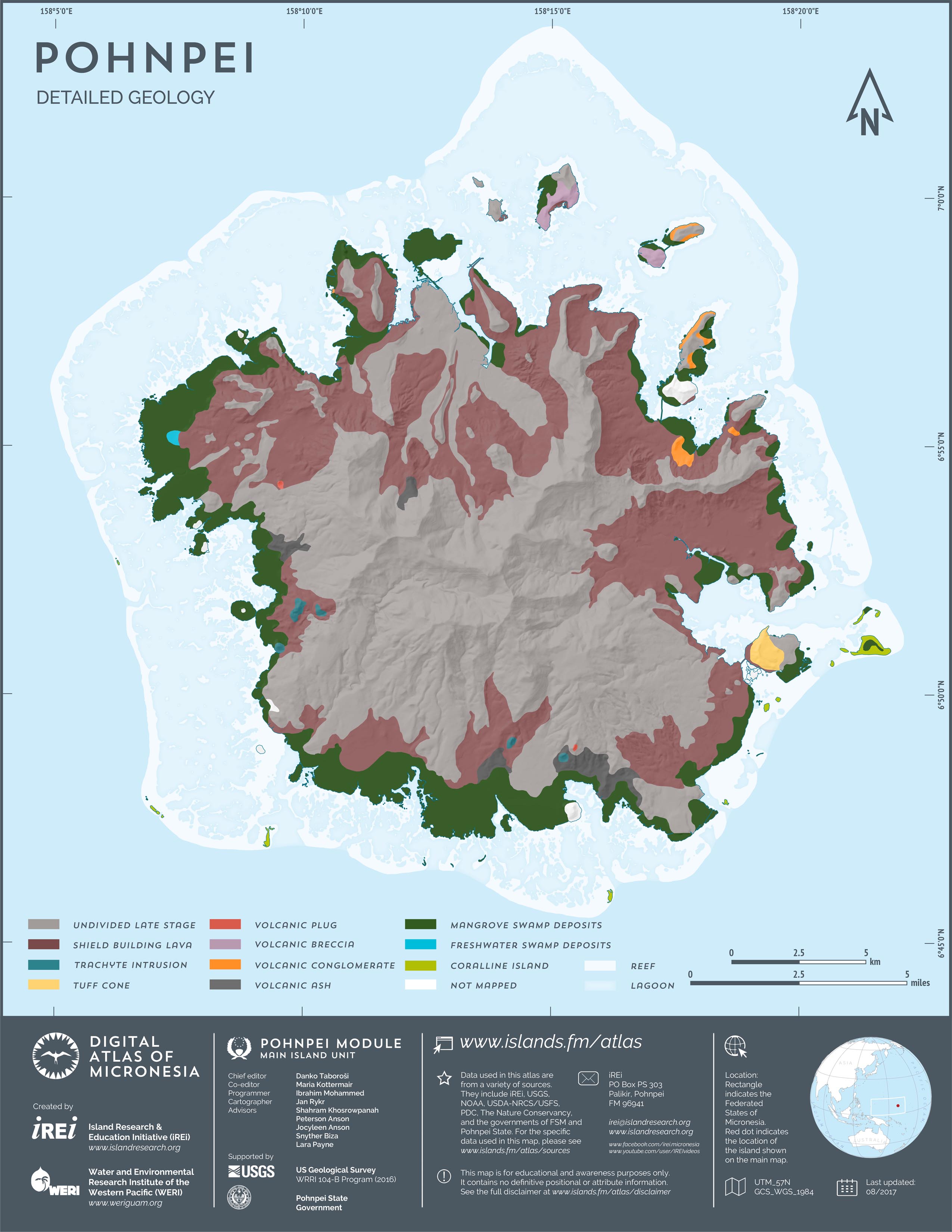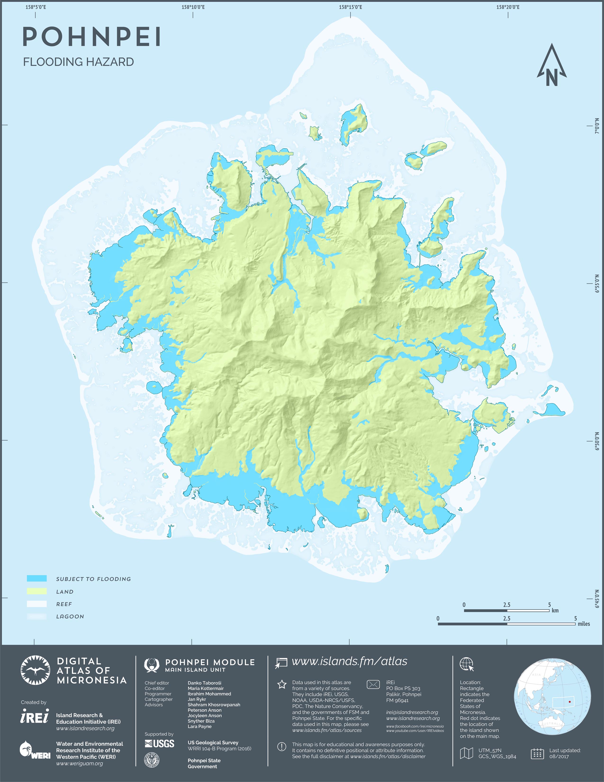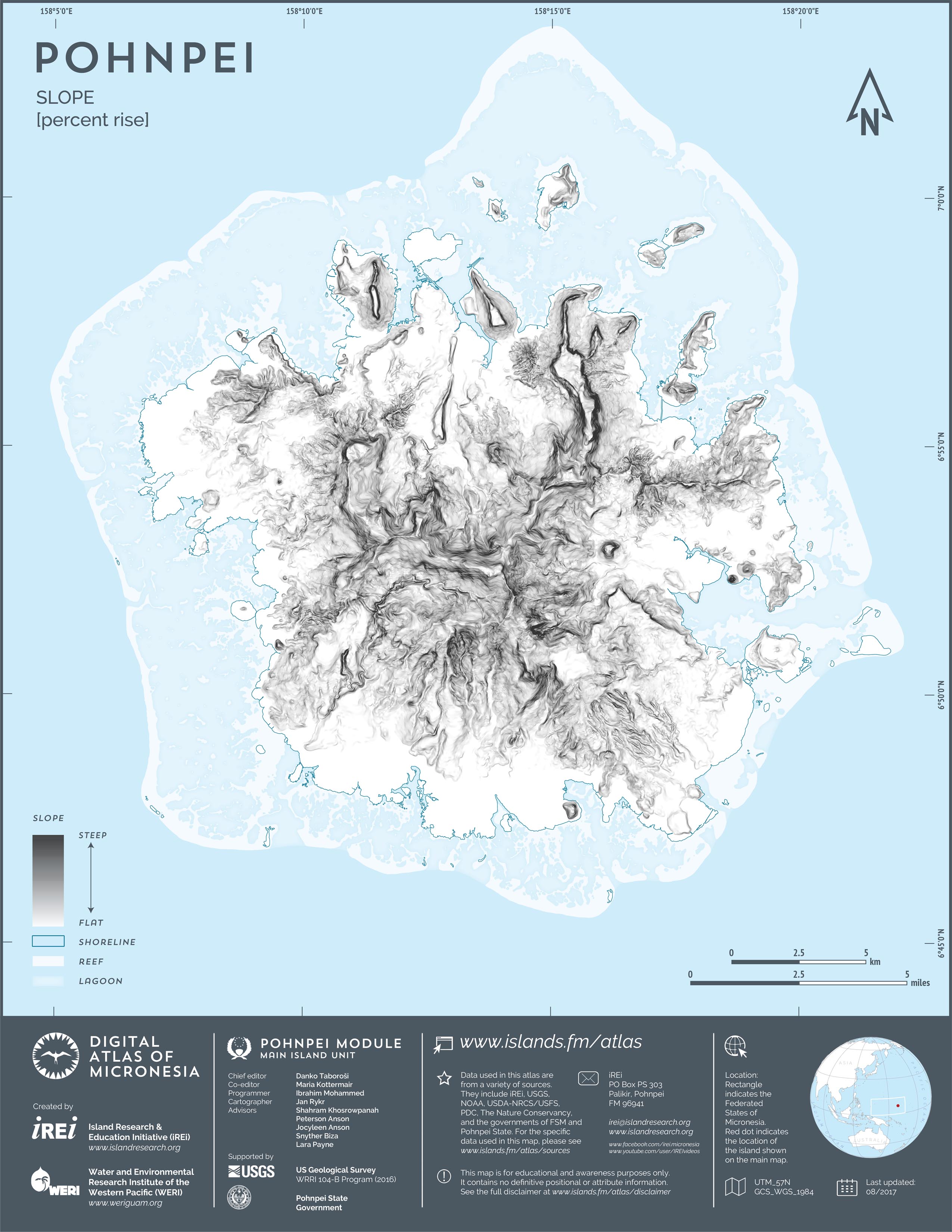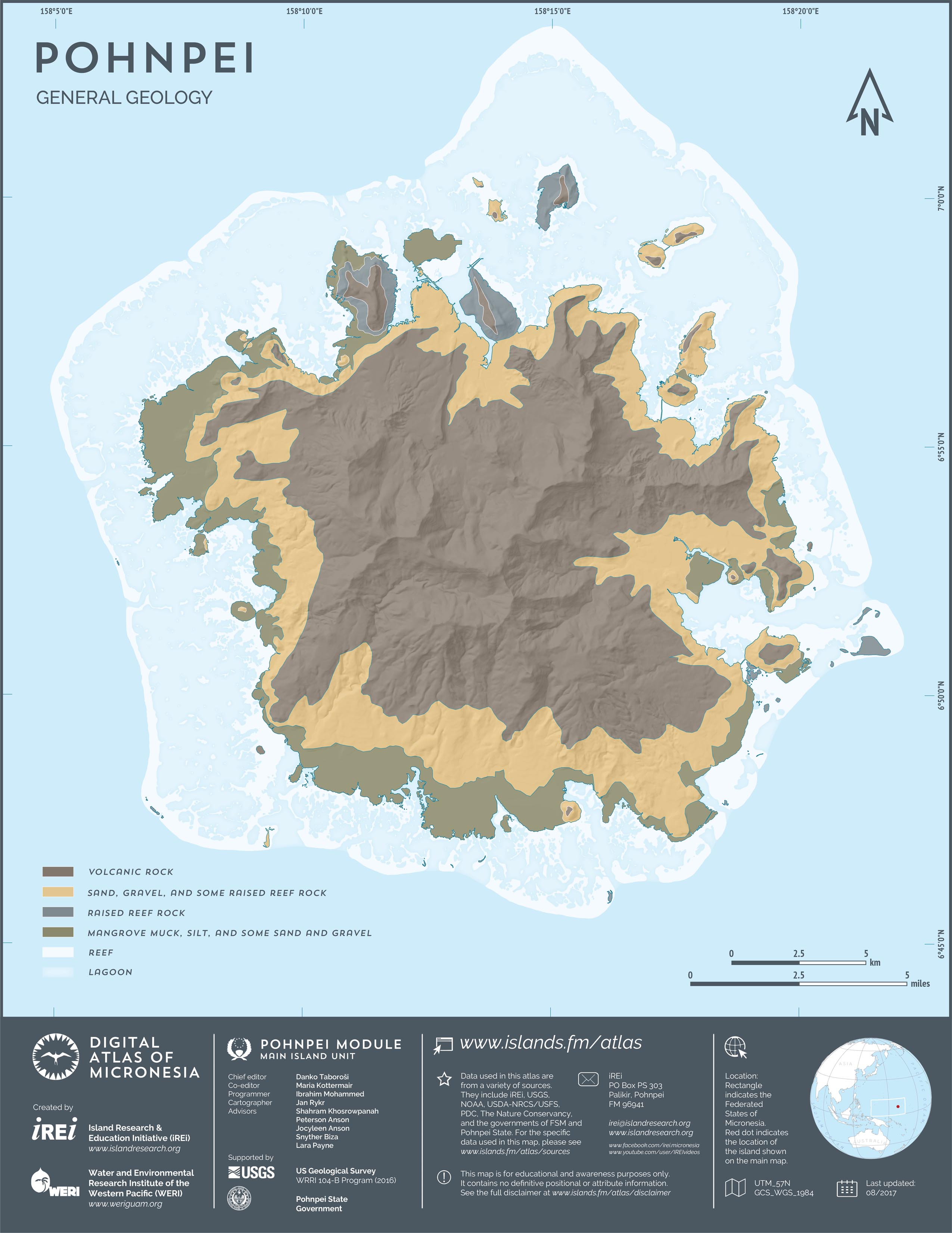 This map showcases 2006 satellite imagery of Pohnpei taken by QuickBird satellite by DigitalGlobe. The data were purchased and processed by U.S. Department of Agriculture (USDA) – Natural Resources Conservation Service (NRCS). The image shown here is in natural color. Image portions that fall outside the barrier reef of Pohnpei are omitted from the map.