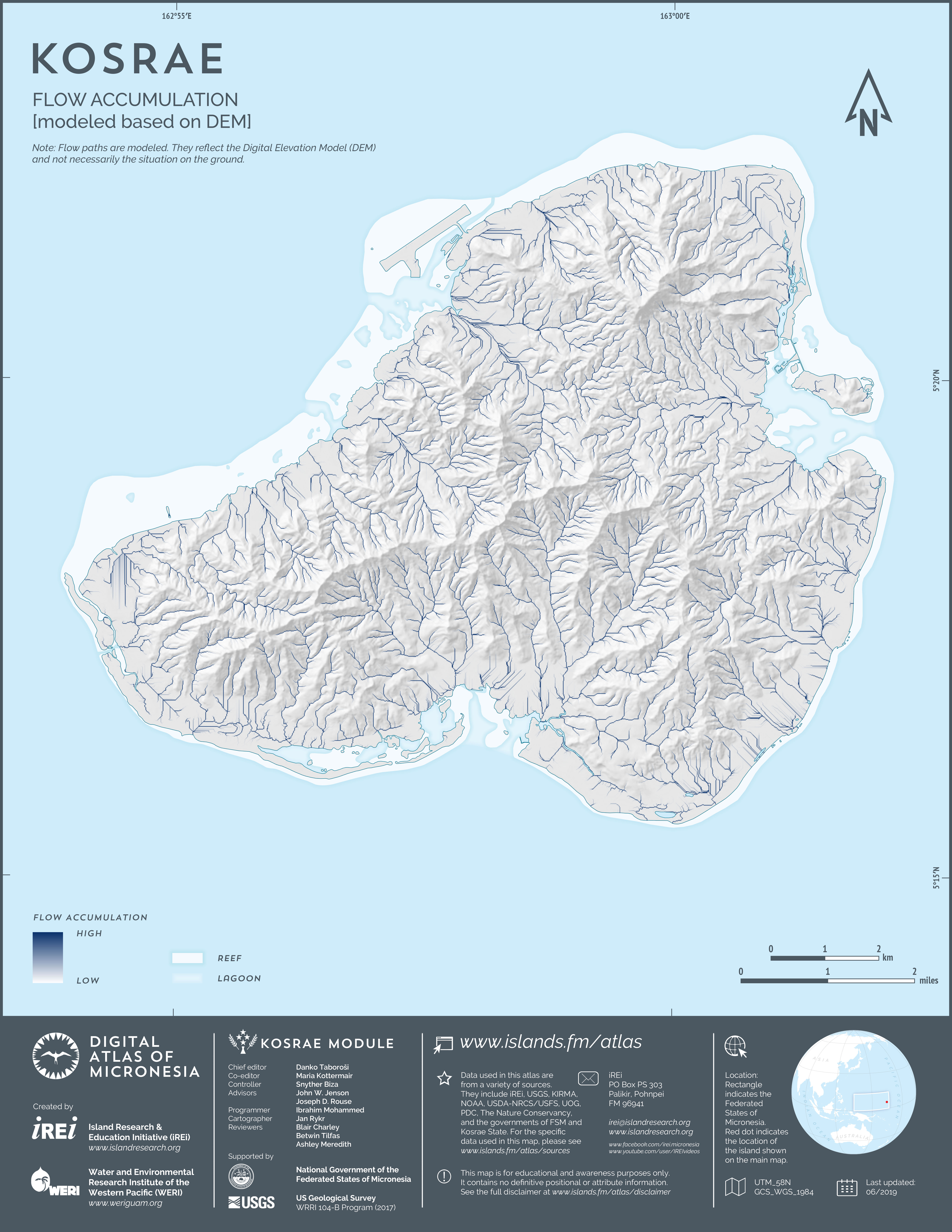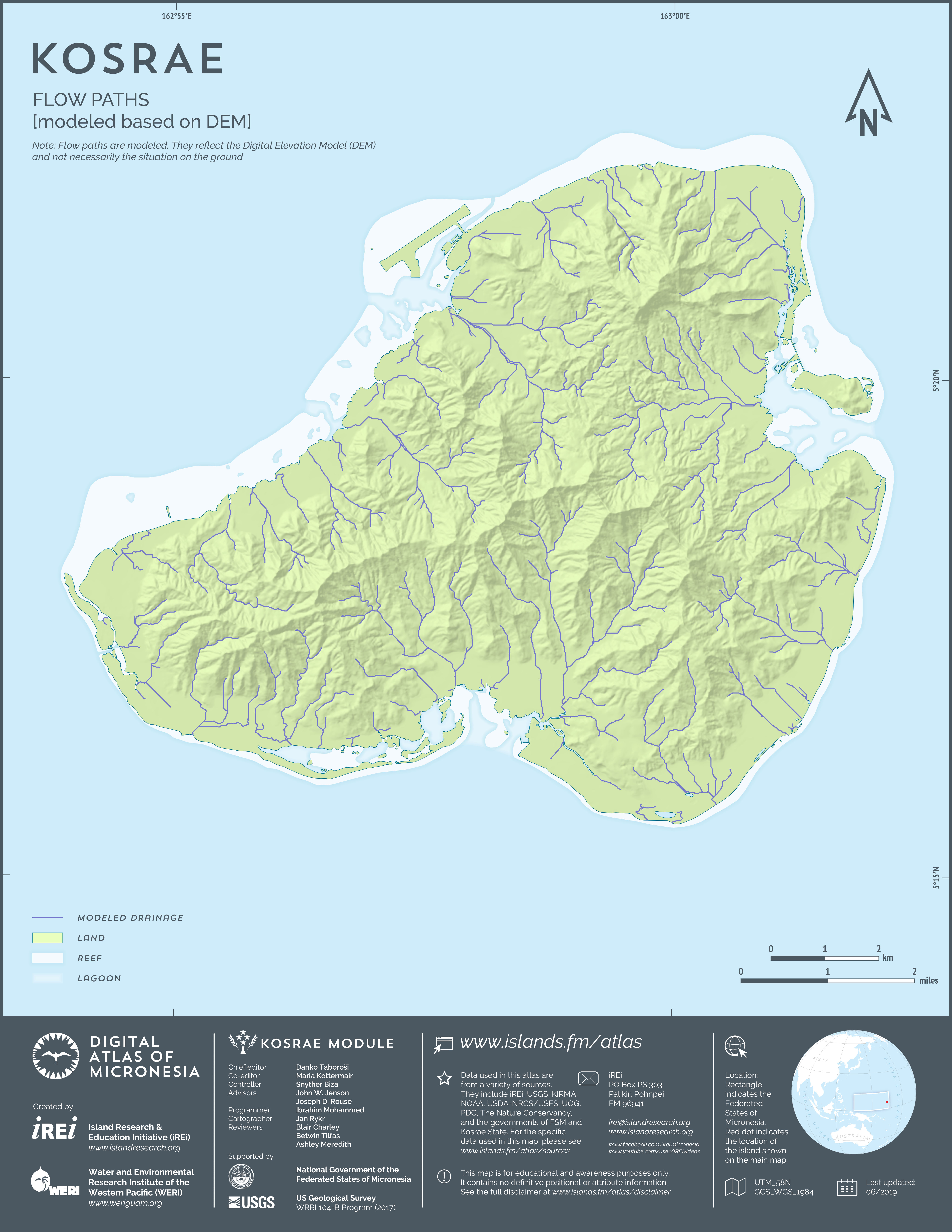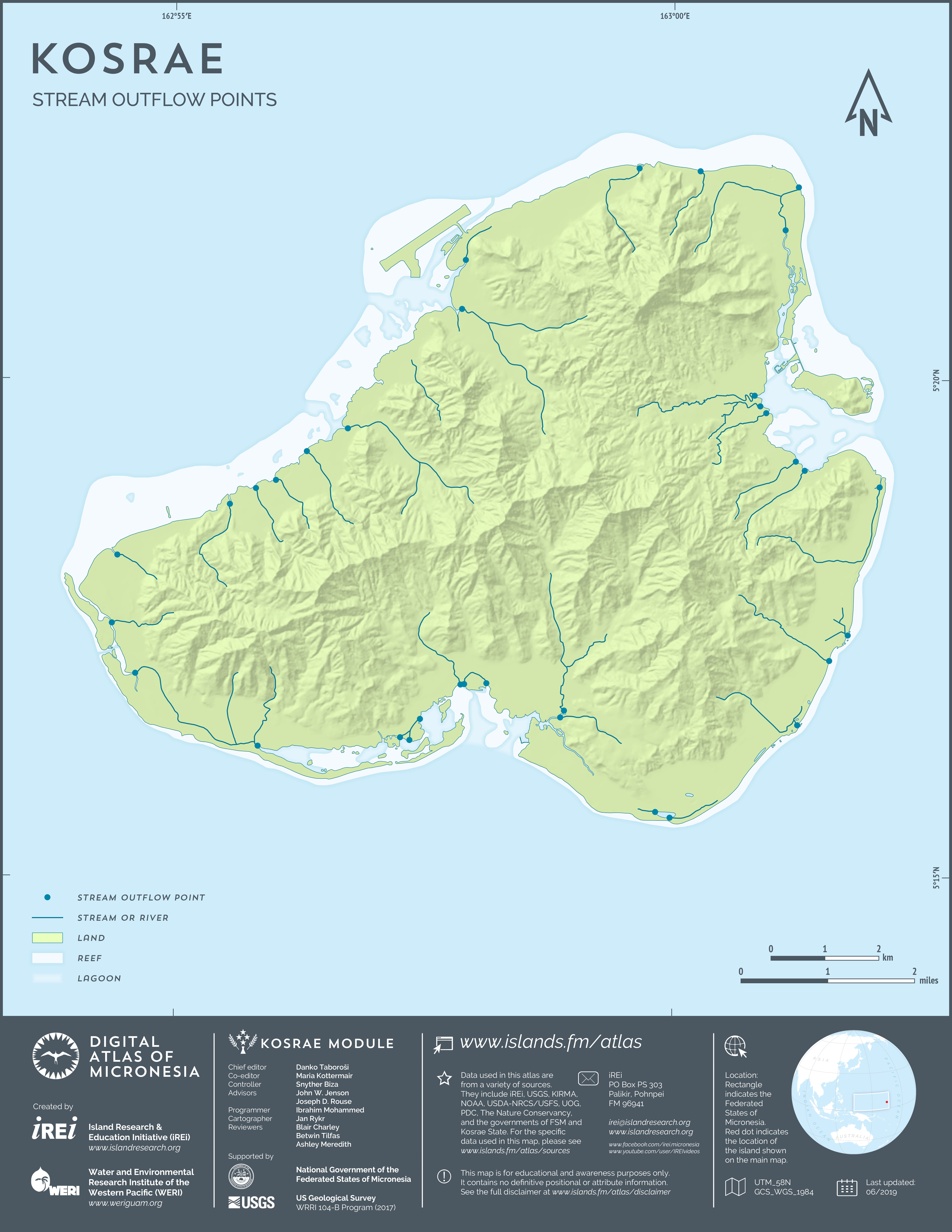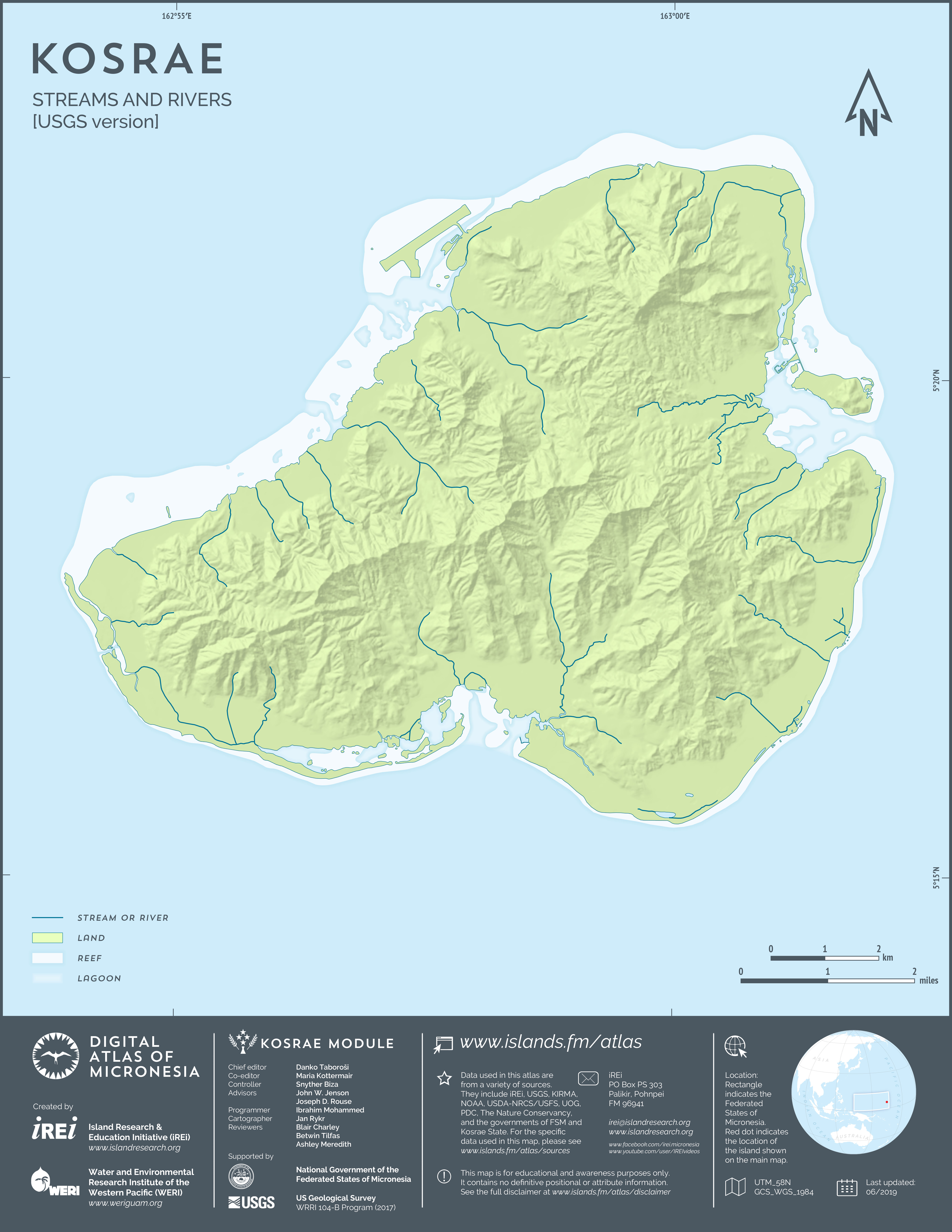 This map shows the rivers and streams on Kosrae as represented on the U.S. Geological Survey (USGS) 1:25,000-scale topographic maps (2001). The dataset was extracted from the Digital Line Graphs (DLGs) from USGS and names from the Geographic Names Information System (GNIS) by Island Research & Education Initiative (iREi) (2019) and slightly modified to match the updated shoreline.