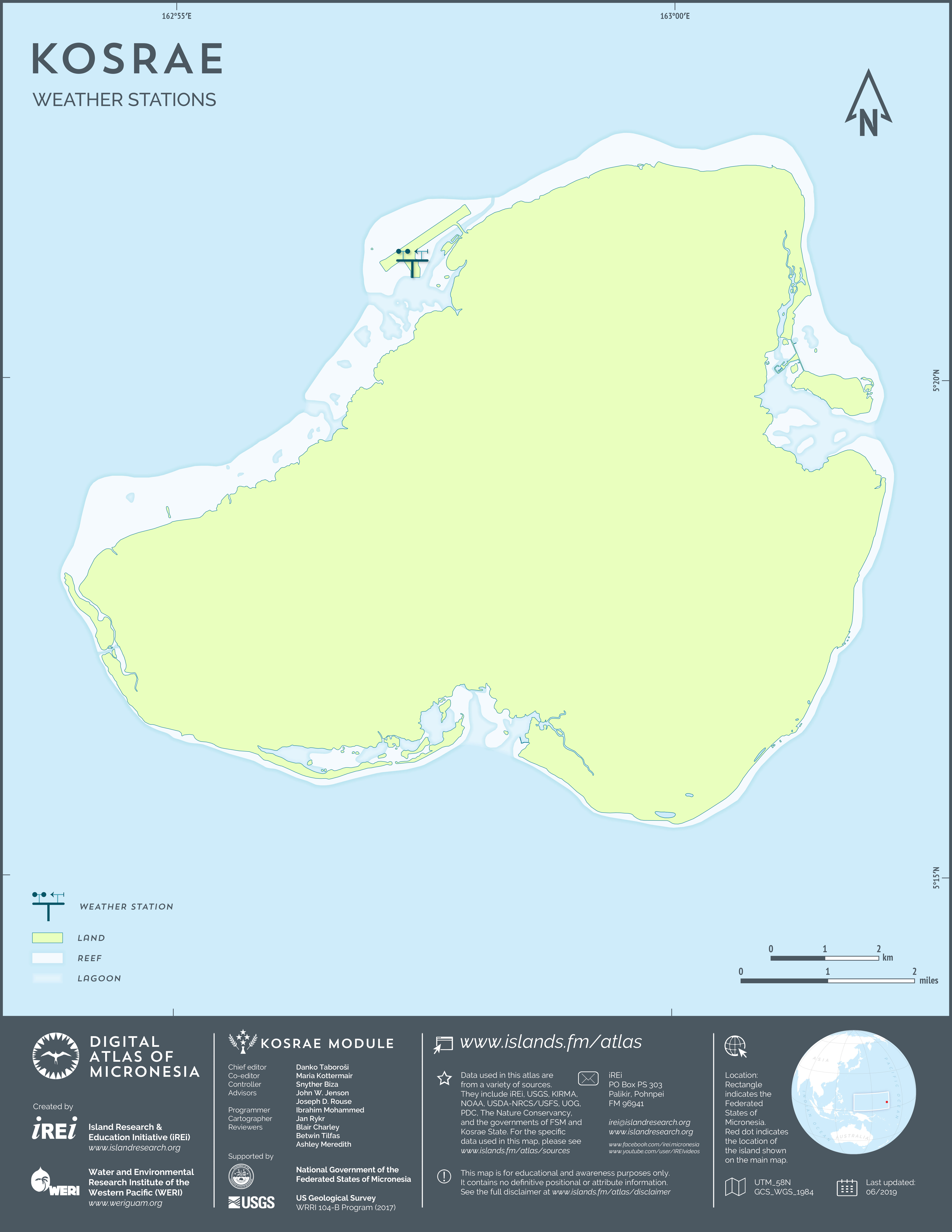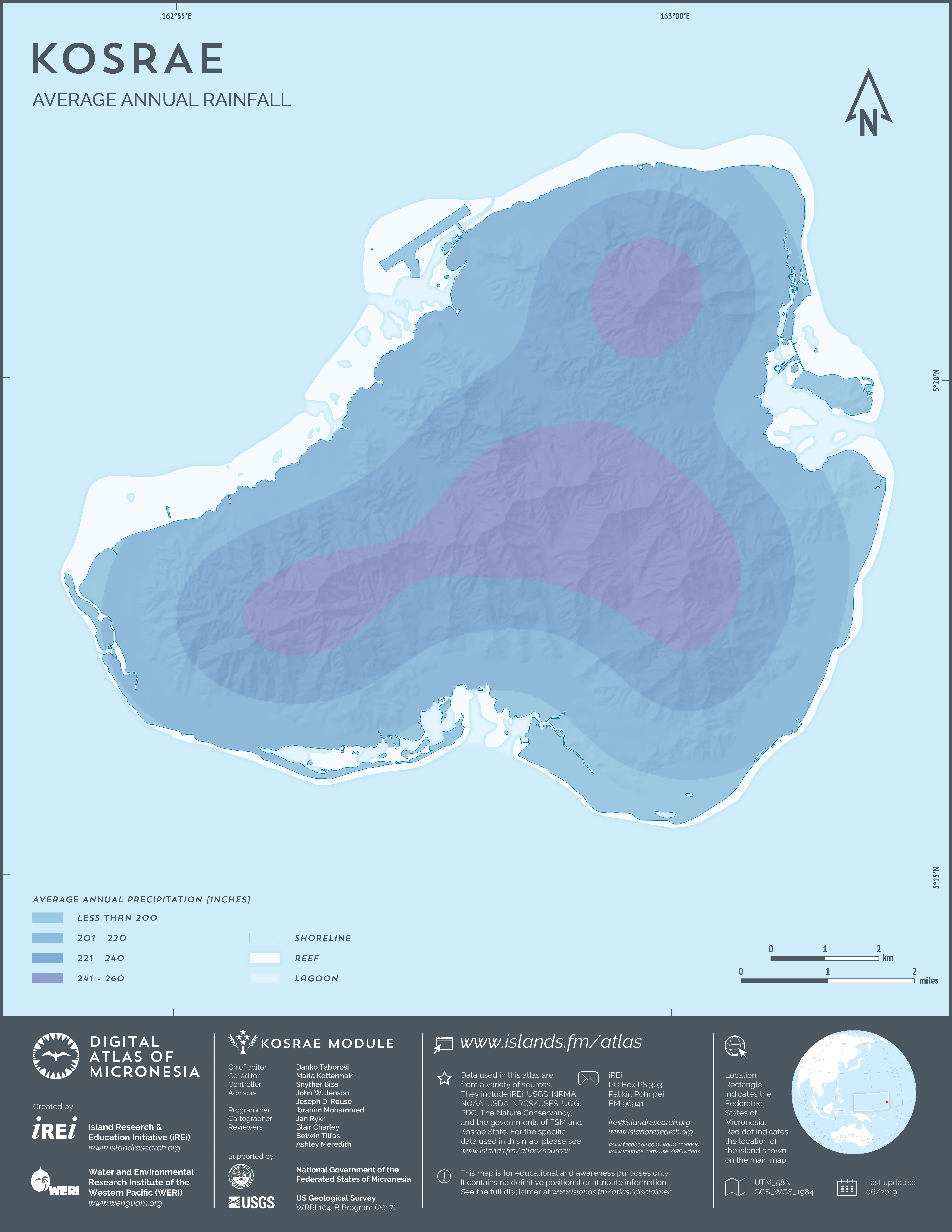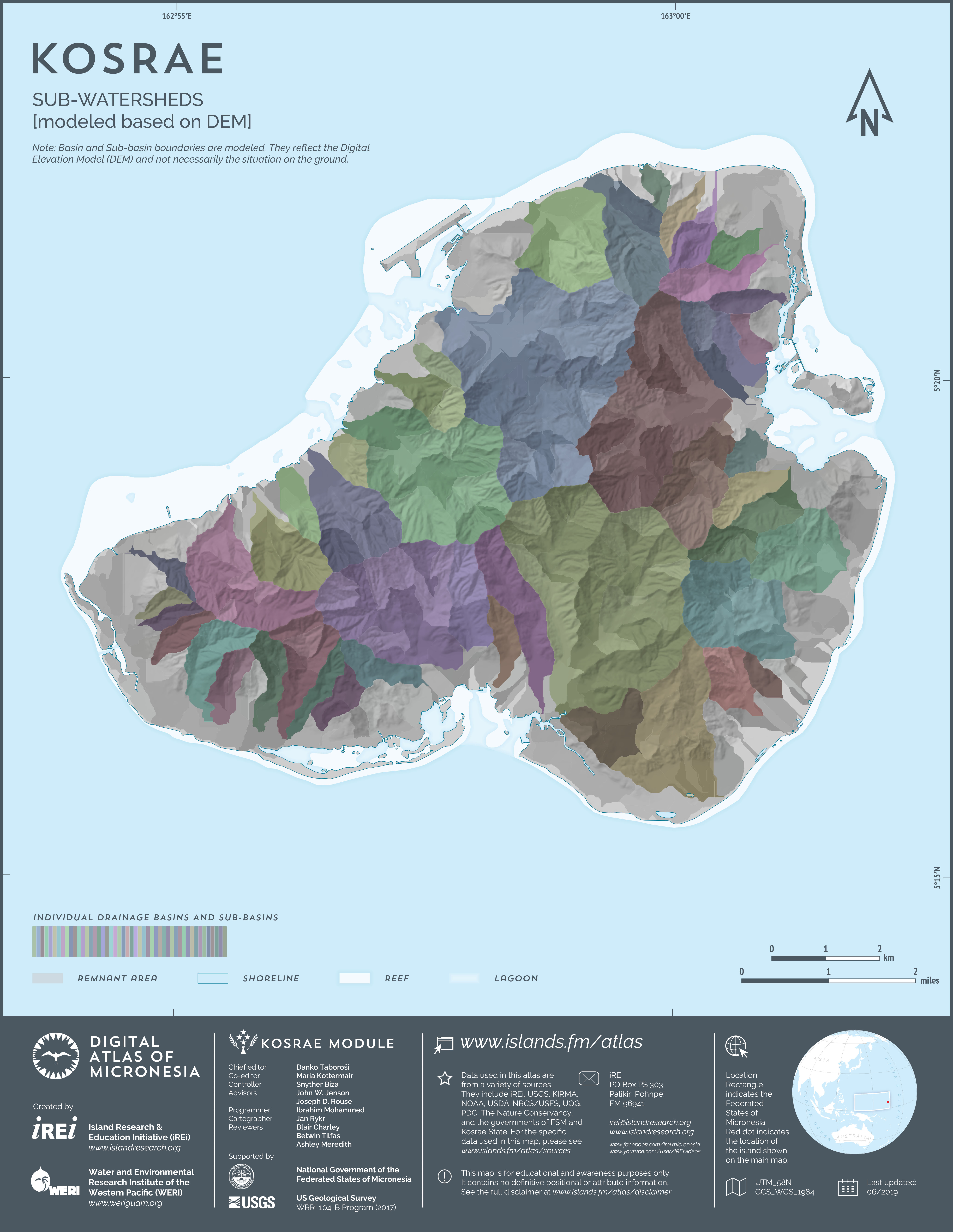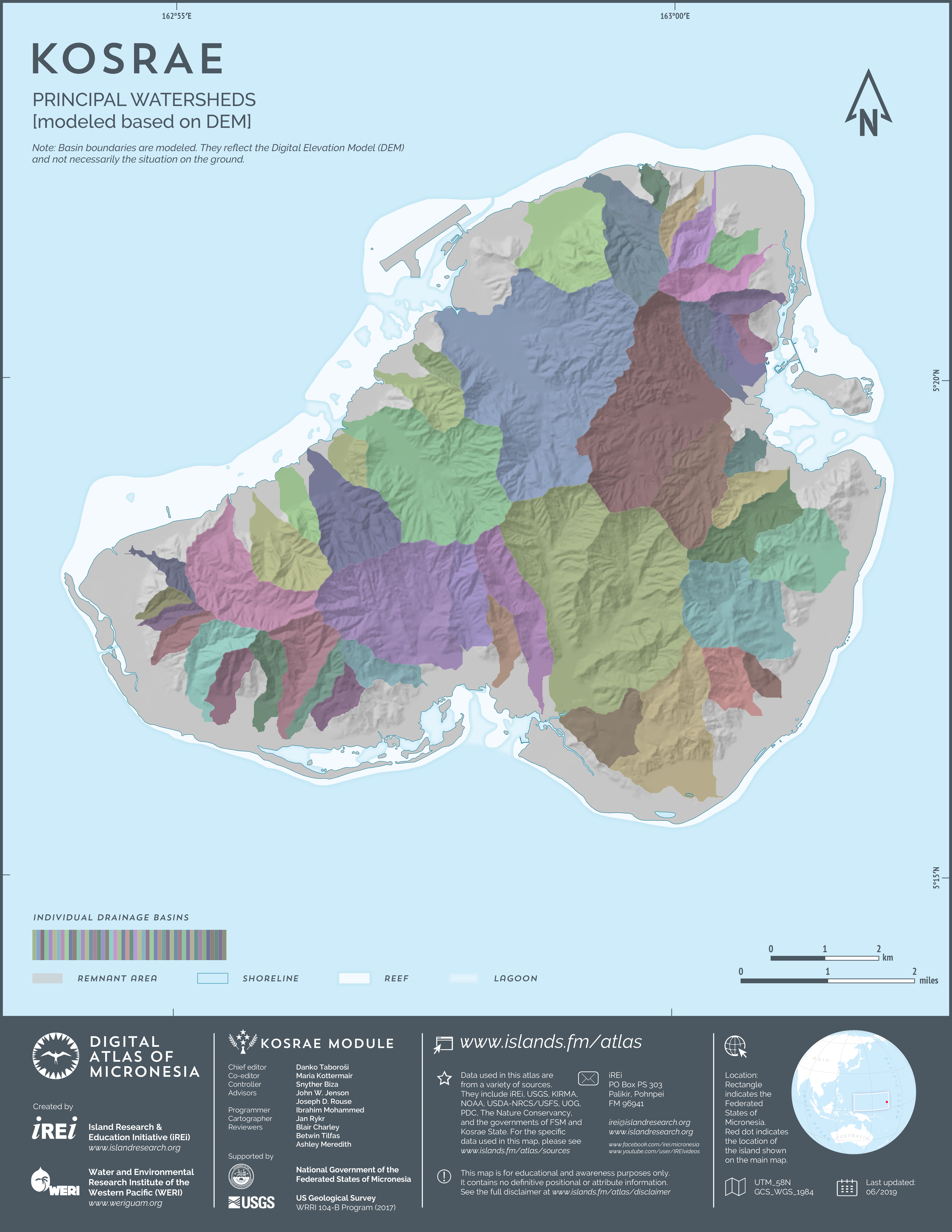 This map shows the rivers and streams on Kosrae as represented on the U.S. Geological Survey (USGS) 1:25,000-scale topographic maps (2001). The dataset was extracted from the Digital Line Graphs (DLGs) from USGS and names from the Geographic Names Information System (GNIS) by Island Research & Education Initiative (iREi) (2019) and slightly modified to match the updated shoreline.