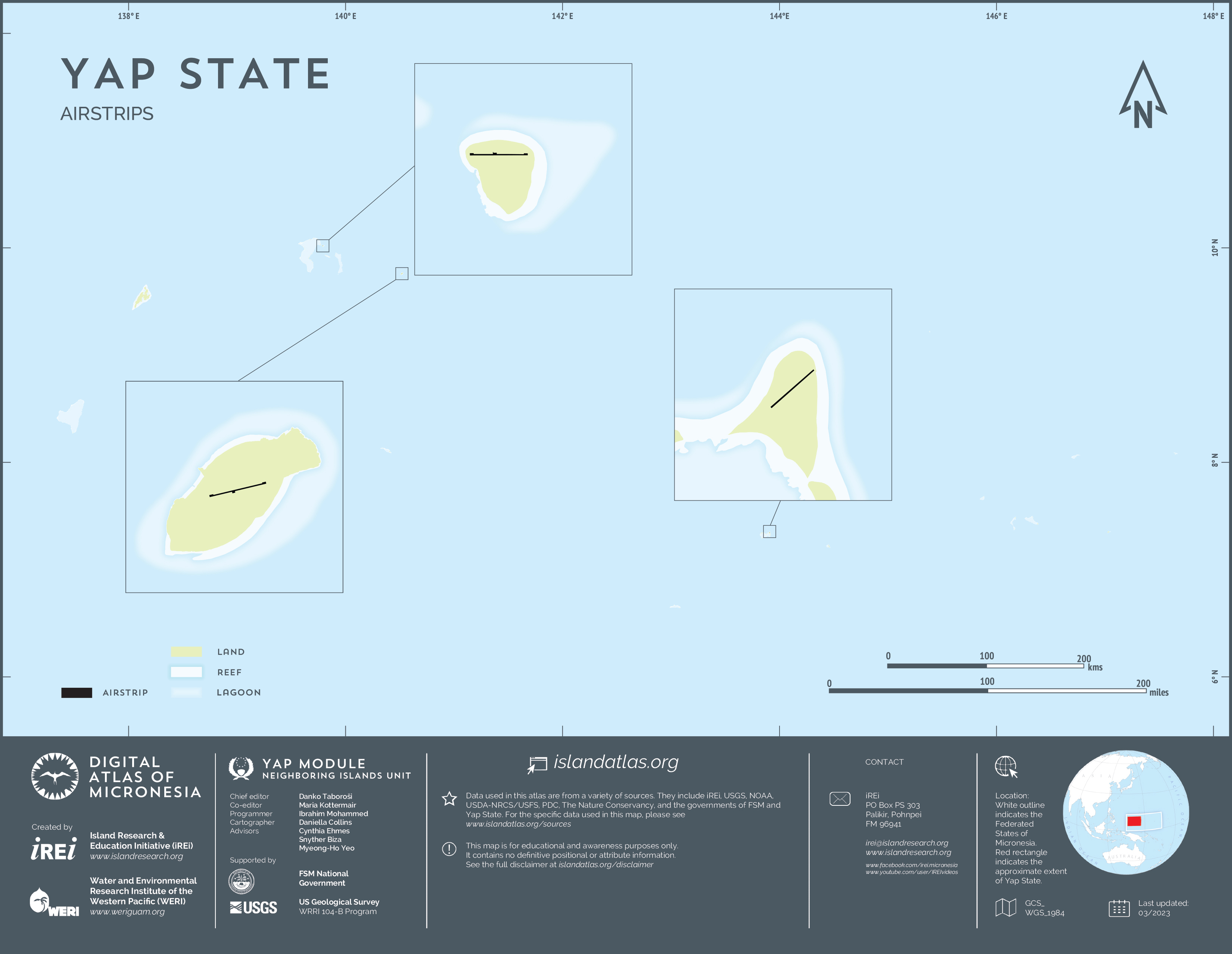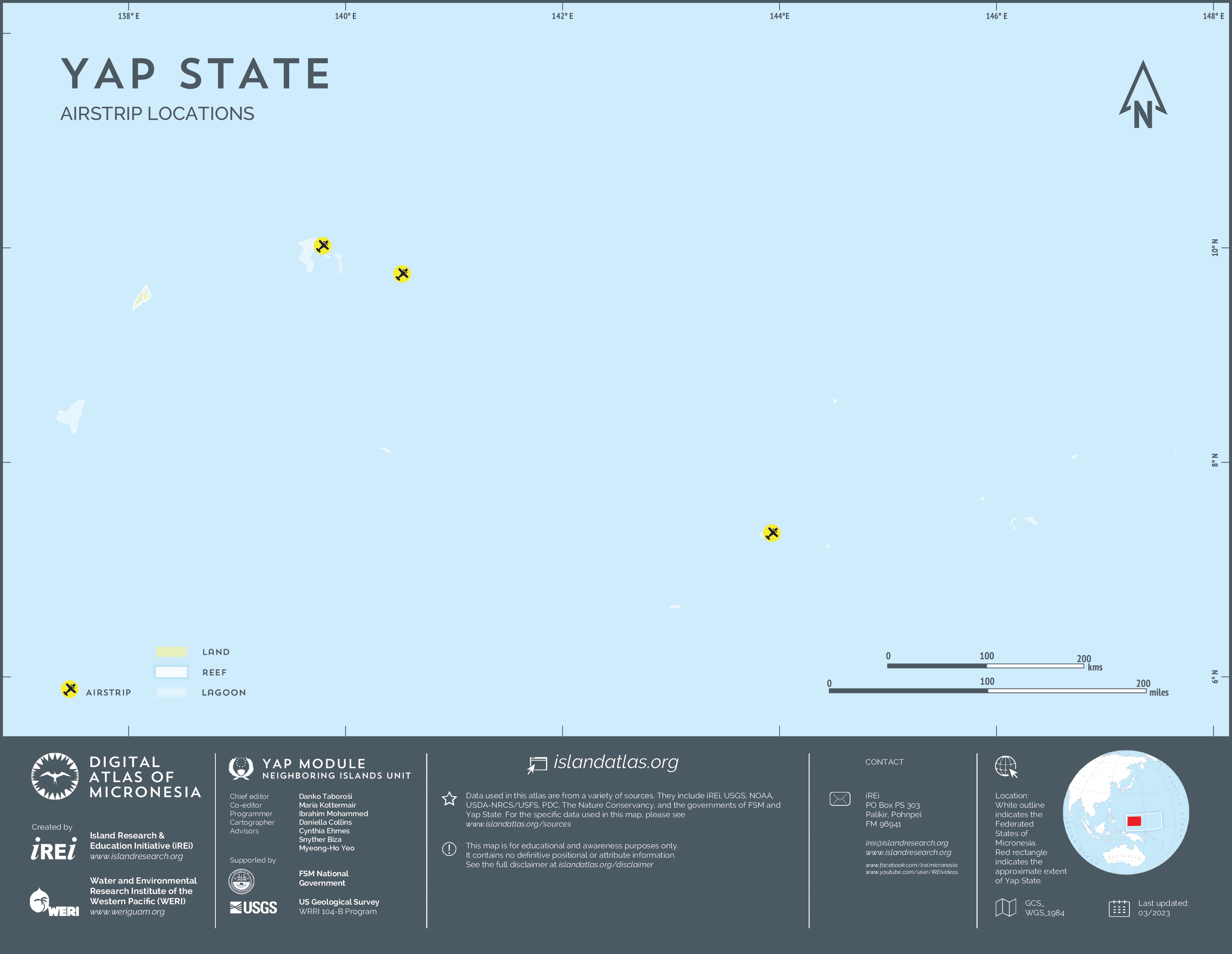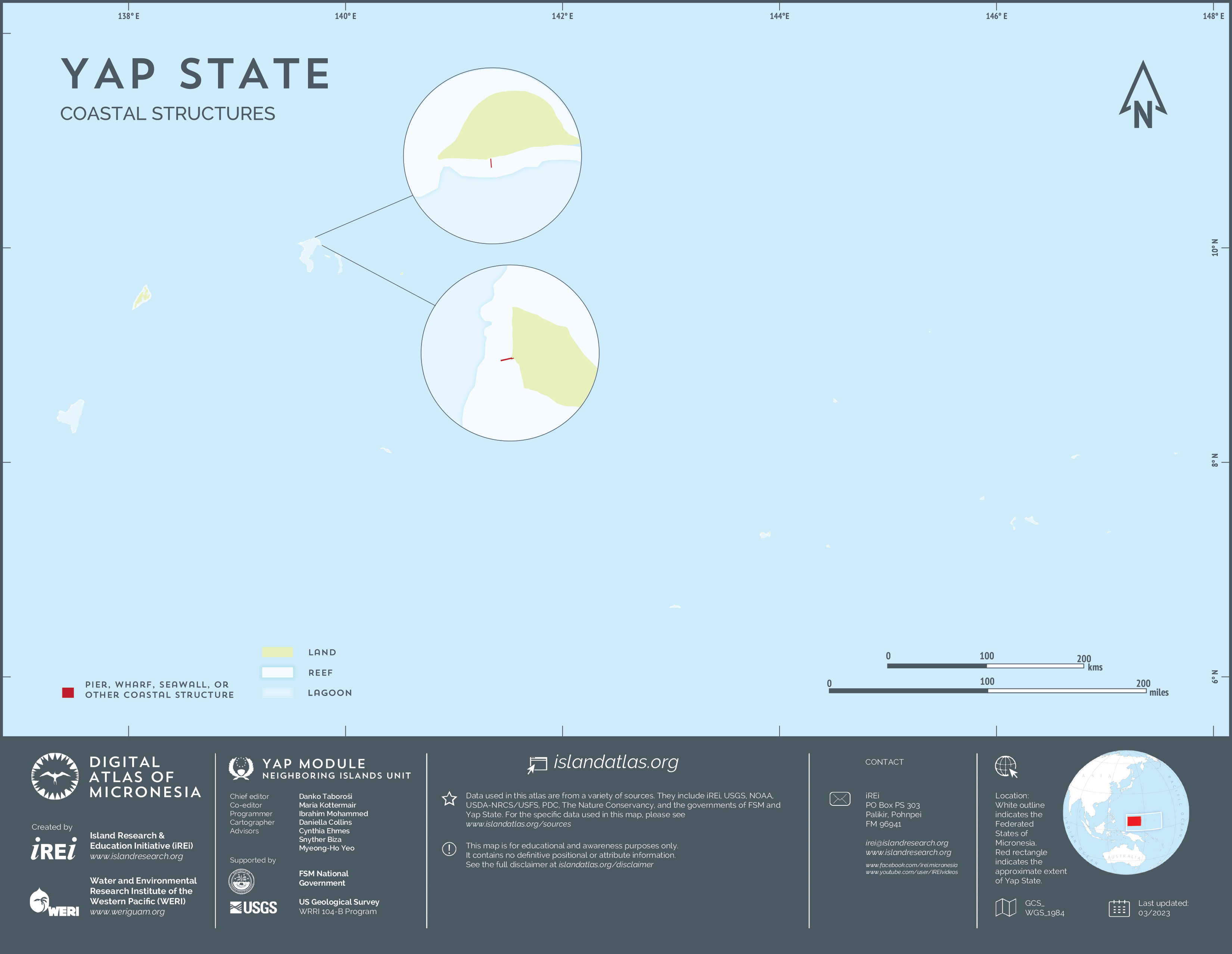 This map shows the footprints of all houses, buildings, and other human-made structures in the Neighboring Islands of Yap. The dataset was developed by Island Research & Education Initiative (iREi) (2015) through manually digitizing 2013-14 WorldView-2 satellite imagery from Maxar, formerly DigitalGlobe, provided by U.S. Department of Agriculture (USDA) – Natural Resources Conservation Service (NRCS). The features were classified into the following basic categories: churches, community houses, dispensaries, gravesites, piers, schools, water storage, and others. It was created as part of the “Geospatial Information Development and Application to Support Effective Decision Making in the Federated States of Micronesia” project funded through the NOAA Sea Grant Coastal Storms Program (2014).